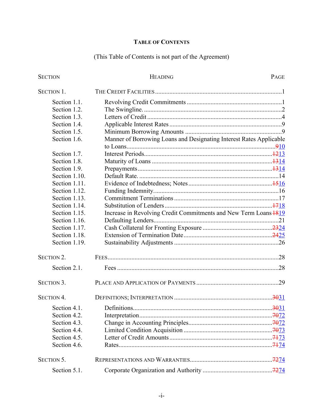 -i- TABLE OF CONTENTS (This Table of Contents is not part of the Agreement) SECTION HEADING PAGE SECTION 1. THE CREDIT FACILITIES ................................................................................1 Section 1.1. Revolving Credit Commitments ............................................................1 Section 1.2. The Swingline. .......................................................................................2 Section 1.3. Letters of Credit .....................................................................................4 Section 1.4. Applicable Interest Rates .......................................................................9 Section 1.5. Minimum Borrowing Amounts .............................................................9 Section 1.6. Manner of Borrowing Loans and Designating Interest Rates Applicable to Loans..............................................................................................910 Section 1.7. Interest Periods.................................................................................1213 Section 1.8. Maturity of Loans ............................................................................1314 Section 1.9. Prepayments.....................................................................................1314 Section 1.10. Default Rate. ........................................................................................14 Section 1.11. Evidence of Indebtedness; Notes .....................................................1516 Section 1.12. Funding Indemnity...............................................................................16 Section 1.13. Commitment Terminations ..................................................................17 Section 1.14. Substitution of Lenders ....................................................................1718 Section 1.15. Increase in Revolving Credit Commitments and New Term Loans1819 Section 1.16. Defaulting Lenders...............................................................................21 Section 1.17. Cash Collateral for Fronting Exposure ............................................2324 Section 1.18. Extension of Termination Date........................................................2425 Section 1.19. Sustainability Adjustments ..................................................................26 SECTION 2. FEES............................................................................................................28 Section 2.1. Fees ......................................................................................................28 SECTION 3. PLACE AND APPLICATION OF PAYMENTS ....................................................29 SECTION 4. DEFINITIONS; INTERPRETATION ..............................................................3031 Section 4.1. Definitions........................................................................................3031 Section 4.2. Interpretation....................................................................................7072 Section 4.3. Change in Accounting Principles.....................................................7072 Section 4.4. Limited Condition Acquisition ........................................................7073 Section 4.5. Letter of Credit Amounts .................................................................7173 Section 4.6. Rates.................................................................................................7174 SECTION 5. REPRESENTATIONS AND WARRANTIES....................................................7274 Section 5.1. Corporate Organization and Authority ............................................7274
