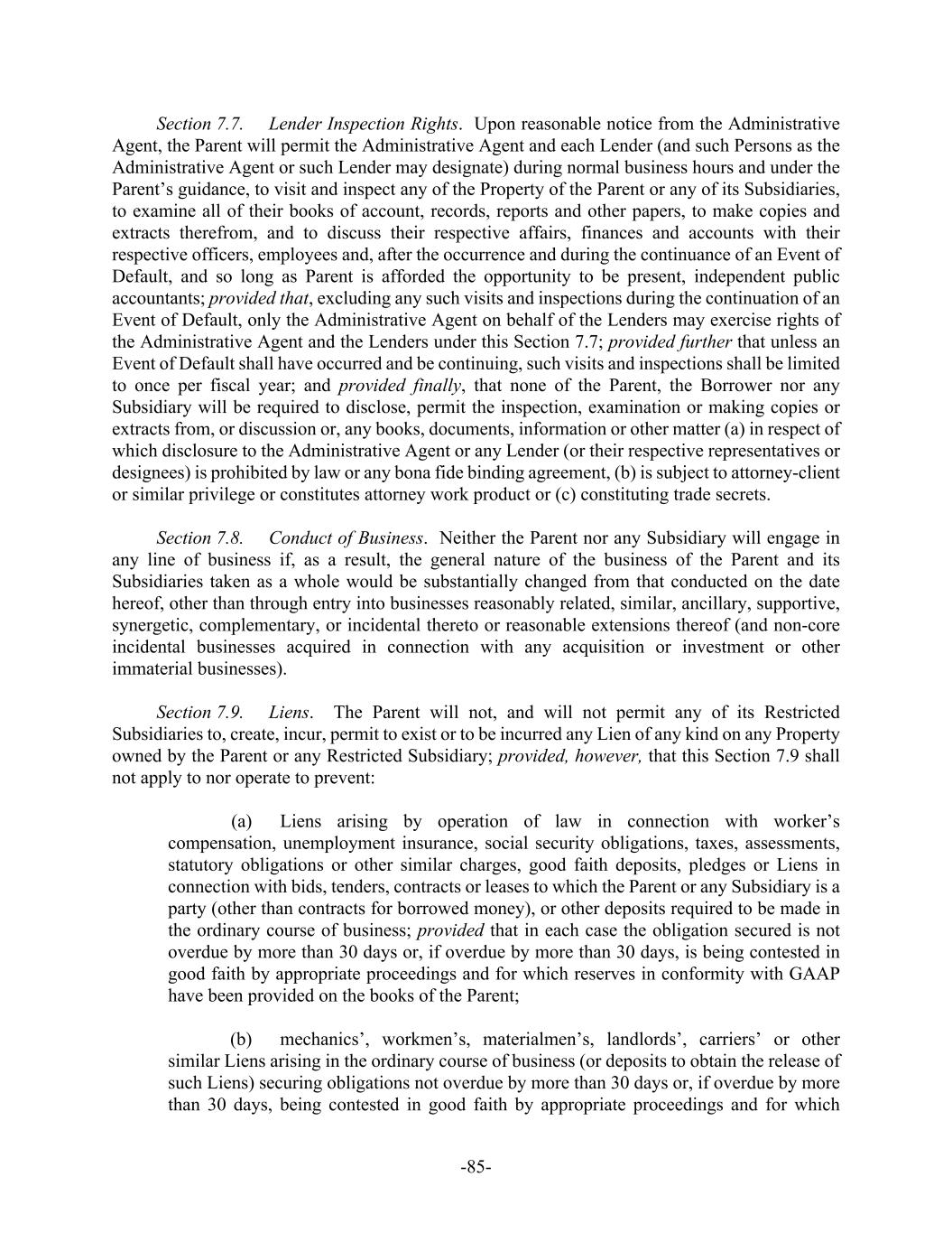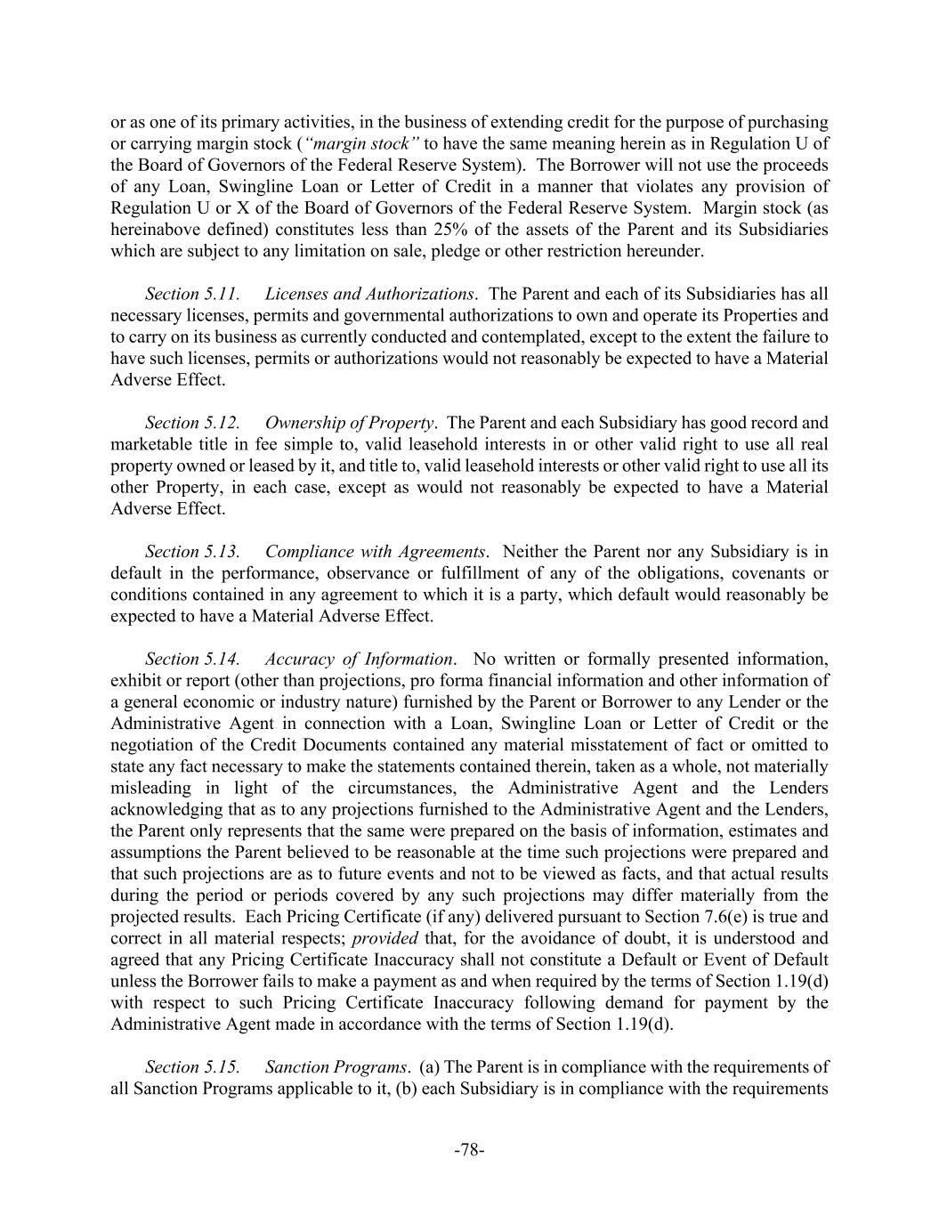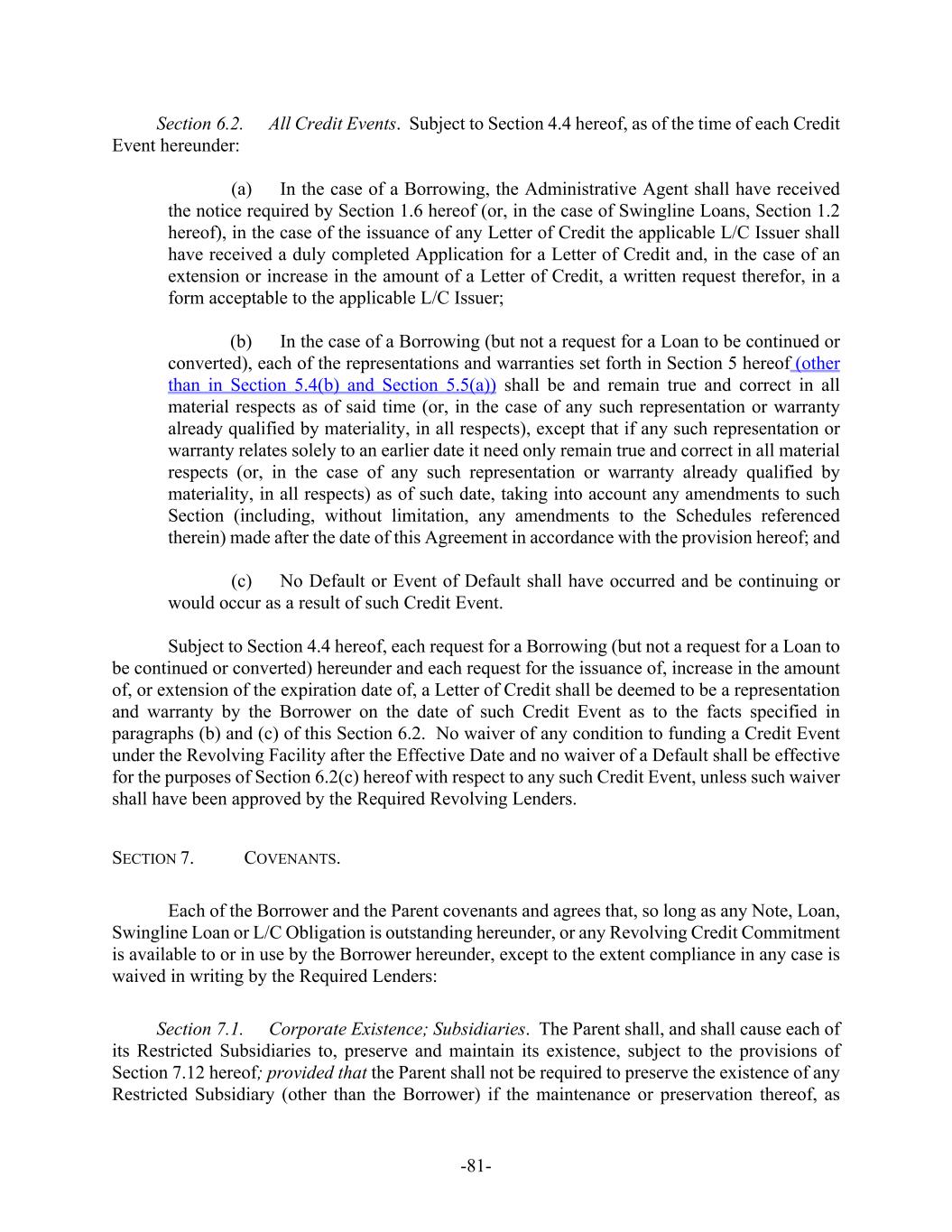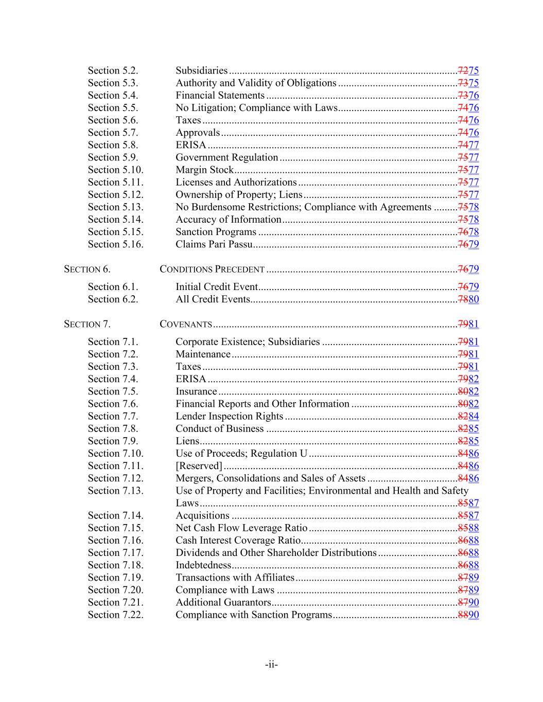 -ii- Section 5.2. Subsidiaries ......................................................................................7275 Section 5.3. Authority and Validity of Obligations .............................................7375 Section 5.4. Financial Statements ........................................................................7376 Section 5.5. No Litigation; Compliance with Laws.............................................7476 Section 5.6. Taxes ................................................................................................7476 Section 5.7. Approvals.........................................................................................7476 Section 5.8. ERISA..............................................................................................7477 Section 5.9. Government Regulation ...................................................................7577 Section 5.10. Margin Stock....................................................................................7577 Section 5.11. Licenses and Authorizations ............................................................7577 Section 5.12. Ownership of Property; Liens..........................................................7577 Section 5.13. No Burdensome Restrictions; Compliance with Agreements .........7578 Section 5.14. Accuracy of Information..................................................................7578 Section 5.15. Sanction Programs ...........................................................................7678 Section 5.16. Claims Pari Passu.............................................................................7679 SECTION 6. CONDITIONS PRECEDENT ........................................................................7679 Section 6.1. Initial Credit Event...........................................................................7679 Section 6.2. All Credit Events..............................................................................7880 SECTION 7. COVENANTS............................................................................................7981 Section 7.1. Corporate Existence; Subsidiaries ...................................................7981 Section 7.2. Maintenance.....................................................................................7981 Section 7.3. Taxes ................................................................................................7981 Section 7.4. ERISA..............................................................................................7982 Section 7.5. Insurance ..........................................................................................8082 Section 7.6. Financial Reports and Other Information ........................................8082 Section 7.7. Lender Inspection Rights .................................................................8284 Section 7.8. Conduct of Business ........................................................................8285 Section 7.9. Liens.................................................................................................8285 Section 7.10. Use of Proceeds; Regulation U........................................................8486 Section 7.11. [Reserved] ........................................................................................8486 Section 7.12. Mergers, Consolidations and Sales of Assets ..................................8486 Section 7.13. Use of Property and Facilities; Environmental and Health and Safety Laws.................................................................................................8587 Section 7.14. Acquisitions .....................................................................................8587 Section 7.15. Net Cash Flow Leverage Ratio ........................................................8588 Section 7.16. Cash Interest Coverage Ratio...........................................................8688 Section 7.17. Dividends and Other Shareholder Distributions ..............................8688 Section 7.18. Indebtedness.....................................................................................8688 Section 7.19. Transactions with Affiliates.............................................................8789 Section 7.20. Compliance with Laws ....................................................................8789 Section 7.21. Additional Guarantors......................................................................8790 Section 7.22. Compliance with Sanction Programs...............................................8890