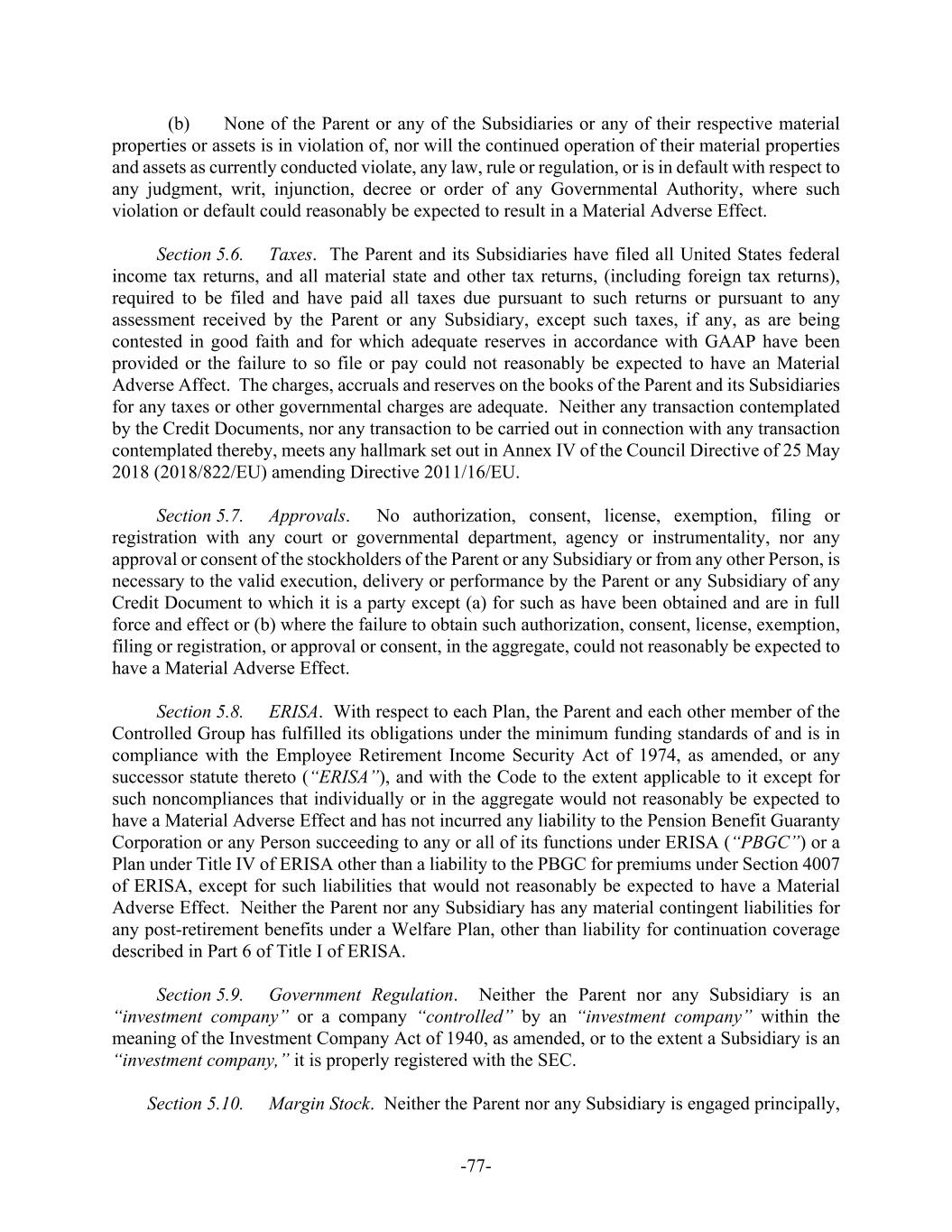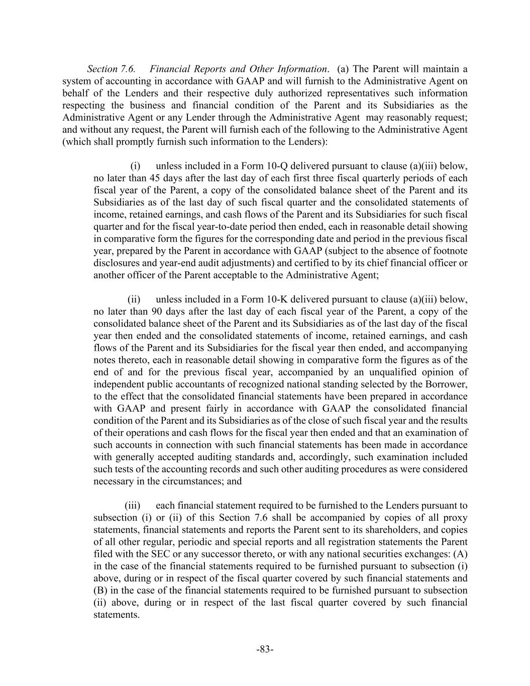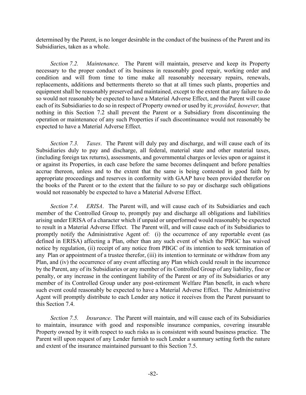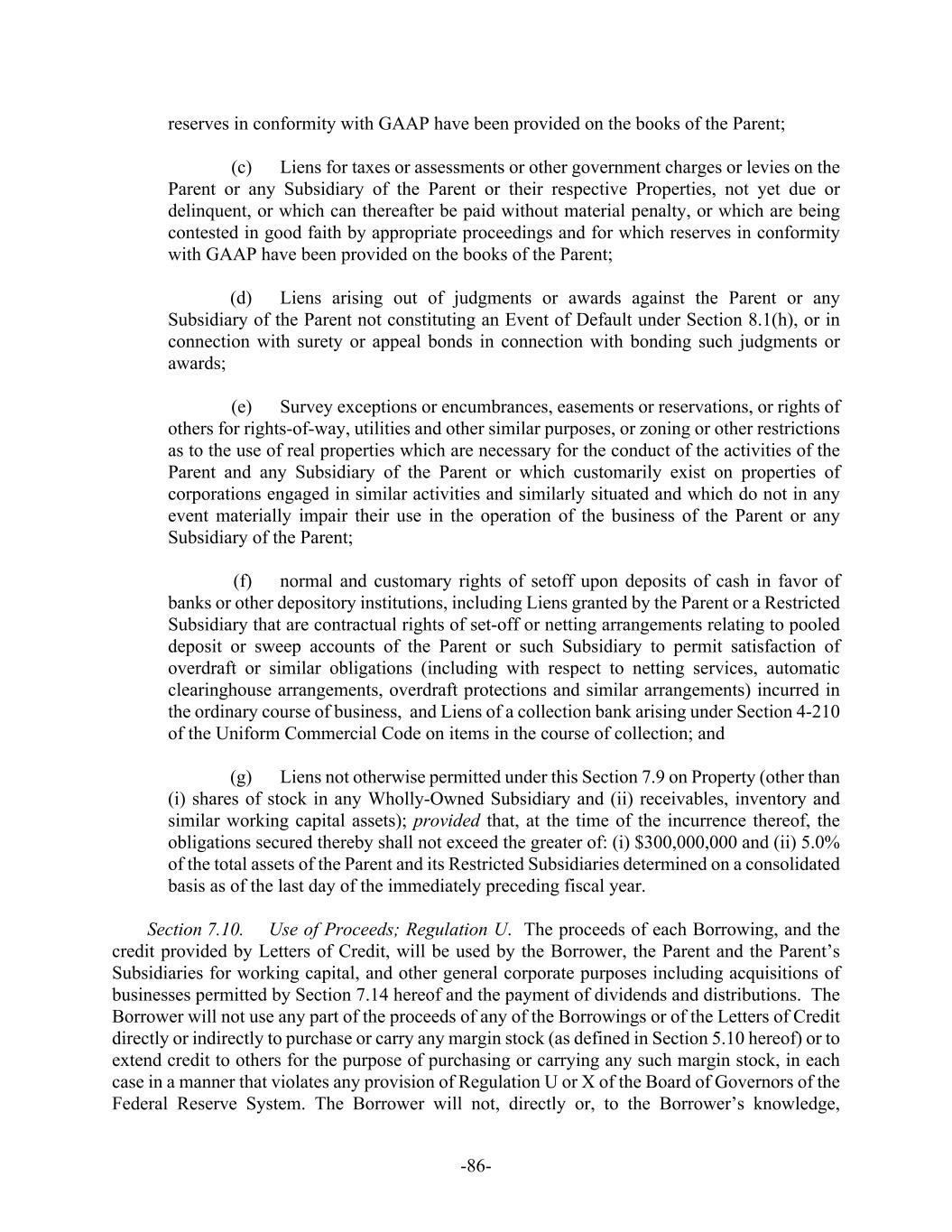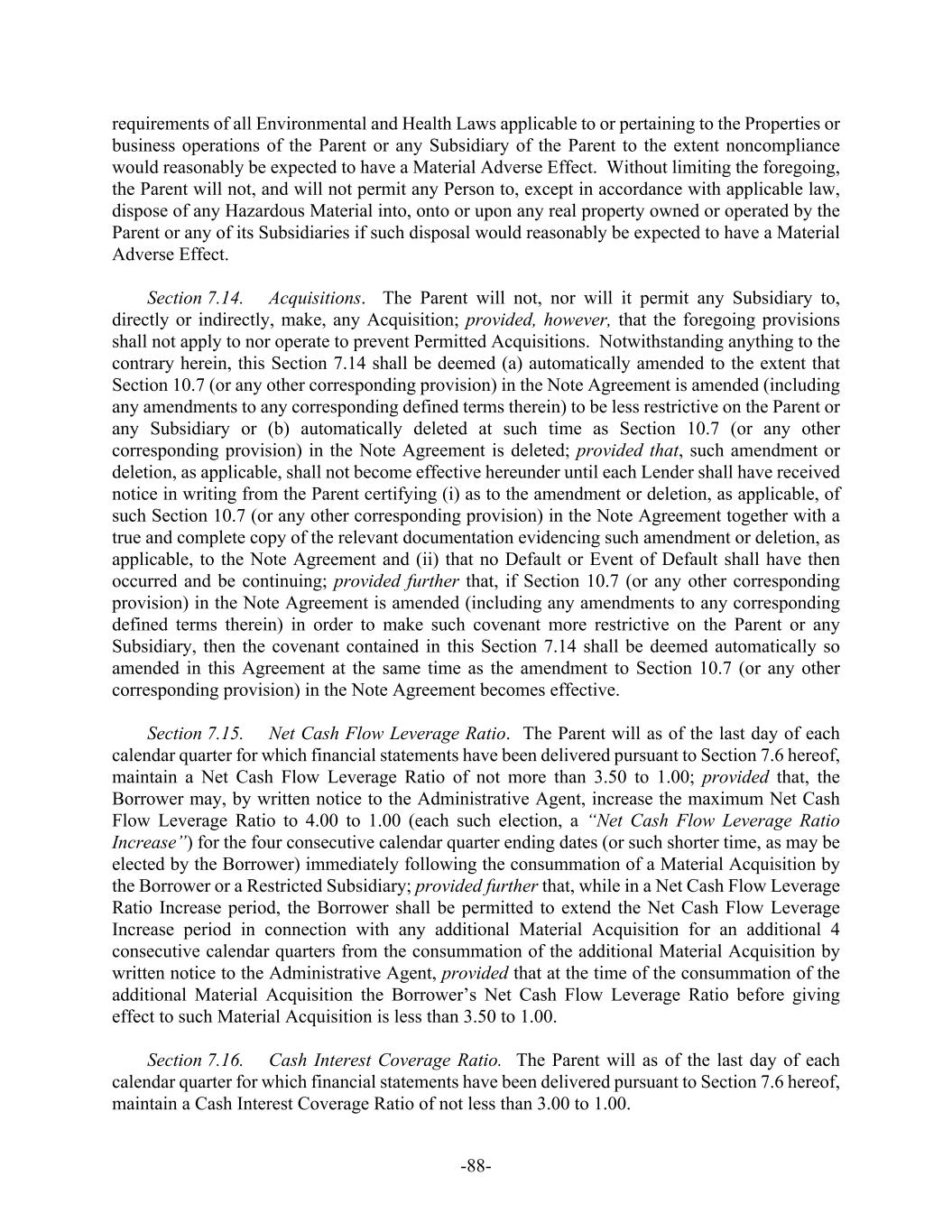 -ii- Section 5.2. Subsidiaries ......................................................................................7275 Section 5.3. Authority and Validity of Obligations .............................................7375 Section 5.4. Financial Statements ........................................................................7376 Section 5.5. No Litigation; Compliance with Laws.............................................7476 Section 5.6. Taxes ................................................................................................7476 Section 5.7. Approvals.........................................................................................7476 Section 5.8. ERISA..............................................................................................7477 Section 5.9. Government Regulation ...................................................................7577 Section 5.10. Margin Stock....................................................................................7577 Section 5.11. Licenses and Authorizations ............................................................7577 Section 5.12. Ownership of Property; Liens..........................................................7577 Section 5.13. No Burdensome Restrictions; Compliance with Agreements .........7578 Section 5.14. Accuracy of Information..................................................................7578 Section 5.15. Sanction Programs ...........................................................................7678 Section 5.16. Claims Pari Passu.............................................................................7679 SECTION 6. CONDITIONS PRECEDENT ........................................................................7679 Section 6.1. Initial Credit Event...........................................................................7679 Section 6.2. All Credit Events..............................................................................7880 SECTION 7. COVENANTS............................................................................................7981 Section 7.1. Corporate Existence; Subsidiaries ...................................................7981 Section 7.2. Maintenance.....................................................................................7981 Section 7.3. Taxes ................................................................................................7981 Section 7.4. ERISA..............................................................................................7982 Section 7.5. Insurance ..........................................................................................8082 Section 7.6. Financial Reports and Other Information ........................................8082 Section 7.7. Lender Inspection Rights .................................................................8284 Section 7.8. Conduct of Business ........................................................................8285 Section 7.9. Liens.................................................................................................8285 Section 7.10. Use of Proceeds; Regulation U........................................................8486 Section 7.11. [Reserved] ........................................................................................8486 Section 7.12. Mergers, Consolidations and Sales of Assets ..................................8486 Section 7.13. Use of Property and Facilities; Environmental and Health and Safety Laws.................................................................................................8587 Section 7.14. Acquisitions .....................................................................................8587 Section 7.15. Net Cash Flow Leverage Ratio ........................................................8588 Section 7.16. Cash Interest Coverage Ratio...........................................................8688 Section 7.17. Dividends and Other Shareholder Distributions ..............................8688 Section 7.18. Indebtedness.....................................................................................8688 Section 7.19. Transactions with Affiliates.............................................................8789 Section 7.20. Compliance with Laws ....................................................................8789 Section 7.21. Additional Guarantors......................................................................8790 Section 7.22. Compliance with Sanction Programs...............................................8890