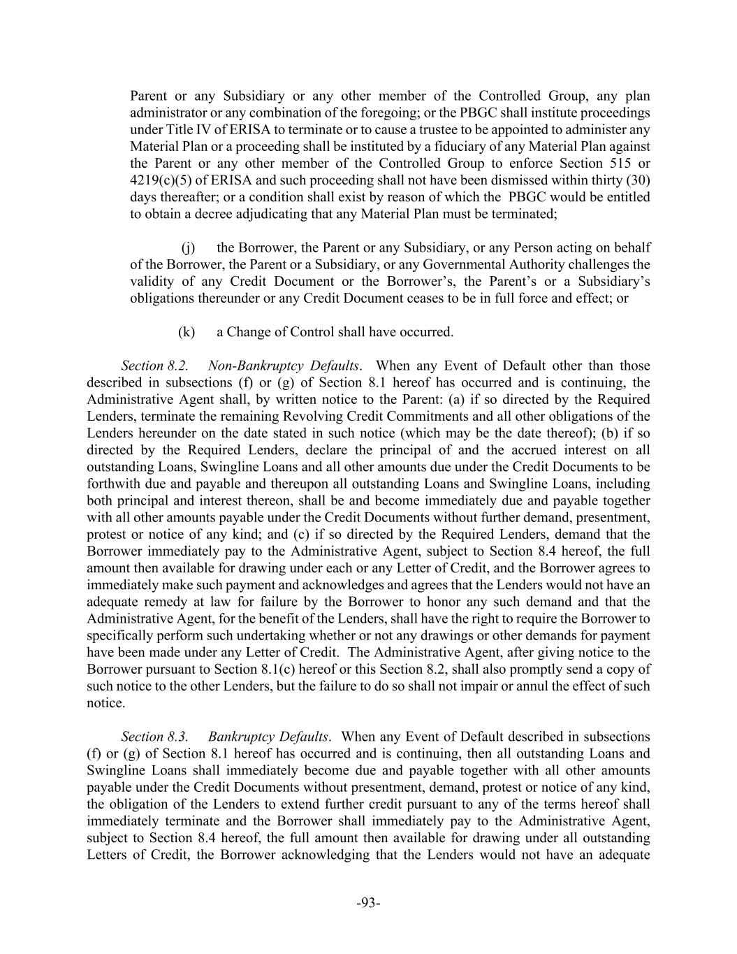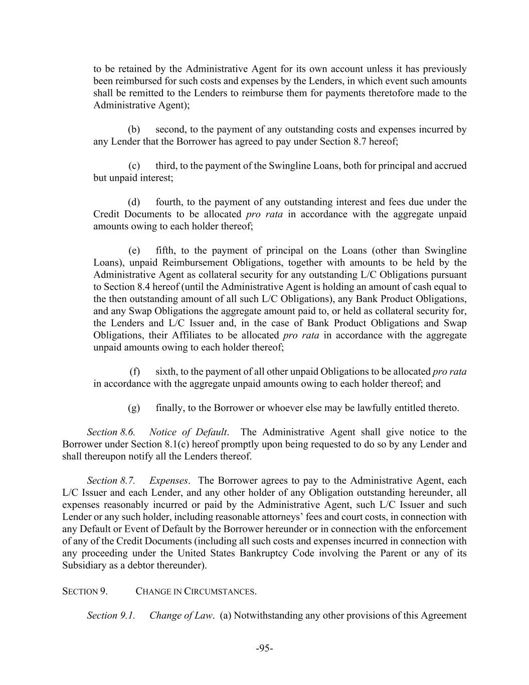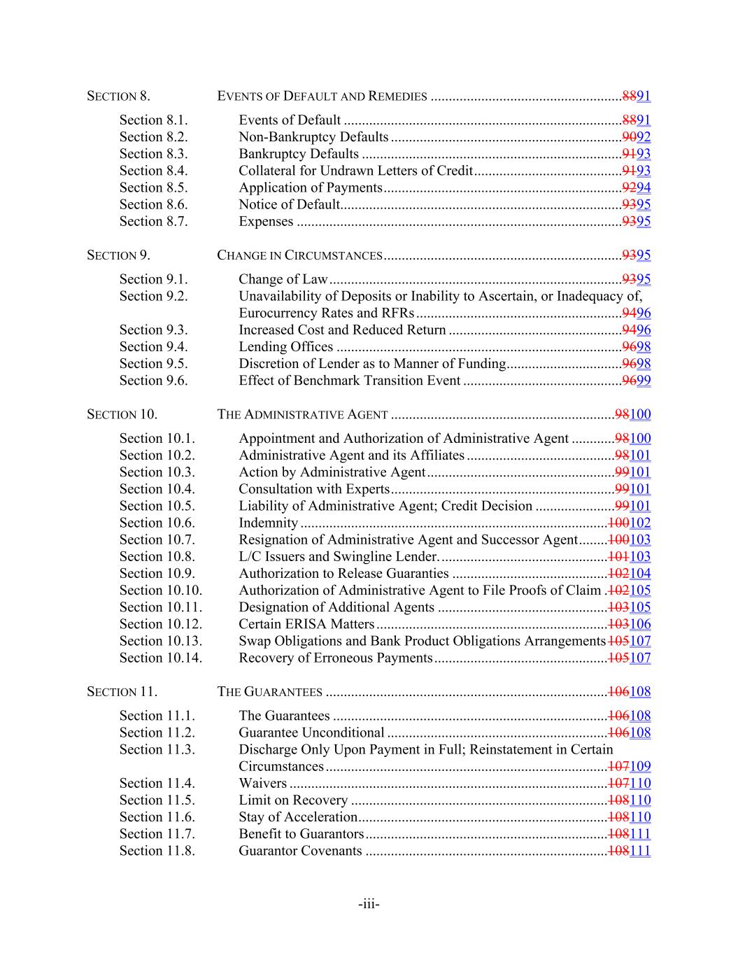 -iii- SECTION 8. EVENTS OF DEFAULT AND REMEDIES .....................................................8891 Section 8.1. Events of Default .............................................................................8891 Section 8.2. Non-Bankruptcy Defaults ................................................................9092 Section 8.3. Bankruptcy Defaults ........................................................................9193 Section 8.4. Collateral for Undrawn Letters of Credit.........................................9193 Section 8.5. Application of Payments..................................................................9294 Section 8.6. Notice of Default..............................................................................9395 Section 8.7. Expenses ..........................................................................................9395 SECTION 9. CHANGE IN CIRCUMSTANCES..................................................................9395 Section 9.1. Change of Law.................................................................................9395 Section 9.2. Unavailability of Deposits or Inability to Ascertain, or Inadequacy of, Eurocurrency Rates and RFRs .........................................................9496 Section 9.3. Increased Cost and Reduced Return ................................................9496 Section 9.4. Lending Offices ...............................................................................9698 Section 9.5. Discretion of Lender as to Manner of Funding................................9698 Section 9.6. Effect of Benchmark Transition Event ............................................9699 SECTION 10. THE ADMINISTRATIVE AGENT ..............................................................98100 Section 10.1. Appointment and Authorization of Administrative Agent ............98100 Section 10.2. Administrative Agent and its Affiliates .........................................98101 Section 10.3. Action by Administrative Agent....................................................99101 Section 10.4. Consultation with Experts..............................................................99101 Section 10.5. Liability of Administrative Agent; Credit Decision ......................99101 Section 10.6. Indemnity .....................................................................................100102 Section 10.7. Resignation of Administrative Agent and Successor Agent........100103 Section 10.8. L/C Issuers and Swingline Lender...............................................101103 Section 10.9. Authorization to Release Guaranties ...........................................102104 Section 10.10. Authorization of Administrative Agent to File Proofs of Claim .102105 Section 10.11. Designation of Additional Agents ...............................................103105 Section 10.12. Certain ERISA Matters ................................................................103106 Section 10.13. Swap Obligations and Bank Product Obligations Arrangements105107 Section 10.14. Recovery of Erroneous Payments................................................105107 SECTION 11. THE GUARANTEES ..............................................................................106108 Section 11.1. The Guarantees ............................................................................106108 Section 11.2. Guarantee Unconditional .............................................................106108 Section 11.3. Discharge Only Upon Payment in Full; Reinstatement in Certain Circumstances ..............................................................................107109 Section 11.4. Waivers ........................................................................................107110 Section 11.5. Limit on Recovery .......................................................................108110 Section 11.6. Stay of Acceleration.....................................................................108110 Section 11.7. Benefit to Guarantors...................................................................108111 Section 11.8. Guarantor Covenants ...................................................................108111