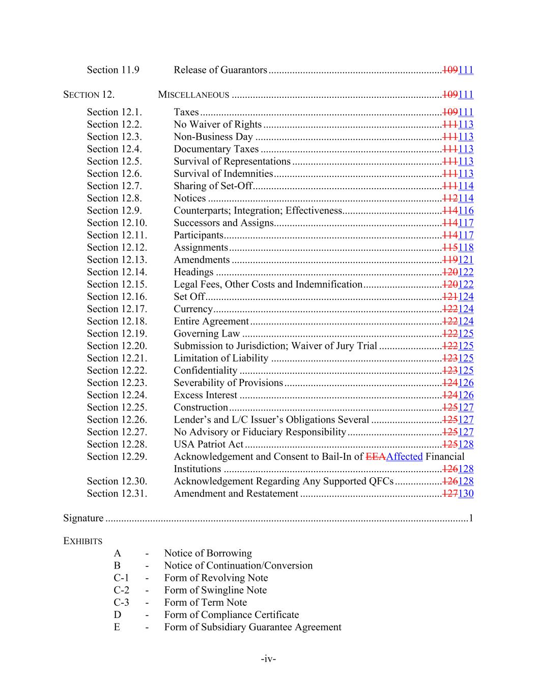 -iv- Section 11.9 Release of Guarantors ..................................................................109111 SECTION 12. MISCELLANEOUS ................................................................................109111 Section 12.1. Taxes ............................................................................................109111 Section 12.2. No Waiver of Rights ....................................................................111113 Section 12.3. Non-Business Day .......................................................................111113 Section 12.4. Documentary Taxes .....................................................................111113 Section 12.5. Survival of Representations .........................................................111113 Section 12.6. Survival of Indemnities................................................................111113 Section 12.7. Sharing of Set-Off........................................................................111114 Section 12.8. Notices .........................................................................................112114 Section 12.9. Counterparts; Integration; Effectiveness......................................114116 Section 12.10. Successors and Assigns................................................................114117 Section 12.11. Participants...................................................................................114117 Section 12.12. Assignments.................................................................................115118 Section 12.13. Amendments ................................................................................119121 Section 12.14. Headings ......................................................................................120122 Section 12.15. Legal Fees, Other Costs and Indemnification..............................120122 Section 12.16. Set Off..........................................................................................121124 Section 12.17. Currency.......................................................................................122124 Section 12.18. Entire Agreement .........................................................................122124 Section 12.19. Governing Law ............................................................................122125 Section 12.20. Submission to Jurisdiction; Waiver of Jury Trial ........................122125 Section 12.21. Limitation of Liability .................................................................123125 Section 12.22. Confidentiality .............................................................................123125 Section 12.23. Severability of Provisions ............................................................124126 Section 12.24. Excess Interest .............................................................................124126 Section 12.25. Construction.................................................................................125127 Section 12.26. Lender’s and L/C Issuer’s Obligations Several ...........................125127 Section 12.27. No Advisory or Fiduciary Responsibility ....................................125127 Section 12.28. USA Patriot Act ...........................................................................125128 Section 12.29. Acknowledgement and Consent to Bail-In of EEAAffected Financial Institutions ...................................................................................126128 Section 12.30. Acknowledgement Regarding Any Supported QFCs ..................126128 Section 12.31. Amendment and Restatement ......................................................127130 Signature ..........................................................................................................................................1 EXHIBITS A - Notice of Borrowing B - Notice of Continuation/Conversion C-1 - Form of Revolving Note C-2 - Form of Swingline Note C-3 - Form of Term Note D - Form of Compliance Certificate E - Form of Subsidiary Guarantee Agreement