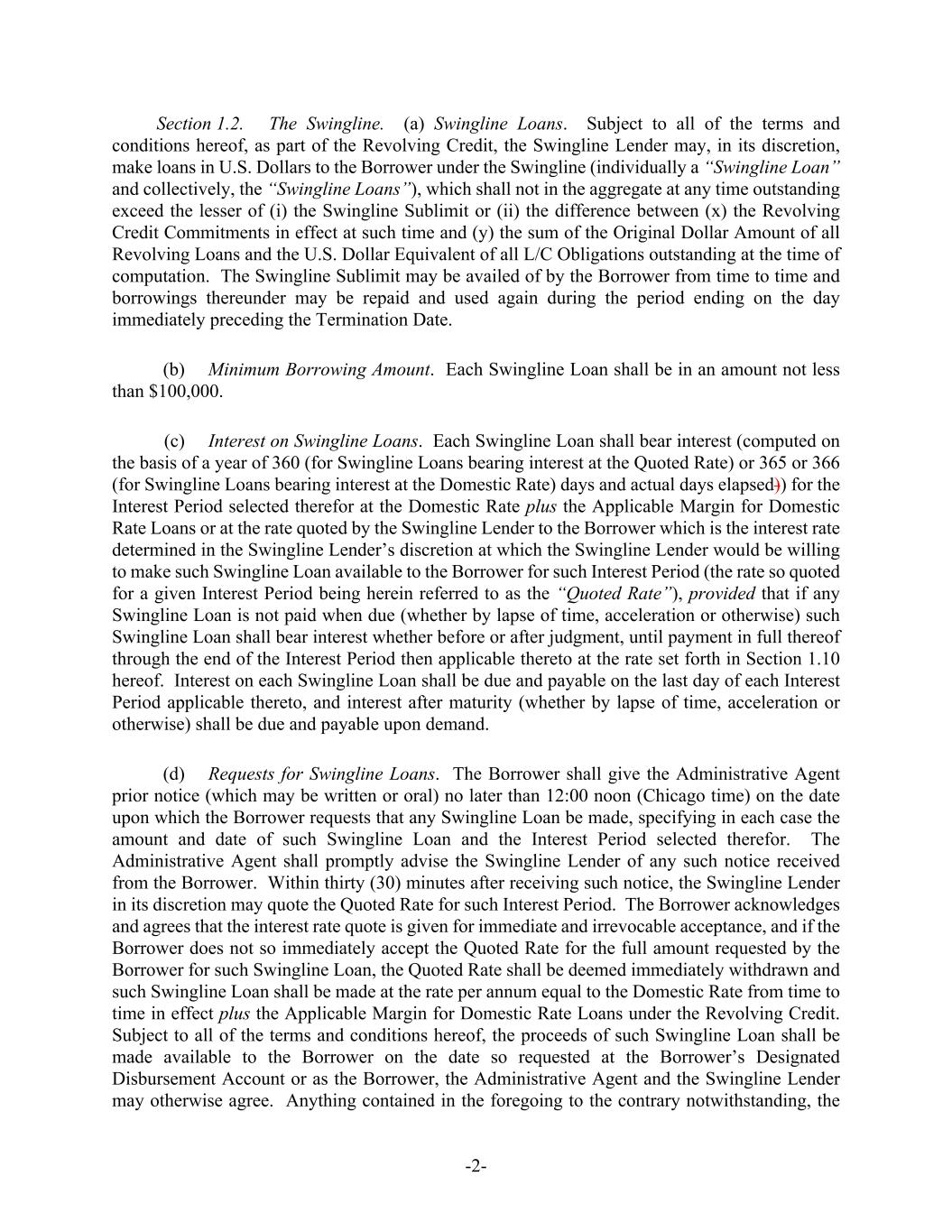 -2- Section 1.2. The Swingline. (a) Swingline Loans. Subject to all of the terms and conditions hereof, as part of the Revolving Credit, the Swingline Lender may, in its discretion, make loans in U.S. Dollars to the Borrower under the Swingline (individually a “Swingline Loan” and collectively, the “Swingline Loans”), which shall not in the aggregate at any time outstanding exceed the lesser of (i) the Swingline Sublimit or (ii) the difference between (x) the Revolving Credit Commitments in effect at such time and (y) the sum of the Original Dollar Amount of all Revolving Loans and the U.S. Dollar Equivalent of all L/C Obligations outstanding at the time of computation. The Swingline Sublimit may be availed of by the Borrower from time to time and borrowings thereunder may be repaid and used again during the period ending on the day immediately preceding the Termination Date. (b) Minimum Borrowing Amount. Each Swingline Loan shall be in an amount not less than $100,000. (c) Interest on Swingline Loans. Each Swingline Loan shall bear interest (computed on the basis of a year of 360 (for Swingline Loans bearing interest at the Quoted Rate) or 365 or 366 (for Swingline Loans bearing interest at the Domestic Rate) days and actual days elapsed)) for the Interest Period selected therefor at the Domestic Rate plus the Applicable Margin for Domestic Rate Loans or at the rate quoted by the Swingline Lender to the Borrower which is the interest rate determined in the Swingline Lender’s discretion at which the Swingline Lender would be willing to make such Swingline Loan available to the Borrower for such Interest Period (the rate so quoted for a given Interest Period being herein referred to as the “Quoted Rate”), provided that if any Swingline Loan is not paid when due (whether by lapse of time, acceleration or otherwise) such Swingline Loan shall bear interest whether before or after judgment, until payment in full thereof through the end of the Interest Period then applicable thereto at the rate set forth in Section 1.10 hereof. Interest on each Swingline Loan shall be due and payable on the last day of each Interest Period applicable thereto, and interest after maturity (whether by lapse of time, acceleration or otherwise) shall be due and payable upon demand. (d) Requests for Swingline Loans. The Borrower shall give the Administrative Agent prior notice (which may be written or oral) no later than 12:00 noon (Chicago time) on the date upon which the Borrower requests that any Swingline Loan be made, specifying in each case the amount and date of such Swingline Loan and the Interest Period selected therefor. The Administrative Agent shall promptly advise the Swingline Lender of any such notice received from the Borrower. Within thirty (30) minutes after receiving such notice, the Swingline Lender in its discretion may quote the Quoted Rate for such Interest Period. The Borrower acknowledges and agrees that the interest rate quote is given for immediate and irrevocable acceptance, and if the Borrower does not so immediately accept the Quoted Rate for the full amount requested by the Borrower for such Swingline Loan, the Quoted Rate shall be deemed immediately withdrawn and such Swingline Loan shall be made at the rate per annum equal to the Domestic Rate from time to time in effect plus the Applicable Margin for Domestic Rate Loans under the Revolving Credit. Subject to all of the terms and conditions hereof, the proceeds of such Swingline Loan shall be made available to the Borrower on the date so requested at the Borrower’s Designated Disbursement Account or as the Borrower, the Administrative Agent and the Swingline Lender may otherwise agree. Anything contained in the foregoing to the contrary notwithstanding, the