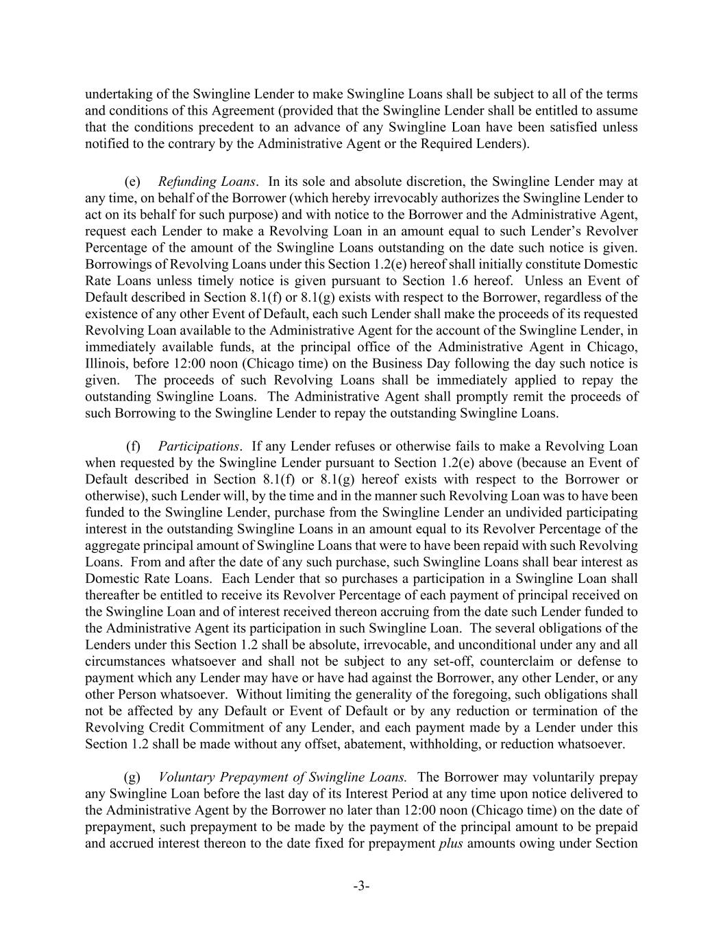 -3- undertaking of the Swingline Lender to make Swingline Loans shall be subject to all of the terms and conditions of this Agreement (provided that the Swingline Lender shall be entitled to assume that the conditions precedent to an advance of any Swingline Loan have been satisfied unless notified to the contrary by the Administrative Agent or the Required Lenders). (e) Refunding Loans. In its sole and absolute discretion, the Swingline Lender may at any time, on behalf of the Borrower (which hereby irrevocably authorizes the Swingline Lender to act on its behalf for such purpose) and with notice to the Borrower and the Administrative Agent, request each Lender to make a Revolving Loan in an amount equal to such Lender’s Revolver Percentage of the amount of the Swingline Loans outstanding on the date such notice is given. Borrowings of Revolving Loans under this Section 1.2(e) hereof shall initially constitute Domestic Rate Loans unless timely notice is given pursuant to Section 1.6 hereof. Unless an Event of Default described in Section 8.1(f) or 8.1(g) exists with respect to the Borrower, regardless of the existence of any other Event of Default, each such Lender shall make the proceeds of its requested Revolving Loan available to the Administrative Agent for the account of the Swingline Lender, in immediately available funds, at the principal office of the Administrative Agent in Chicago, Illinois, before 12:00 noon (Chicago time) on the Business Day following the day such notice is given. The proceeds of such Revolving Loans shall be immediately applied to repay the outstanding Swingline Loans. The Administrative Agent shall promptly remit the proceeds of such Borrowing to the Swingline Lender to repay the outstanding Swingline Loans. (f) Participations. If any Lender refuses or otherwise fails to make a Revolving Loan when requested by the Swingline Lender pursuant to Section 1.2(e) above (because an Event of Default described in Section 8.1(f) or 8.1(g) hereof exists with respect to the Borrower or otherwise), such Lender will, by the time and in the manner such Revolving Loan was to have been funded to the Swingline Lender, purchase from the Swingline Lender an undivided participating interest in the outstanding Swingline Loans in an amount equal to its Revolver Percentage of the aggregate principal amount of Swingline Loans that were to have been repaid with such Revolving Loans. From and after the date of any such purchase, such Swingline Loans shall bear interest as Domestic Rate Loans. Each Lender that so purchases a participation in a Swingline Loan shall thereafter be entitled to receive its Revolver Percentage of each payment of principal received on the Swingline Loan and of interest received thereon accruing from the date such Lender funded to the Administrative Agent its participation in such Swingline Loan. The several obligations of the Lenders under this Section 1.2 shall be absolute, irrevocable, and unconditional under any and all circumstances whatsoever and shall not be subject to any set-off, counterclaim or defense to payment which any Lender may have or have had against the Borrower, any other Lender, or any other Person whatsoever. Without limiting the generality of the foregoing, such obligations shall not be affected by any Default or Event of Default or by any reduction or termination of the Revolving Credit Commitment of any Lender, and each payment made by a Lender under this Section 1.2 shall be made without any offset, abatement, withholding, or reduction whatsoever. (g) Voluntary Prepayment of Swingline Loans. The Borrower may voluntarily prepay any Swingline Loan before the last day of its Interest Period at any time upon notice delivered to the Administrative Agent by the Borrower no later than 12:00 noon (Chicago time) on the date of prepayment, such prepayment to be made by the payment of the principal amount to be prepaid and accrued interest thereon to the date fixed for prepayment plus amounts owing under Section