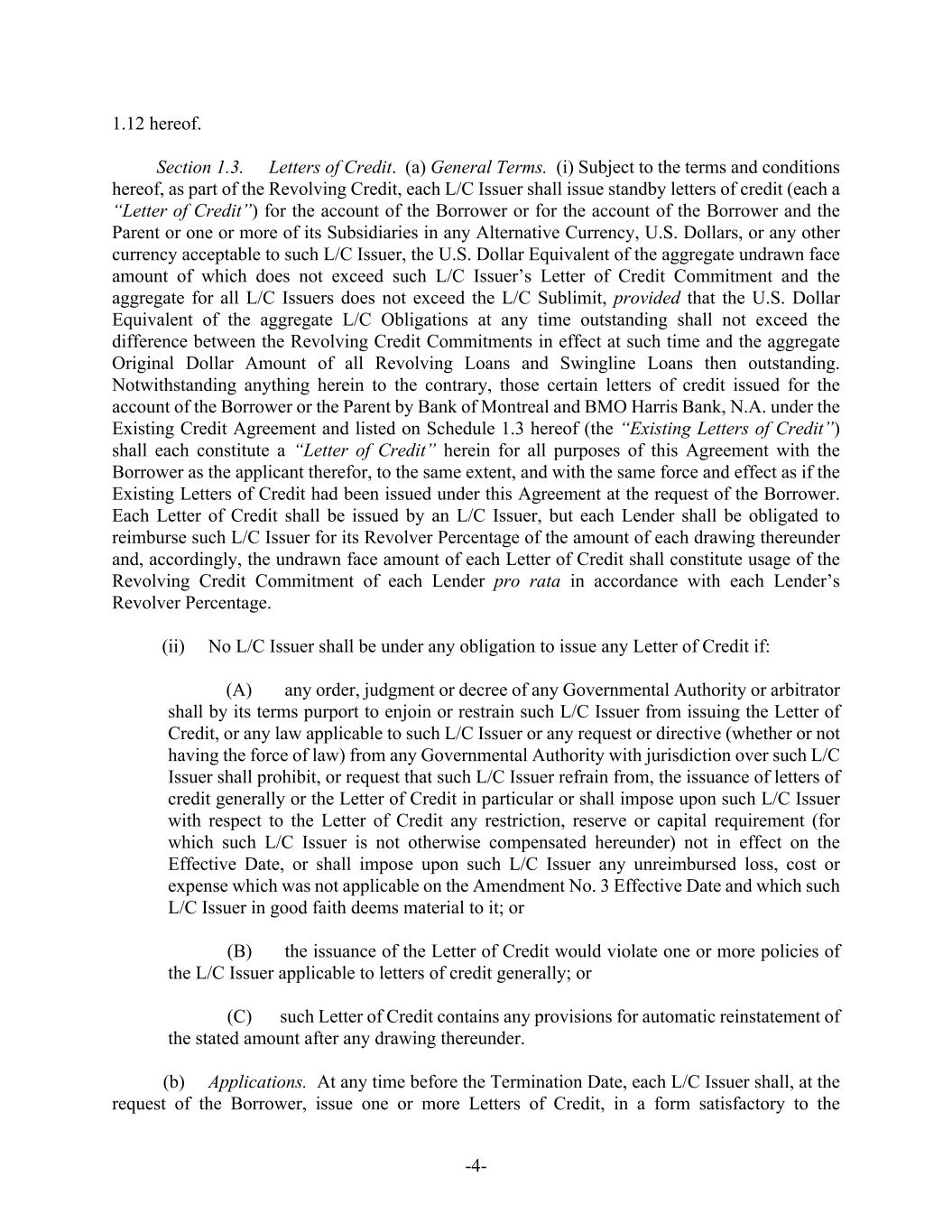 -4- 1.12 hereof. Section 1.3. Letters of Credit. (a) General Terms. (i) Subject to the terms and conditions hereof, as part of the Revolving Credit, each L/C Issuer shall issue standby letters of credit (each a “Letter of Credit”) for the account of the Borrower or for the account of the Borrower and the Parent or one or more of its Subsidiaries in any Alternative Currency, U.S. Dollars, or any other currency acceptable to such L/C Issuer, the U.S. Dollar Equivalent of the aggregate undrawn face amount of which does not exceed such L/C Issuer’s Letter of Credit Commitment and the aggregate for all L/C Issuers does not exceed the L/C Sublimit, provided that the U.S. Dollar Equivalent of the aggregate L/C Obligations at any time outstanding shall not exceed the difference between the Revolving Credit Commitments in effect at such time and the aggregate Original Dollar Amount of all Revolving Loans and Swingline Loans then outstanding. Notwithstanding anything herein to the contrary, those certain letters of credit issued for the account of the Borrower or the Parent by Bank of Montreal and BMO Harris Bank, N.A. under the Existing Credit Agreement and listed on Schedule 1.3 hereof (the “Existing Letters of Credit”) shall each constitute a “Letter of Credit” herein for all purposes of this Agreement with the Borrower as the applicant therefor, to the same extent, and with the same force and effect as if the Existing Letters of Credit had been issued under this Agreement at the request of the Borrower. Each Letter of Credit shall be issued by an L/C Issuer, but each Lender shall be obligated to reimburse such L/C Issuer for its Revolver Percentage of the amount of each drawing thereunder and, accordingly, the undrawn face amount of each Letter of Credit shall constitute usage of the Revolving Credit Commitment of each Lender pro rata in accordance with each Lender’s Revolver Percentage. (ii) No L/C Issuer shall be under any obligation to issue any Letter of Credit if: (A) any order, judgment or decree of any Governmental Authority or arbitrator shall by its terms purport to enjoin or restrain such L/C Issuer from issuing the Letter of Credit, or any law applicable to such L/C Issuer or any request or directive (whether or not having the force of law) from any Governmental Authority with jurisdiction over such L/C Issuer shall prohibit, or request that such L/C Issuer refrain from, the issuance of letters of credit generally or the Letter of Credit in particular or shall impose upon such L/C Issuer with respect to the Letter of Credit any restriction, reserve or capital requirement (for which such L/C Issuer is not otherwise compensated hereunder) not in effect on the Effective Date, or shall impose upon such L/C Issuer any unreimbursed loss, cost or expense which was not applicable on the Amendment No. 3 Effective Date and which such L/C Issuer in good faith deems material to it; or (B) the issuance of the Letter of Credit would violate one or more policies of the L/C Issuer applicable to letters of credit generally; or (C) such Letter of Credit contains any provisions for automatic reinstatement of the stated amount after any drawing thereunder. (b) Applications. At any time before the Termination Date, each L/C Issuer shall, at the request of the Borrower, issue one or more Letters of Credit, in a form satisfactory to the