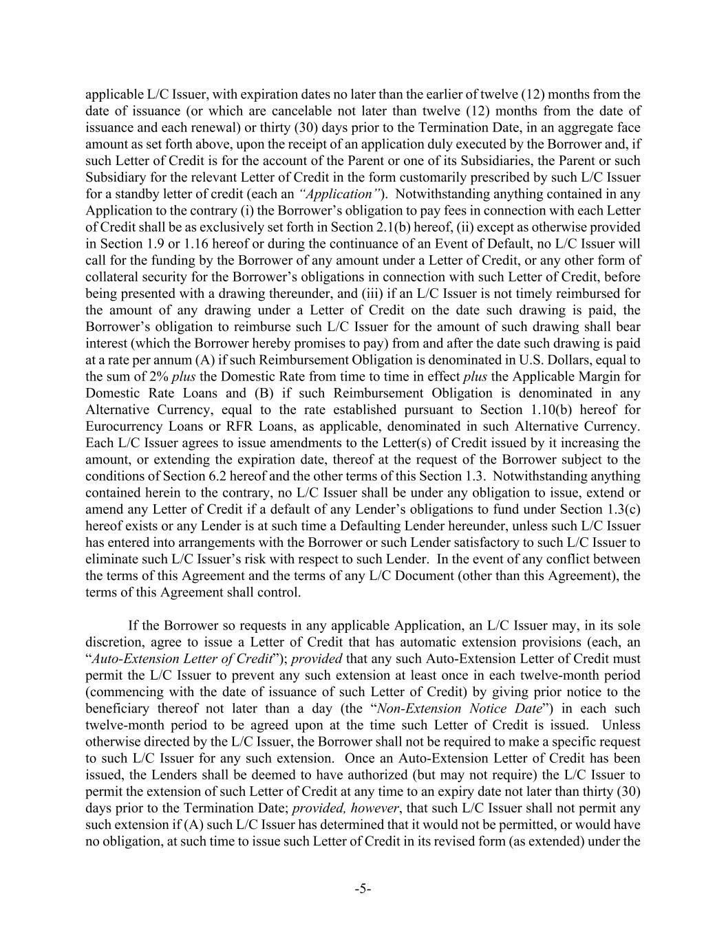 -5- applicable L/C Issuer, with expiration dates no later than the earlier of twelve (12) months from the date of issuance (or which are cancelable not later than twelve (12) months from the date of issuance and each renewal) or thirty (30) days prior to the Termination Date, in an aggregate face amount as set forth above, upon the receipt of an application duly executed by the Borrower and, if such Letter of Credit is for the account of the Parent or one of its Subsidiaries, the Parent or such Subsidiary for the relevant Letter of Credit in the form customarily prescribed by such L/C Issuer for a standby letter of credit (each an “Application”). Notwithstanding anything contained in any Application to the contrary (i) the Borrower’s obligation to pay fees in connection with each Letter of Credit shall be as exclusively set forth in Section 2.1(b) hereof, (ii) except as otherwise provided in Section 1.9 or 1.16 hereof or during the continuance of an Event of Default, no L/C Issuer will call for the funding by the Borrower of any amount under a Letter of Credit, or any other form of collateral security for the Borrower’s obligations in connection with such Letter of Credit, before being presented with a drawing thereunder, and (iii) if an L/C Issuer is not timely reimbursed for the amount of any drawing under a Letter of Credit on the date such drawing is paid, the Borrower’s obligation to reimburse such L/C Issuer for the amount of such drawing shall bear interest (which the Borrower hereby promises to pay) from and after the date such drawing is paid at a rate per annum (A) if such Reimbursement Obligation is denominated in U.S. Dollars, equal to the sum of 2% plus the Domestic Rate from time to time in effect plus the Applicable Margin for Domestic Rate Loans and (B) if such Reimbursement Obligation is denominated in any Alternative Currency, equal to the rate established pursuant to Section 1.10(b) hereof for Eurocurrency Loans or RFR Loans, as applicable, denominated in such Alternative Currency. Each L/C Issuer agrees to issue amendments to the Letter(s) of Credit issued by it increasing the amount, or extending the expiration date, thereof at the request of the Borrower subject to the conditions of Section 6.2 hereof and the other terms of this Section 1.3. Notwithstanding anything contained herein to the contrary, no L/C Issuer shall be under any obligation to issue, extend or amend any Letter of Credit if a default of any Lender’s obligations to fund under Section 1.3(c) hereof exists or any Lender is at such time a Defaulting Lender hereunder, unless such L/C Issuer has entered into arrangements with the Borrower or such Lender satisfactory to such L/C Issuer to eliminate such L/C Issuer’s risk with respect to such Lender. In the event of any conflict between the terms of this Agreement and the terms of any L/C Document (other than this Agreement), the terms of this Agreement shall control. If the Borrower so requests in any applicable Application, an L/C Issuer may, in its sole discretion, agree to issue a Letter of Credit that has automatic extension provisions (each, an “Auto-Extension Letter of Credit”); provided that any such Auto-Extension Letter of Credit must permit the L/C Issuer to prevent any such extension at least once in each twelve-month period (commencing with the date of issuance of such Letter of Credit) by giving prior notice to the beneficiary thereof not later than a day (the “Non-Extension Notice Date”) in each such twelve-month period to be agreed upon at the time such Letter of Credit is issued. Unless otherwise directed by the L/C Issuer, the Borrower shall not be required to make a specific request to such L/C Issuer for any such extension. Once an Auto-Extension Letter of Credit has been issued, the Lenders shall be deemed to have authorized (but may not require) the L/C Issuer to permit the extension of such Letter of Credit at any time to an expiry date not later than thirty (30) days prior to the Termination Date; provided, however, that such L/C Issuer shall not permit any such extension if (A) such L/C Issuer has determined that it would not be permitted, or would have no obligation, at such time to issue such Letter of Credit in its revised form (as extended) under the