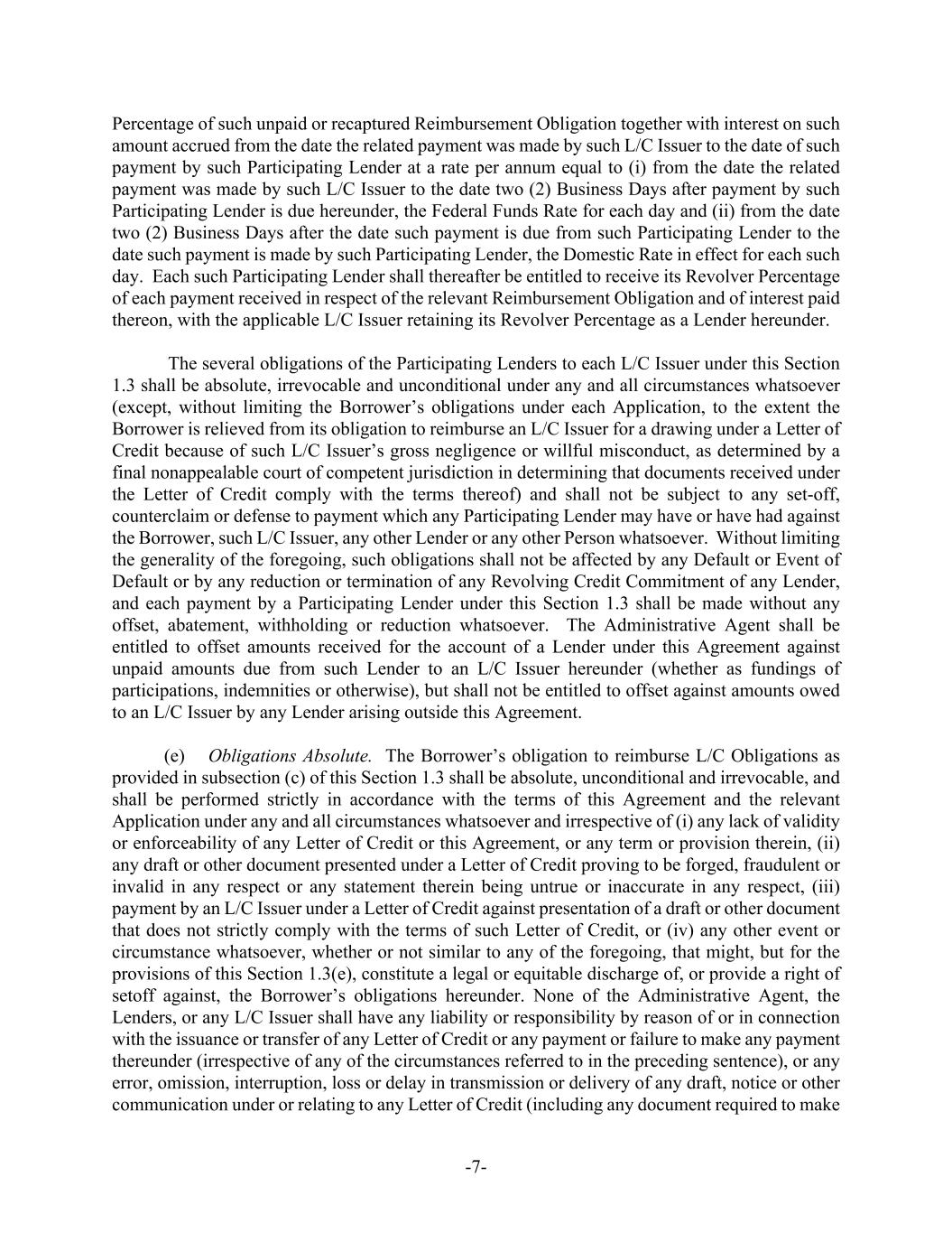 -7- Percentage of such unpaid or recaptured Reimbursement Obligation together with interest on such amount accrued from the date the related payment was made by such L/C Issuer to the date of such payment by such Participating Lender at a rate per annum equal to (i) from the date the related payment was made by such L/C Issuer to the date two (2) Business Days after payment by such Participating Lender is due hereunder, the Federal Funds Rate for each day and (ii) from the date two (2) Business Days after the date such payment is due from such Participating Lender to the date such payment is made by such Participating Lender, the Domestic Rate in effect for each such day. Each such Participating Lender shall thereafter be entitled to receive its Revolver Percentage of each payment received in respect of the relevant Reimbursement Obligation and of interest paid thereon, with the applicable L/C Issuer retaining its Revolver Percentage as a Lender hereunder. The several obligations of the Participating Lenders to each L/C Issuer under this Section 1.3 shall be absolute, irrevocable and unconditional under any and all circumstances whatsoever (except, without limiting the Borrower’s obligations under each Application, to the extent the Borrower is relieved from its obligation to reimburse an L/C Issuer for a drawing under a Letter of Credit because of such L/C Issuer’s gross negligence or willful misconduct, as determined by a final nonappealable court of competent jurisdiction in determining that documents received under the Letter of Credit comply with the terms thereof) and shall not be subject to any set-off, counterclaim or defense to payment which any Participating Lender may have or have had against the Borrower, such L/C Issuer, any other Lender or any other Person whatsoever. Without limiting the generality of the foregoing, such obligations shall not be affected by any Default or Event of Default or by any reduction or termination of any Revolving Credit Commitment of any Lender, and each payment by a Participating Lender under this Section 1.3 shall be made without any offset, abatement, withholding or reduction whatsoever. The Administrative Agent shall be entitled to offset amounts received for the account of a Lender under this Agreement against unpaid amounts due from such Lender to an L/C Issuer hereunder (whether as fundings of participations, indemnities or otherwise), but shall not be entitled to offset against amounts owed to an L/C Issuer by any Lender arising outside this Agreement. (e) Obligations Absolute. The Borrower’s obligation to reimburse L/C Obligations as provided in subsection (c) of this Section 1.3 shall be absolute, unconditional and irrevocable, and shall be performed strictly in accordance with the terms of this Agreement and the relevant Application under any and all circumstances whatsoever and irrespective of (i) any lack of validity or enforceability of any Letter of Credit or this Agreement, or any term or provision therein, (ii) any draft or other document presented under a Letter of Credit proving to be forged, fraudulent or invalid in any respect or any statement therein being untrue or inaccurate in any respect, (iii) payment by an L/C Issuer under a Letter of Credit against presentation of a draft or other document that does not strictly comply with the terms of such Letter of Credit, or (iv) any other event or circumstance whatsoever, whether or not similar to any of the foregoing, that might, but for the provisions of this Section 1.3(e), constitute a legal or equitable discharge of, or provide a right of setoff against, the Borrower’s obligations hereunder. None of the Administrative Agent, the Lenders, or any L/C Issuer shall have any liability or responsibility by reason of or in connection with the issuance or transfer of any Letter of Credit or any payment or failure to make any payment thereunder (irrespective of any of the circumstances referred to in the preceding sentence), or any error, omission, interruption, loss or delay in transmission or delivery of any draft, notice or other communication under or relating to any Letter of Credit (including any document required to make