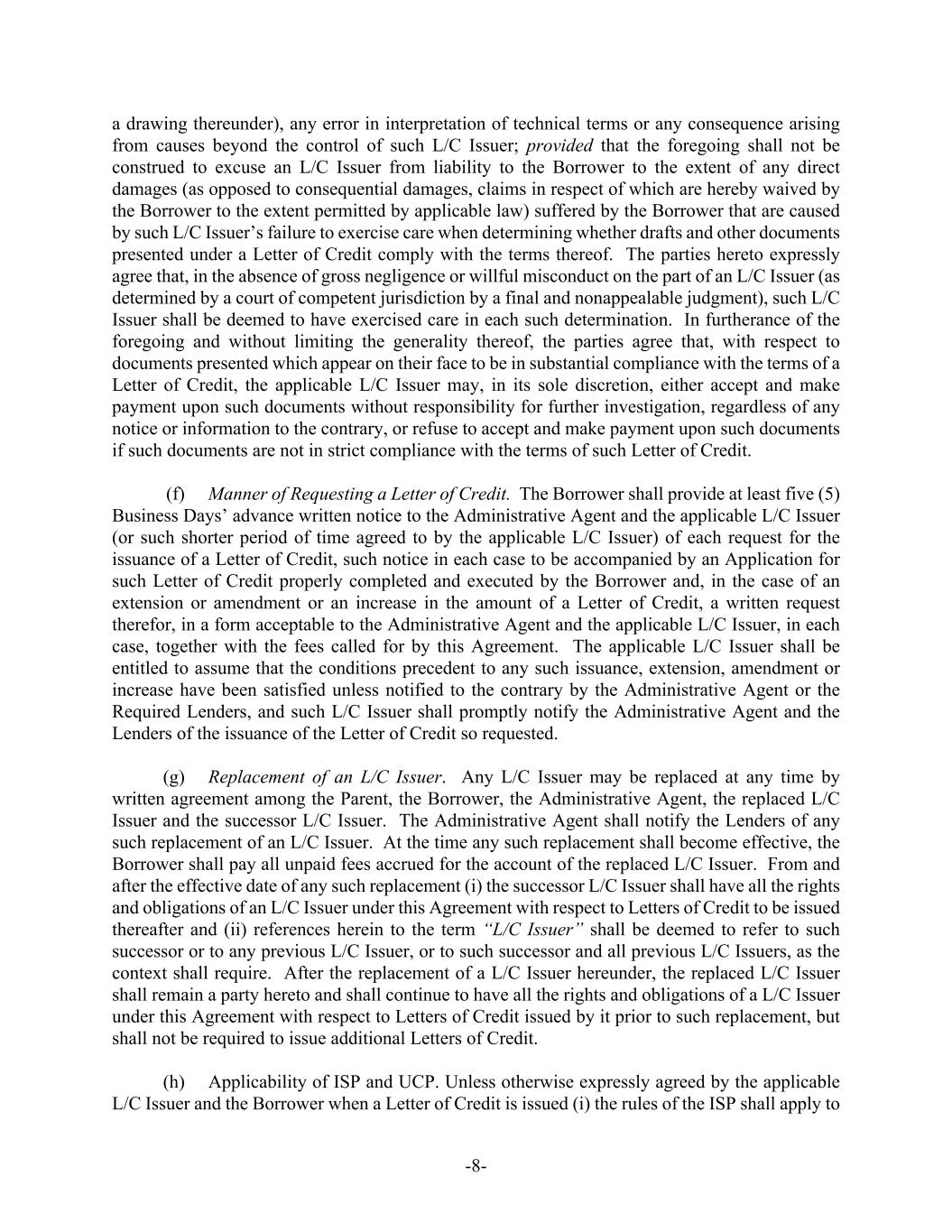 -8- a drawing thereunder), any error in interpretation of technical terms or any consequence arising from causes beyond the control of such L/C Issuer; provided that the foregoing shall not be construed to excuse an L/C Issuer from liability to the Borrower to the extent of any direct damages (as opposed to consequential damages, claims in respect of which are hereby waived by the Borrower to the extent permitted by applicable law) suffered by the Borrower that are caused by such L/C Issuer’s failure to exercise care when determining whether drafts and other documents presented under a Letter of Credit comply with the terms thereof. The parties hereto expressly agree that, in the absence of gross negligence or willful misconduct on the part of an L/C Issuer (as determined by a court of competent jurisdiction by a final and nonappealable judgment), such L/C Issuer shall be deemed to have exercised care in each such determination. In furtherance of the foregoing and without limiting the generality thereof, the parties agree that, with respect to documents presented which appear on their face to be in substantial compliance with the terms of a Letter of Credit, the applicable L/C Issuer may, in its sole discretion, either accept and make payment upon such documents without responsibility for further investigation, regardless of any notice or information to the contrary, or refuse to accept and make payment upon such documents if such documents are not in strict compliance with the terms of such Letter of Credit. (f) Manner of Requesting a Letter of Credit. The Borrower shall provide at least five (5) Business Days’ advance written notice to the Administrative Agent and the applicable L/C Issuer (or such shorter period of time agreed to by the applicable L/C Issuer) of each request for the issuance of a Letter of Credit, such notice in each case to be accompanied by an Application for such Letter of Credit properly completed and executed by the Borrower and, in the case of an extension or amendment or an increase in the amount of a Letter of Credit, a written request therefor, in a form acceptable to the Administrative Agent and the applicable L/C Issuer, in each case, together with the fees called for by this Agreement. The applicable L/C Issuer shall be entitled to assume that the conditions precedent to any such issuance, extension, amendment or increase have been satisfied unless notified to the contrary by the Administrative Agent or the Required Lenders, and such L/C Issuer shall promptly notify the Administrative Agent and the Lenders of the issuance of the Letter of Credit so requested. (g) Replacement of an L/C Issuer. Any L/C Issuer may be replaced at any time by written agreement among the Parent, the Borrower, the Administrative Agent, the replaced L/C Issuer and the successor L/C Issuer. The Administrative Agent shall notify the Lenders of any such replacement of an L/C Issuer. At the time any such replacement shall become effective, the Borrower shall pay all unpaid fees accrued for the account of the replaced L/C Issuer. From and after the effective date of any such replacement (i) the successor L/C Issuer shall have all the rights and obligations of an L/C Issuer under this Agreement with respect to Letters of Credit to be issued thereafter and (ii) references herein to the term “L/C Issuer” shall be deemed to refer to such successor or to any previous L/C Issuer, or to such successor and all previous L/C Issuers, as the context shall require. After the replacement of a L/C Issuer hereunder, the replaced L/C Issuer shall remain a party hereto and shall continue to have all the rights and obligations of a L/C Issuer under this Agreement with respect to Letters of Credit issued by it prior to such replacement, but shall not be required to issue additional Letters of Credit. (h) Applicability of ISP and UCP. Unless otherwise expressly agreed by the applicable L/C Issuer and the Borrower when a Letter of Credit is issued (i) the rules of the ISP shall apply to