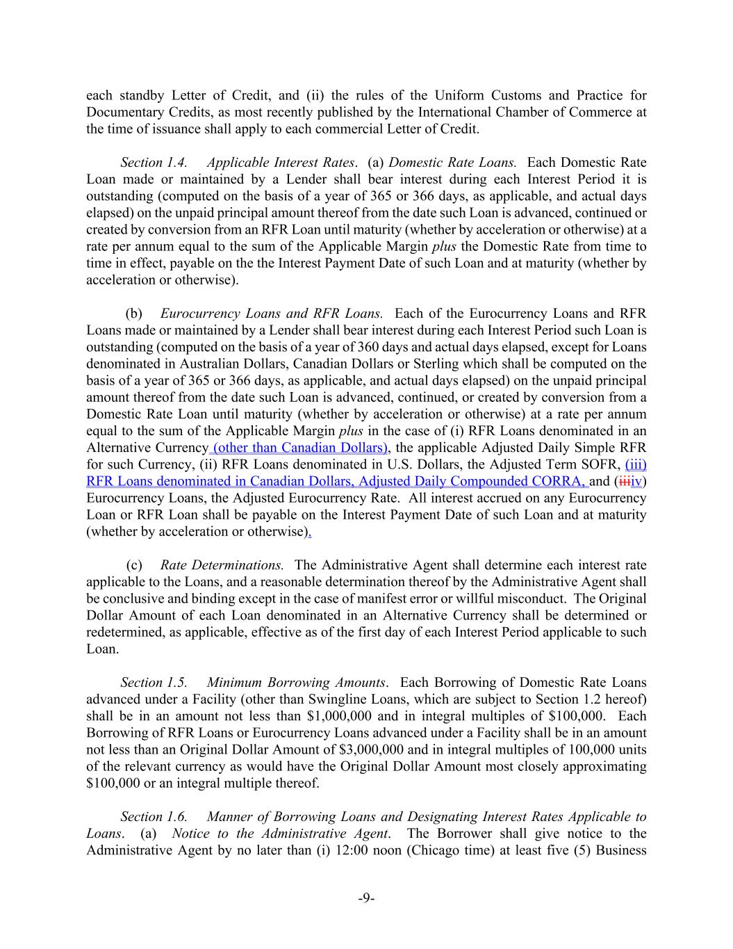-9- each standby Letter of Credit, and (ii) the rules of the Uniform Customs and Practice for Documentary Credits, as most recently published by the International Chamber of Commerce at the time of issuance shall apply to each commercial Letter of Credit. Section 1.4. Applicable Interest Rates. (a) Domestic Rate Loans. Each Domestic Rate Loan made or maintained by a Lender shall bear interest during each Interest Period it is outstanding (computed on the basis of a year of 365 or 366 days, as applicable, and actual days elapsed) on the unpaid principal amount thereof from the date such Loan is advanced, continued or created by conversion from an RFR Loan until maturity (whether by acceleration or otherwise) at a rate per annum equal to the sum of the Applicable Margin plus the Domestic Rate from time to time in effect, payable on the the Interest Payment Date of such Loan and at maturity (whether by acceleration or otherwise). (b) Eurocurrency Loans and RFR Loans. Each of the Eurocurrency Loans and RFR Loans made or maintained by a Lender shall bear interest during each Interest Period such Loan is outstanding (computed on the basis of a year of 360 days and actual days elapsed, except for Loans denominated in Australian Dollars, Canadian Dollars or Sterling which shall be computed on the basis of a year of 365 or 366 days, as applicable, and actual days elapsed) on the unpaid principal amount thereof from the date such Loan is advanced, continued, or created by conversion from a Domestic Rate Loan until maturity (whether by acceleration or otherwise) at a rate per annum equal to the sum of the Applicable Margin plus in the case of (i) RFR Loans denominated in an Alternative Currency (other than Canadian Dollars), the applicable Adjusted Daily Simple RFR for such Currency, (ii) RFR Loans denominated in U.S. Dollars, the Adjusted Term SOFR, (iii) RFR Loans denominated in Canadian Dollars, Adjusted Daily Compounded CORRA, and (iiiiv) Eurocurrency Loans, the Adjusted Eurocurrency Rate. All interest accrued on any Eurocurrency Loan or RFR Loan shall be payable on the Interest Payment Date of such Loan and at maturity (whether by acceleration or otherwise). (c) Rate Determinations. The Administrative Agent shall determine each interest rate applicable to the Loans, and a reasonable determination thereof by the Administrative Agent shall be conclusive and binding except in the case of manifest error or willful misconduct. The Original Dollar Amount of each Loan denominated in an Alternative Currency shall be determined or redetermined, as applicable, effective as of the first day of each Interest Period applicable to such Loan. Section 1.5. Minimum Borrowing Amounts. Each Borrowing of Domestic Rate Loans advanced under a Facility (other than Swingline Loans, which are subject to Section 1.2 hereof) shall be in an amount not less than $1,000,000 and in integral multiples of $100,000. Each Borrowing of RFR Loans or Eurocurrency Loans advanced under a Facility shall be in an amount not less than an Original Dollar Amount of $3,000,000 and in integral multiples of 100,000 units of the relevant currency as would have the Original Dollar Amount most closely approximating $100,000 or an integral multiple thereof. Section 1.6. Manner of Borrowing Loans and Designating Interest Rates Applicable to Loans. (a) Notice to the Administrative Agent. The Borrower shall give notice to the Administrative Agent by no later than (i) 12:00 noon (Chicago time) at least five (5) Business