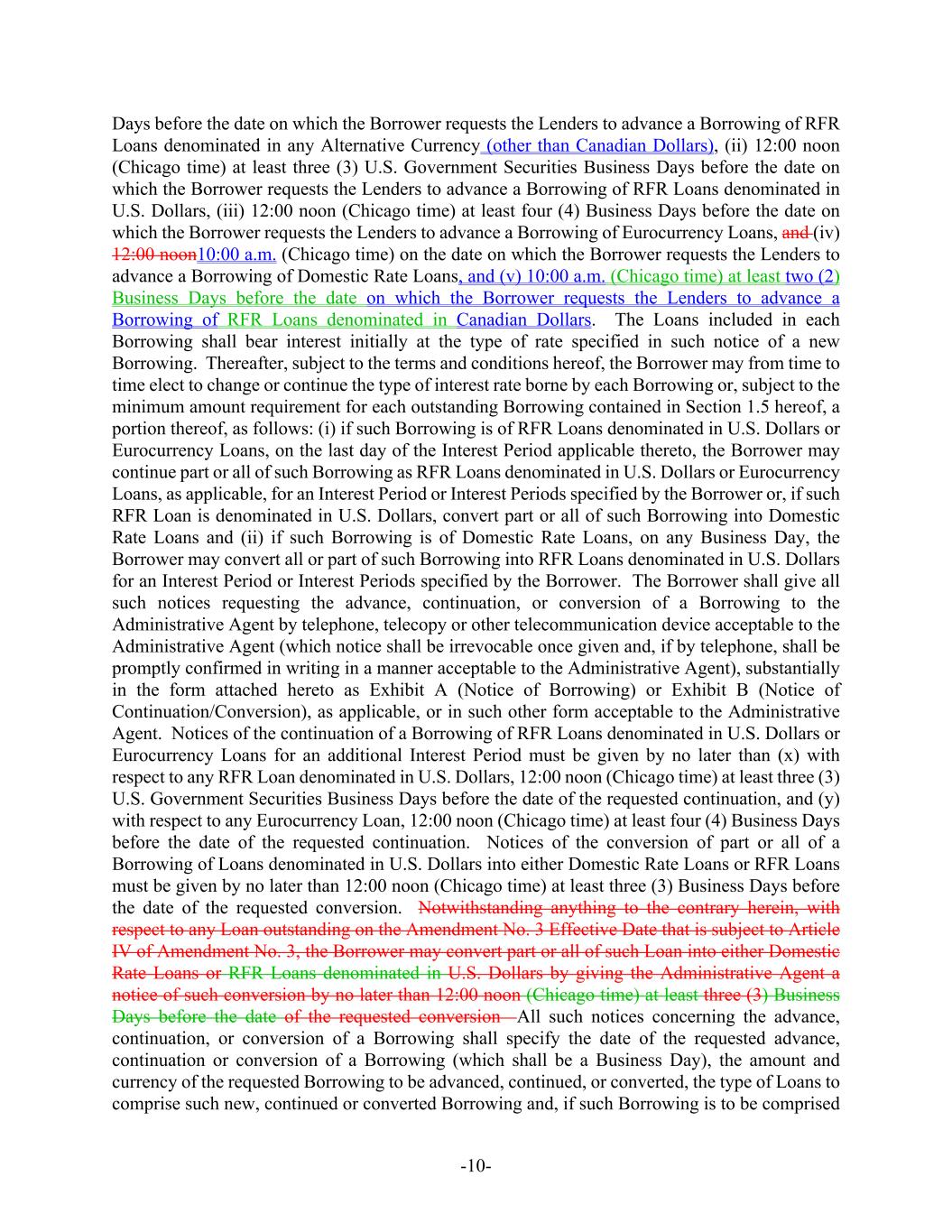 -10- Days before the date on which the Borrower requests the Lenders to advance a Borrowing of RFR Loans denominated in any Alternative Currency (other than Canadian Dollars), (ii) 12:00 noon (Chicago time) at least three (3) U.S. Government Securities Business Days before the date on which the Borrower requests the Lenders to advance a Borrowing of RFR Loans denominated in U.S. Dollars, (iii) 12:00 noon (Chicago time) at least four (4) Business Days before the date on which the Borrower requests the Lenders to advance a Borrowing of Eurocurrency Loans, and (iv) 12:00 noon10:00 a.m. (Chicago time) on the date on which the Borrower requests the Lenders to advance a Borrowing of Domestic Rate Loans, and (v) 10:00 a.m. (Chicago time) at least two (2) Business Days before the date on which the Borrower requests the Lenders to advance a Borrowing of RFR Loans denominated in Canadian Dollars. The Loans included in each Borrowing shall bear interest initially at the type of rate specified in such notice of a new Borrowing. Thereafter, subject to the terms and conditions hereof, the Borrower may from time to time elect to change or continue the type of interest rate borne by each Borrowing or, subject to the minimum amount requirement for each outstanding Borrowing contained in Section 1.5 hereof, a portion thereof, as follows: (i) if such Borrowing is of RFR Loans denominated in U.S. Dollars or Eurocurrency Loans, on the last day of the Interest Period applicable thereto, the Borrower may continue part or all of such Borrowing as RFR Loans denominated in U.S. Dollars or Eurocurrency Loans, as applicable, for an Interest Period or Interest Periods specified by the Borrower or, if such RFR Loan is denominated in U.S. Dollars, convert part or all of such Borrowing into Domestic Rate Loans and (ii) if such Borrowing is of Domestic Rate Loans, on any Business Day, the Borrower may convert all or part of such Borrowing into RFR Loans denominated in U.S. Dollars for an Interest Period or Interest Periods specified by the Borrower. The Borrower shall give all such notices requesting the advance, continuation, or conversion of a Borrowing to the Administrative Agent by telephone, telecopy or other telecommunication device acceptable to the Administrative Agent (which notice shall be irrevocable once given and, if by telephone, shall be promptly confirmed in writing in a manner acceptable to the Administrative Agent), substantially in the form attached hereto as Exhibit A (Notice of Borrowing) or Exhibit B (Notice of Continuation/Conversion), as applicable, or in such other form acceptable to the Administrative Agent. Notices of the continuation of a Borrowing of RFR Loans denominated in U.S. Dollars or Eurocurrency Loans for an additional Interest Period must be given by no later than (x) with respect to any RFR Loan denominated in U.S. Dollars, 12:00 noon (Chicago time) at least three (3) U.S. Government Securities Business Days before the date of the requested continuation, and (y) with respect to any Eurocurrency Loan, 12:00 noon (Chicago time) at least four (4) Business Days before the date of the requested continuation. Notices of the conversion of part or all of a Borrowing of Loans denominated in U.S. Dollars into either Domestic Rate Loans or RFR Loans must be given by no later than 12:00 noon (Chicago time) at least three (3) Business Days before the date of the requested conversion. Notwithstanding anything to the contrary herein, with respect to any Loan outstanding on the Amendment No. 3 Effective Date that is subject to Article IV of Amendment No. 3, the Borrower may convert part or all of such Loan into either Domestic Rate Loans or RFR Loans denominated in U.S. Dollars by giving the Administrative Agent a notice of such conversion by no later than 12:00 noon (Chicago time) at least three (3) Business Days before the date of the requested conversion All such notices concerning the advance, continuation, or conversion of a Borrowing shall specify the date of the requested advance, continuation or conversion of a Borrowing (which shall be a Business Day), the amount and currency of the requested Borrowing to be advanced, continued, or converted, the type of Loans to comprise such new, continued or converted Borrowing and, if such Borrowing is to be comprised