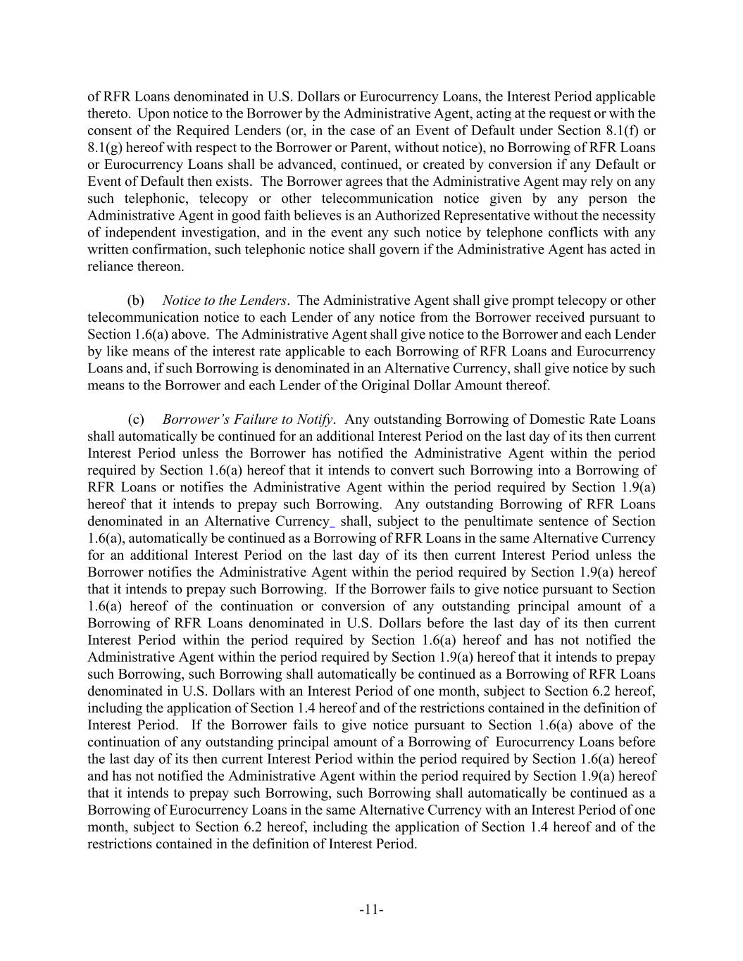 -11- of RFR Loans denominated in U.S. Dollars or Eurocurrency Loans, the Interest Period applicable thereto. Upon notice to the Borrower by the Administrative Agent, acting at the request or with the consent of the Required Lenders (or, in the case of an Event of Default under Section 8.1(f) or 8.1(g) hereof with respect to the Borrower or Parent, without notice), no Borrowing of RFR Loans or Eurocurrency Loans shall be advanced, continued, or created by conversion if any Default or Event of Default then exists. The Borrower agrees that the Administrative Agent may rely on any such telephonic, telecopy or other telecommunication notice given by any person the Administrative Agent in good faith believes is an Authorized Representative without the necessity of independent investigation, and in the event any such notice by telephone conflicts with any written confirmation, such telephonic notice shall govern if the Administrative Agent has acted in reliance thereon. (b) Notice to the Lenders. The Administrative Agent shall give prompt telecopy or other telecommunication notice to each Lender of any notice from the Borrower received pursuant to Section 1.6(a) above. The Administrative Agent shall give notice to the Borrower and each Lender by like means of the interest rate applicable to each Borrowing of RFR Loans and Eurocurrency Loans and, if such Borrowing is denominated in an Alternative Currency, shall give notice by such means to the Borrower and each Lender of the Original Dollar Amount thereof. (c) Borrower’s Failure to Notify. Any outstanding Borrowing of Domestic Rate Loans shall automatically be continued for an additional Interest Period on the last day of its then current Interest Period unless the Borrower has notified the Administrative Agent within the period required by Section 1.6(a) hereof that it intends to convert such Borrowing into a Borrowing of RFR Loans or notifies the Administrative Agent within the period required by Section 1.9(a) hereof that it intends to prepay such Borrowing. Any outstanding Borrowing of RFR Loans denominated in an Alternative Currency shall, subject to the penultimate sentence of Section 1.6(a), automatically be continued as a Borrowing of RFR Loans in the same Alternative Currency for an additional Interest Period on the last day of its then current Interest Period unless the Borrower notifies the Administrative Agent within the period required by Section 1.9(a) hereof that it intends to prepay such Borrowing. If the Borrower fails to give notice pursuant to Section 1.6(a) hereof of the continuation or conversion of any outstanding principal amount of a Borrowing of RFR Loans denominated in U.S. Dollars before the last day of its then current Interest Period within the period required by Section 1.6(a) hereof and has not notified the Administrative Agent within the period required by Section 1.9(a) hereof that it intends to prepay such Borrowing, such Borrowing shall automatically be continued as a Borrowing of RFR Loans denominated in U.S. Dollars with an Interest Period of one month, subject to Section 6.2 hereof, including the application of Section 1.4 hereof and of the restrictions contained in the definition of Interest Period. If the Borrower fails to give notice pursuant to Section 1.6(a) above of the continuation of any outstanding principal amount of a Borrowing of Eurocurrency Loans before the last day of its then current Interest Period within the period required by Section 1.6(a) hereof and has not notified the Administrative Agent within the period required by Section 1.9(a) hereof that it intends to prepay such Borrowing, such Borrowing shall automatically be continued as a Borrowing of Eurocurrency Loans in the same Alternative Currency with an Interest Period of one month, subject to Section 6.2 hereof, including the application of Section 1.4 hereof and of the restrictions contained in the definition of Interest Period.