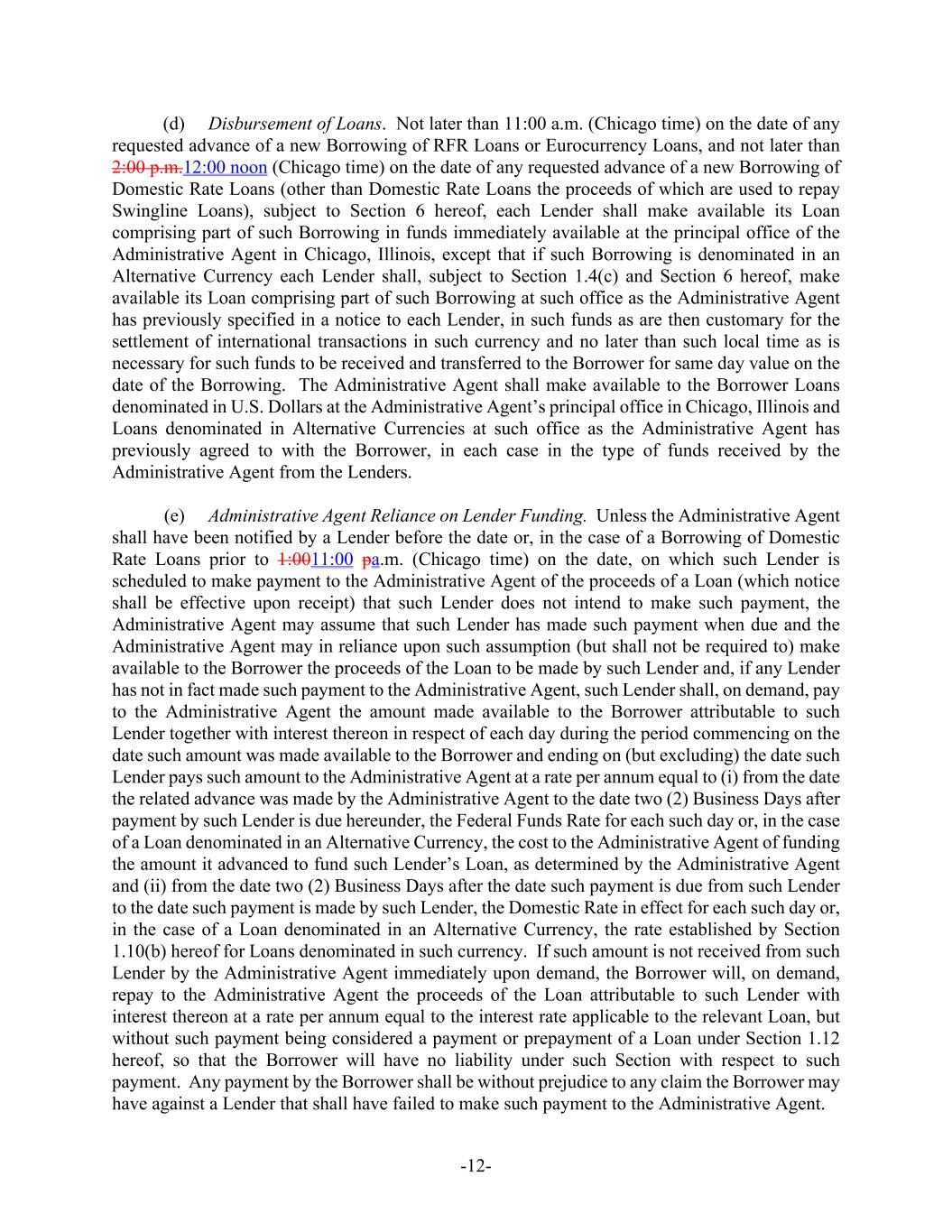 -12- (d) Disbursement of Loans. Not later than 11:00 a.m. (Chicago time) on the date of any requested advance of a new Borrowing of RFR Loans or Eurocurrency Loans, and not later than 2:00 p.m.12:00 noon (Chicago time) on the date of any requested advance of a new Borrowing of Domestic Rate Loans (other than Domestic Rate Loans the proceeds of which are used to repay Swingline Loans), subject to Section 6 hereof, each Lender shall make available its Loan comprising part of such Borrowing in funds immediately available at the principal office of the Administrative Agent in Chicago, Illinois, except that if such Borrowing is denominated in an Alternative Currency each Lender shall, subject to Section 1.4(c) and Section 6 hereof, make available its Loan comprising part of such Borrowing at such office as the Administrative Agent has previously specified in a notice to each Lender, in such funds as are then customary for the settlement of international transactions in such currency and no later than such local time as is necessary for such funds to be received and transferred to the Borrower for same day value on the date of the Borrowing. The Administrative Agent shall make available to the Borrower Loans denominated in U.S. Dollars at the Administrative Agent’s principal office in Chicago, Illinois and Loans denominated in Alternative Currencies at such office as the Administrative Agent has previously agreed to with the Borrower, in each case in the type of funds received by the Administrative Agent from the Lenders. (e) Administrative Agent Reliance on Lender Funding. Unless the Administrative Agent shall have been notified by a Lender before the date or, in the case of a Borrowing of Domestic Rate Loans prior to 1:0011:00 pa.m. (Chicago time) on the date, on which such Lender is scheduled to make payment to the Administrative Agent of the proceeds of a Loan (which notice shall be effective upon receipt) that such Lender does not intend to make such payment, the Administrative Agent may assume that such Lender has made such payment when due and the Administrative Agent may in reliance upon such assumption (but shall not be required to) make available to the Borrower the proceeds of the Loan to be made by such Lender and, if any Lender has not in fact made such payment to the Administrative Agent, such Lender shall, on demand, pay to the Administrative Agent the amount made available to the Borrower attributable to such Lender together with interest thereon in respect of each day during the period commencing on the date such amount was made available to the Borrower and ending on (but excluding) the date such Lender pays such amount to the Administrative Agent at a rate per annum equal to (i) from the date the related advance was made by the Administrative Agent to the date two (2) Business Days after payment by such Lender is due hereunder, the Federal Funds Rate for each such day or, in the case of a Loan denominated in an Alternative Currency, the cost to the Administrative Agent of funding the amount it advanced to fund such Lender’s Loan, as determined by the Administrative Agent and (ii) from the date two (2) Business Days after the date such payment is due from such Lender to the date such payment is made by such Lender, the Domestic Rate in effect for each such day or, in the case of a Loan denominated in an Alternative Currency, the rate established by Section 1.10(b) hereof for Loans denominated in such currency. If such amount is not received from such Lender by the Administrative Agent immediately upon demand, the Borrower will, on demand, repay to the Administrative Agent the proceeds of the Loan attributable to such Lender with interest thereon at a rate per annum equal to the interest rate applicable to the relevant Loan, but without such payment being considered a payment or prepayment of a Loan under Section 1.12 hereof, so that the Borrower will have no liability under such Section with respect to such payment. Any payment by the Borrower shall be without prejudice to any claim the Borrower may have against a Lender that shall have failed to make such payment to the Administrative Agent.