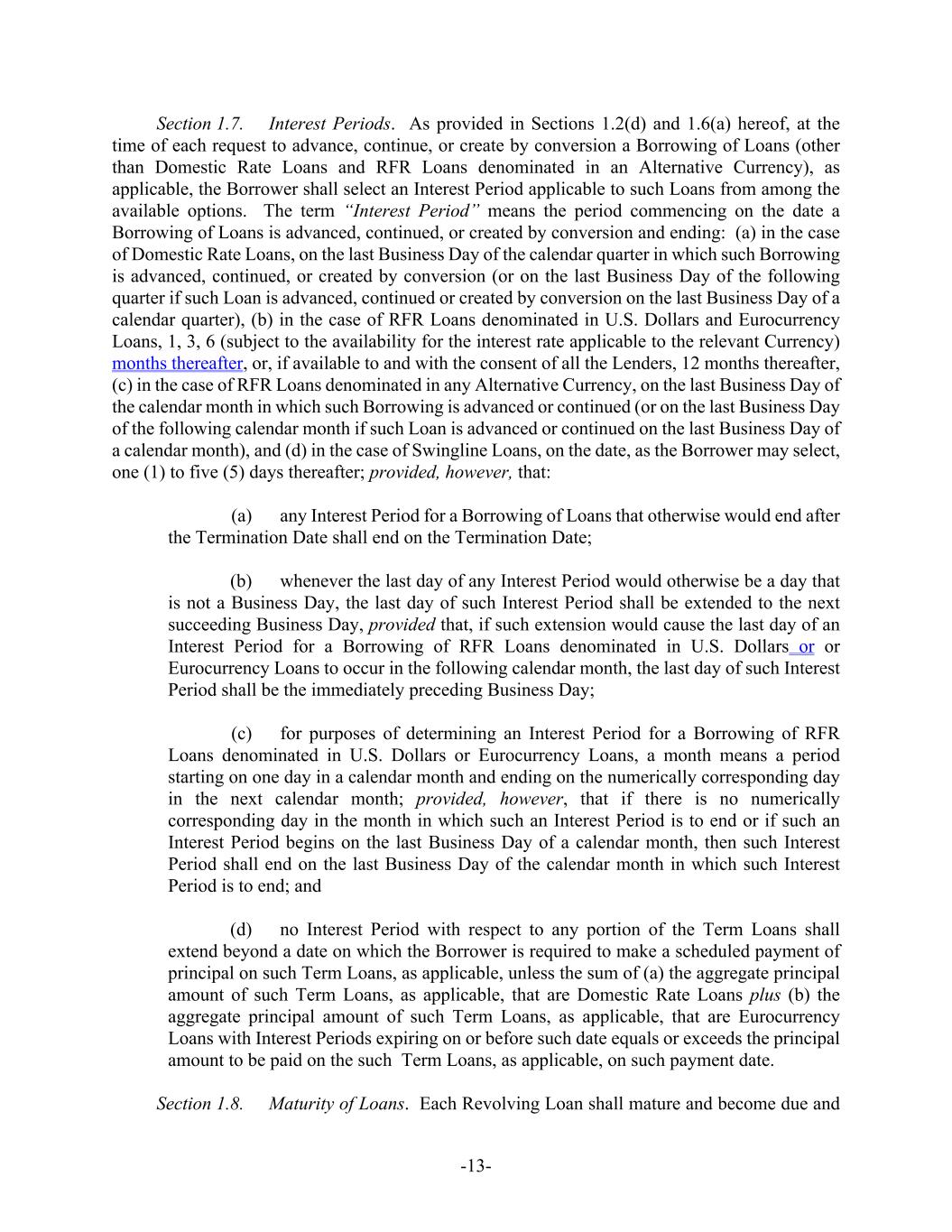 -13- Section 1.7. Interest Periods. As provided in Sections 1.2(d) and 1.6(a) hereof, at the time of each request to advance, continue, or create by conversion a Borrowing of Loans (other than Domestic Rate Loans and RFR Loans denominated in an Alternative Currency), as applicable, the Borrower shall select an Interest Period applicable to such Loans from among the available options. The term “Interest Period” means the period commencing on the date a Borrowing of Loans is advanced, continued, or created by conversion and ending: (a) in the case of Domestic Rate Loans, on the last Business Day of the calendar quarter in which such Borrowing is advanced, continued, or created by conversion (or on the last Business Day of the following quarter if such Loan is advanced, continued or created by conversion on the last Business Day of a calendar quarter), (b) in the case of RFR Loans denominated in U.S. Dollars and Eurocurrency Loans, 1, 3, 6 (subject to the availability for the interest rate applicable to the relevant Currency) months thereafter, or, if available to and with the consent of all the Lenders, 12 months thereafter, (c) in the case of RFR Loans denominated in any Alternative Currency, on the last Business Day of the calendar month in which such Borrowing is advanced or continued (or on the last Business Day of the following calendar month if such Loan is advanced or continued on the last Business Day of a calendar month), and (d) in the case of Swingline Loans, on the date, as the Borrower may select, one (1) to five (5) days thereafter; provided, however, that: (a) any Interest Period for a Borrowing of Loans that otherwise would end after the Termination Date shall end on the Termination Date; (b) whenever the last day of any Interest Period would otherwise be a day that is not a Business Day, the last day of such Interest Period shall be extended to the next succeeding Business Day, provided that, if such extension would cause the last day of an Interest Period for a Borrowing of RFR Loans denominated in U.S. Dollars or or Eurocurrency Loans to occur in the following calendar month, the last day of such Interest Period shall be the immediately preceding Business Day; (c) for purposes of determining an Interest Period for a Borrowing of RFR Loans denominated in U.S. Dollars or Eurocurrency Loans, a month means a period starting on one day in a calendar month and ending on the numerically corresponding day in the next calendar month; provided, however, that if there is no numerically corresponding day in the month in which such an Interest Period is to end or if such an Interest Period begins on the last Business Day of a calendar month, then such Interest Period shall end on the last Business Day of the calendar month in which such Interest Period is to end; and (d) no Interest Period with respect to any portion of the Term Loans shall extend beyond a date on which the Borrower is required to make a scheduled payment of principal on such Term Loans, as applicable, unless the sum of (a) the aggregate principal amount of such Term Loans, as applicable, that are Domestic Rate Loans plus (b) the aggregate principal amount of such Term Loans, as applicable, that are Eurocurrency Loans with Interest Periods expiring on or before such date equals or exceeds the principal amount to be paid on the such Term Loans, as applicable, on such payment date. Section 1.8. Maturity of Loans. Each Revolving Loan shall mature and become due and