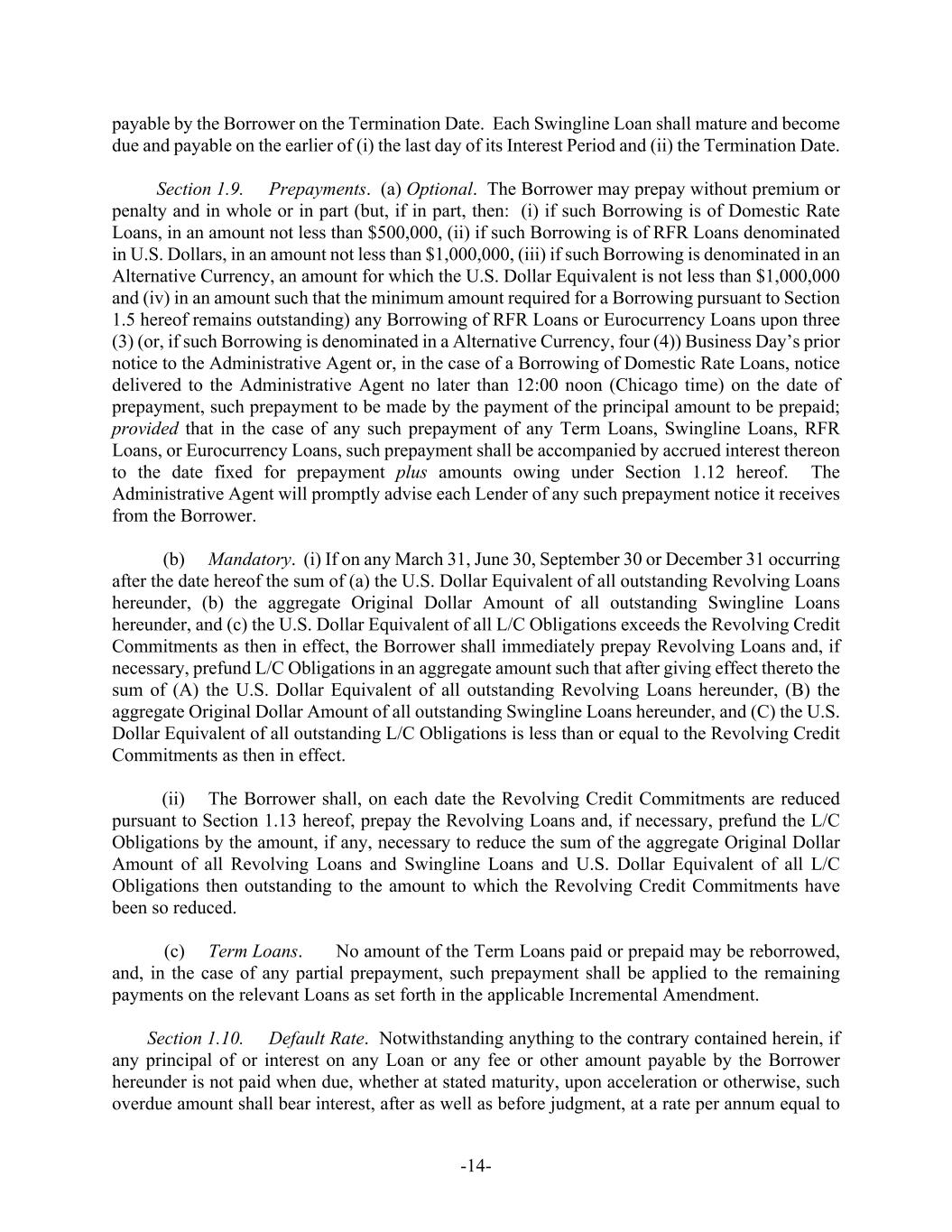 -14- payable by the Borrower on the Termination Date. Each Swingline Loan shall mature and become due and payable on the earlier of (i) the last day of its Interest Period and (ii) the Termination Date. Section 1.9. Prepayments. (a) Optional. The Borrower may prepay without premium or penalty and in whole or in part (but, if in part, then: (i) if such Borrowing is of Domestic Rate Loans, in an amount not less than $500,000, (ii) if such Borrowing is of RFR Loans denominated in U.S. Dollars, in an amount not less than $1,000,000, (iii) if such Borrowing is denominated in an Alternative Currency, an amount for which the U.S. Dollar Equivalent is not less than $1,000,000 and (iv) in an amount such that the minimum amount required for a Borrowing pursuant to Section 1.5 hereof remains outstanding) any Borrowing of RFR Loans or Eurocurrency Loans upon three (3) (or, if such Borrowing is denominated in a Alternative Currency, four (4)) Business Day’s prior notice to the Administrative Agent or, in the case of a Borrowing of Domestic Rate Loans, notice delivered to the Administrative Agent no later than 12:00 noon (Chicago time) on the date of prepayment, such prepayment to be made by the payment of the principal amount to be prepaid; provided that in the case of any such prepayment of any Term Loans, Swingline Loans, RFR Loans, or Eurocurrency Loans, such prepayment shall be accompanied by accrued interest thereon to the date fixed for prepayment plus amounts owing under Section 1.12 hereof. The Administrative Agent will promptly advise each Lender of any such prepayment notice it receives from the Borrower. (b) Mandatory. (i) If on any March 31, June 30, September 30 or December 31 occurring after the date hereof the sum of (a) the U.S. Dollar Equivalent of all outstanding Revolving Loans hereunder, (b) the aggregate Original Dollar Amount of all outstanding Swingline Loans hereunder, and (c) the U.S. Dollar Equivalent of all L/C Obligations exceeds the Revolving Credit Commitments as then in effect, the Borrower shall immediately prepay Revolving Loans and, if necessary, prefund L/C Obligations in an aggregate amount such that after giving effect thereto the sum of (A) the U.S. Dollar Equivalent of all outstanding Revolving Loans hereunder, (B) the aggregate Original Dollar Amount of all outstanding Swingline Loans hereunder, and (C) the U.S. Dollar Equivalent of all outstanding L/C Obligations is less than or equal to the Revolving Credit Commitments as then in effect. (ii) The Borrower shall, on each date the Revolving Credit Commitments are reduced pursuant to Section 1.13 hereof, prepay the Revolving Loans and, if necessary, prefund the L/C Obligations by the amount, if any, necessary to reduce the sum of the aggregate Original Dollar Amount of all Revolving Loans and Swingline Loans and U.S. Dollar Equivalent of all L/C Obligations then outstanding to the amount to which the Revolving Credit Commitments have been so reduced. (c) Term Loans. No amount of the Term Loans paid or prepaid may be reborrowed, and, in the case of any partial prepayment, such prepayment shall be applied to the remaining payments on the relevant Loans as set forth in the applicable Incremental Amendment. Section 1.10. Default Rate. Notwithstanding anything to the contrary contained herein, if any principal of or interest on any Loan or any fee or other amount payable by the Borrower hereunder is not paid when due, whether at stated maturity, upon acceleration or otherwise, such overdue amount shall bear interest, after as well as before judgment, at a rate per annum equal to