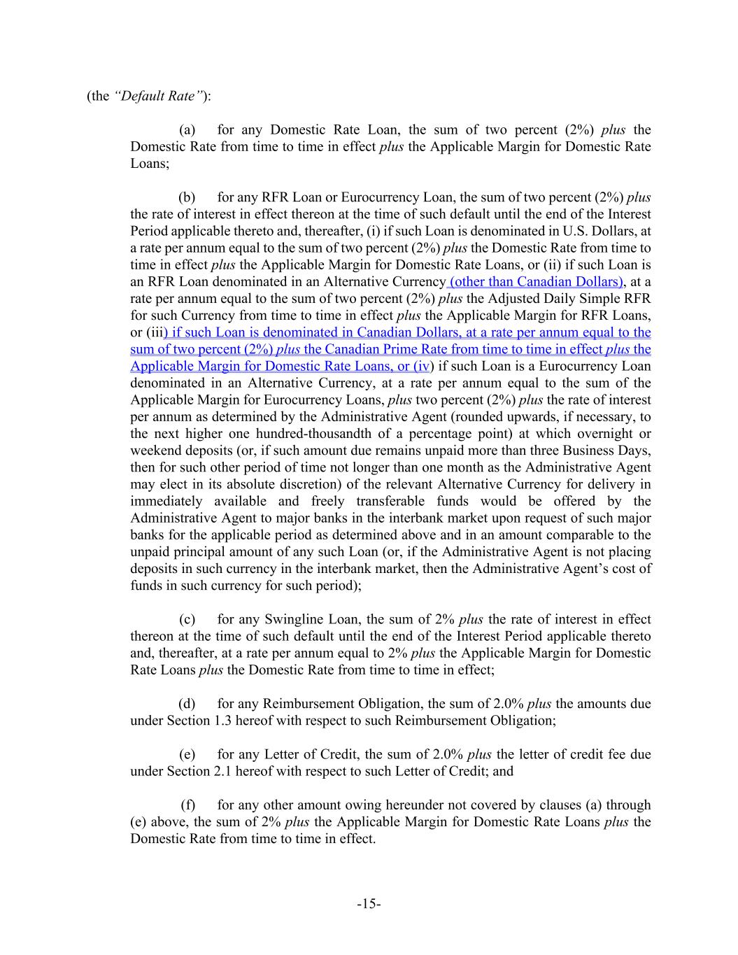 -15- (the “Default Rate”): (a) for any Domestic Rate Loan, the sum of two percent (2%) plus the Domestic Rate from time to time in effect plus the Applicable Margin for Domestic Rate Loans; (b) for any RFR Loan or Eurocurrency Loan, the sum of two percent (2%) plus the rate of interest in effect thereon at the time of such default until the end of the Interest Period applicable thereto and, thereafter, (i) if such Loan is denominated in U.S. Dollars, at a rate per annum equal to the sum of two percent (2%) plus the Domestic Rate from time to time in effect plus the Applicable Margin for Domestic Rate Loans, or (ii) if such Loan is an RFR Loan denominated in an Alternative Currency (other than Canadian Dollars), at a rate per annum equal to the sum of two percent (2%) plus the Adjusted Daily Simple RFR for such Currency from time to time in effect plus the Applicable Margin for RFR Loans, or (iii) if such Loan is denominated in Canadian Dollars, at a rate per annum equal to the sum of two percent (2%) plus the Canadian Prime Rate from time to time in effect plus the Applicable Margin for Domestic Rate Loans, or (iv) if such Loan is a Eurocurrency Loan denominated in an Alternative Currency, at a rate per annum equal to the sum of the Applicable Margin for Eurocurrency Loans, plus two percent (2%) plus the rate of interest per annum as determined by the Administrative Agent (rounded upwards, if necessary, to the next higher one hundred-thousandth of a percentage point) at which overnight or weekend deposits (or, if such amount due remains unpaid more than three Business Days, then for such other period of time not longer than one month as the Administrative Agent may elect in its absolute discretion) of the relevant Alternative Currency for delivery in immediately available and freely transferable funds would be offered by the Administrative Agent to major banks in the interbank market upon request of such major banks for the applicable period as determined above and in an amount comparable to the unpaid principal amount of any such Loan (or, if the Administrative Agent is not placing deposits in such currency in the interbank market, then the Administrative Agent’s cost of funds in such currency for such period); (c) for any Swingline Loan, the sum of 2% plus the rate of interest in effect thereon at the time of such default until the end of the Interest Period applicable thereto and, thereafter, at a rate per annum equal to 2% plus the Applicable Margin for Domestic Rate Loans plus the Domestic Rate from time to time in effect; (d) for any Reimbursement Obligation, the sum of 2.0% plus the amounts due under Section 1.3 hereof with respect to such Reimbursement Obligation; (e) for any Letter of Credit, the sum of 2.0% plus the letter of credit fee due under Section 2.1 hereof with respect to such Letter of Credit; and (f) for any other amount owing hereunder not covered by clauses (a) through (e) above, the sum of 2% plus the Applicable Margin for Domestic Rate Loans plus the Domestic Rate from time to time in effect.
