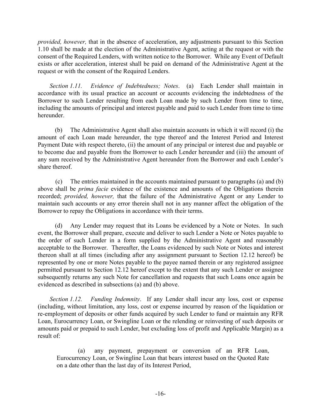-16- provided, however, that in the absence of acceleration, any adjustments pursuant to this Section 1.10 shall be made at the election of the Administrative Agent, acting at the request or with the consent of the Required Lenders, with written notice to the Borrower. While any Event of Default exists or after acceleration, interest shall be paid on demand of the Administrative Agent at the request or with the consent of the Required Lenders. Section 1.11. Evidence of Indebtedness; Notes. (a) Each Lender shall maintain in accordance with its usual practice an account or accounts evidencing the indebtedness of the Borrower to such Lender resulting from each Loan made by such Lender from time to time, including the amounts of principal and interest payable and paid to such Lender from time to time hereunder. (b) The Administrative Agent shall also maintain accounts in which it will record (i) the amount of each Loan made hereunder, the type thereof and the Interest Period and Interest Payment Date with respect thereto, (ii) the amount of any principal or interest due and payable or to become due and payable from the Borrower to each Lender hereunder and (iii) the amount of any sum received by the Administrative Agent hereunder from the Borrower and each Lender’s share thereof. (c) The entries maintained in the accounts maintained pursuant to paragraphs (a) and (b) above shall be prima facie evidence of the existence and amounts of the Obligations therein recorded; provided, however, that the failure of the Administrative Agent or any Lender to maintain such accounts or any error therein shall not in any manner affect the obligation of the Borrower to repay the Obligations in accordance with their terms. (d) Any Lender may request that its Loans be evidenced by a Note or Notes. In such event, the Borrower shall prepare, execute and deliver to such Lender a Note or Notes payable to the order of such Lender in a form supplied by the Administrative Agent and reasonably acceptable to the Borrower. Thereafter, the Loans evidenced by such Note or Notes and interest thereon shall at all times (including after any assignment pursuant to Section 12.12 hereof) be represented by one or more Notes payable to the payee named therein or any registered assignee permitted pursuant to Section 12.12 hereof except to the extent that any such Lender or assignee subsequently returns any such Note for cancellation and requests that such Loans once again be evidenced as described in subsections (a) and (b) above. Section 1.12. Funding Indemnity. If any Lender shall incur any loss, cost or expense (including, without limitation, any loss, cost or expense incurred by reason of the liquidation or re-employment of deposits or other funds acquired by such Lender to fund or maintain any RFR Loan, Eurocurrency Loan, or Swingline Loan or the relending or reinvesting of such deposits or amounts paid or prepaid to such Lender, but excluding loss of profit and Applicable Margin) as a result of: (a) any payment, prepayment or conversion of an RFR Loan, Eurocurrency Loan, or Swingline Loan that bears interest based on the Quoted Rate on a date other than the last day of its Interest Period,