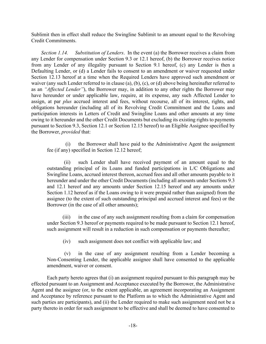 -18- Sublimit then in effect shall reduce the Swingline Sublimit to an amount equal to the Revolving Credit Commitments. Section 1.14. Substitution of Lenders. In the event (a) the Borrower receives a claim from any Lender for compensation under Section 9.3 or 12.1 hereof, (b) the Borrower receives notice from any Lender of any illegality pursuant to Section 9.1 hereof, (c) any Lender is then a Defaulting Lender, or (d) a Lender fails to consent to an amendment or waiver requested under Section 12.13 hereof at a time when the Required Lenders have approved such amendment or waiver (any such Lender referred to in clause (a), (b), (c), or (d) above being hereinafter referred to as an “Affected Lender”), the Borrower may, in addition to any other rights the Borrower may have hereunder or under applicable law, require, at its expense, any such Affected Lender to assign, at par plus accrued interest and fees, without recourse, all of its interest, rights, and obligations hereunder (including all of its Revolving Credit Commitment and the Loans and participation interests in Letters of Credit and Swingline Loans and other amounts at any time owing to it hereunder and the other Credit Documents but excluding its existing rights to payments pursuant to Section 9.3, Section 12.1 or Section 12.15 hereof) to an Eligible Assignee specified by the Borrower, provided that: (i) the Borrower shall have paid to the Administrative Agent the assignment fee (if any) specified in Section 12.12 hereof; (ii) such Lender shall have received payment of an amount equal to the outstanding principal of its Loans and funded participations in L/C Obligations and Swingline Loans, accrued interest thereon, accrued fees and all other amounts payable to it hereunder and under the other Credit Documents (including all amounts under Sections 9.3 and 12.1 hereof and any amounts under Section 12.15 hereof and any amounts under Section 1.12 hereof as if the Loans owing to it were prepaid rather than assigned) from the assignee (to the extent of such outstanding principal and accrued interest and fees) or the Borrower (in the case of all other amounts); (iii) in the case of any such assignment resulting from a claim for compensation under Section 9.3 hereof or payments required to be made pursuant to Section 12.1 hereof, such assignment will result in a reduction in such compensation or payments thereafter; (iv) such assignment does not conflict with applicable law; and (v) in the case of any assignment resulting from a Lender becoming a Non-Consenting Lender, the applicable assignee shall have consented to the applicable amendment, waiver or consent. Each party hereto agrees that (i) an assignment required pursuant to this paragraph may be effected pursuant to an Assignment and Acceptance executed by the Borrower, the Administrative Agent and the assignee (or, to the extent applicable, an agreement incorporating an Assignment and Acceptance by reference pursuant to the Platform as to which the Administrative Agent and such parties are participants), and (ii) the Lender required to make such assignment need not be a party thereto in order for such assignment to be effective and shall be deemed to have consented to