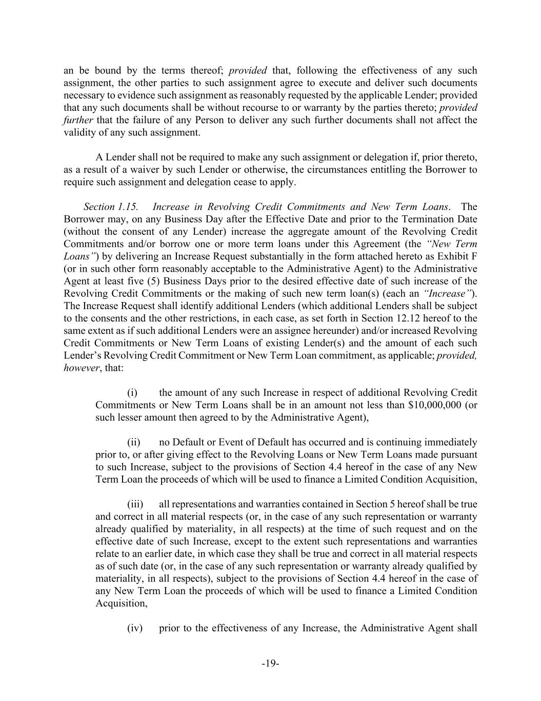-19- an be bound by the terms thereof; provided that, following the effectiveness of any such assignment, the other parties to such assignment agree to execute and deliver such documents necessary to evidence such assignment as reasonably requested by the applicable Lender; provided that any such documents shall be without recourse to or warranty by the parties thereto; provided further that the failure of any Person to deliver any such further documents shall not affect the validity of any such assignment. A Lender shall not be required to make any such assignment or delegation if, prior thereto, as a result of a waiver by such Lender or otherwise, the circumstances entitling the Borrower to require such assignment and delegation cease to apply. Section 1.15. Increase in Revolving Credit Commitments and New Term Loans. The Borrower may, on any Business Day after the Effective Date and prior to the Termination Date (without the consent of any Lender) increase the aggregate amount of the Revolving Credit Commitments and/or borrow one or more term loans under this Agreement (the “New Term Loans”) by delivering an Increase Request substantially in the form attached hereto as Exhibit F (or in such other form reasonably acceptable to the Administrative Agent) to the Administrative Agent at least five (5) Business Days prior to the desired effective date of such increase of the Revolving Credit Commitments or the making of such new term loan(s) (each an “Increase”). The Increase Request shall identify additional Lenders (which additional Lenders shall be subject to the consents and the other restrictions, in each case, as set forth in Section 12.12 hereof to the same extent as if such additional Lenders were an assignee hereunder) and/or increased Revolving Credit Commitments or New Term Loans of existing Lender(s) and the amount of each such Lender’s Revolving Credit Commitment or New Term Loan commitment, as applicable; provided, however, that: (i) the amount of any such Increase in respect of additional Revolving Credit Commitments or New Term Loans shall be in an amount not less than $10,000,000 (or such lesser amount then agreed to by the Administrative Agent), (ii) no Default or Event of Default has occurred and is continuing immediately prior to, or after giving effect to the Revolving Loans or New Term Loans made pursuant to such Increase, subject to the provisions of Section 4.4 hereof in the case of any New Term Loan the proceeds of which will be used to finance a Limited Condition Acquisition, (iii) all representations and warranties contained in Section 5 hereof shall be true and correct in all material respects (or, in the case of any such representation or warranty already qualified by materiality, in all respects) at the time of such request and on the effective date of such Increase, except to the extent such representations and warranties relate to an earlier date, in which case they shall be true and correct in all material respects as of such date (or, in the case of any such representation or warranty already qualified by materiality, in all respects), subject to the provisions of Section 4.4 hereof in the case of any New Term Loan the proceeds of which will be used to finance a Limited Condition Acquisition, (iv) prior to the effectiveness of any Increase, the Administrative Agent shall