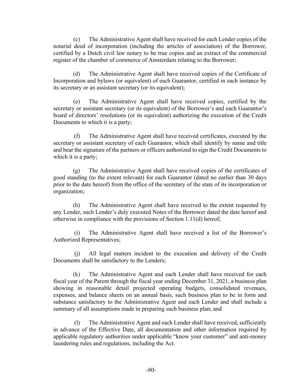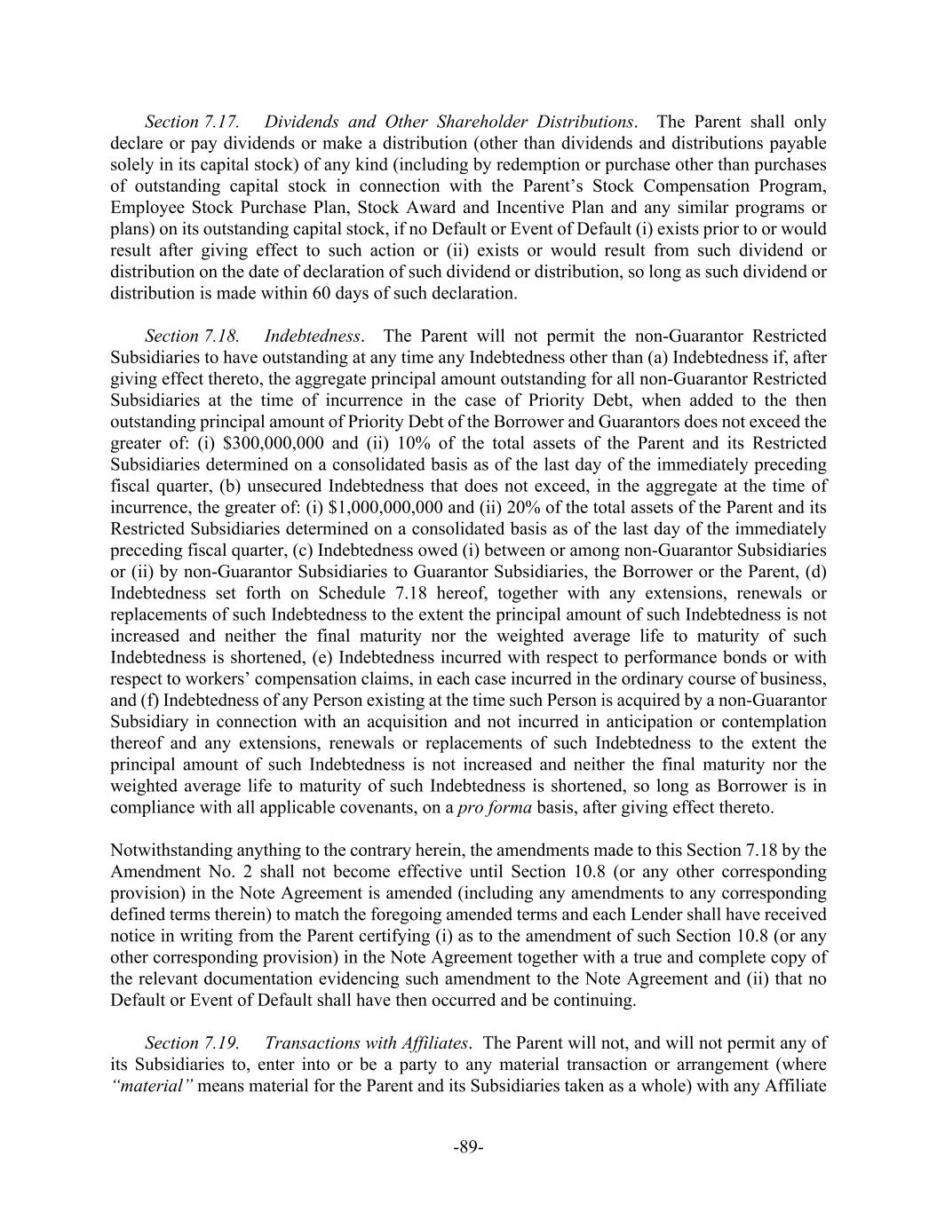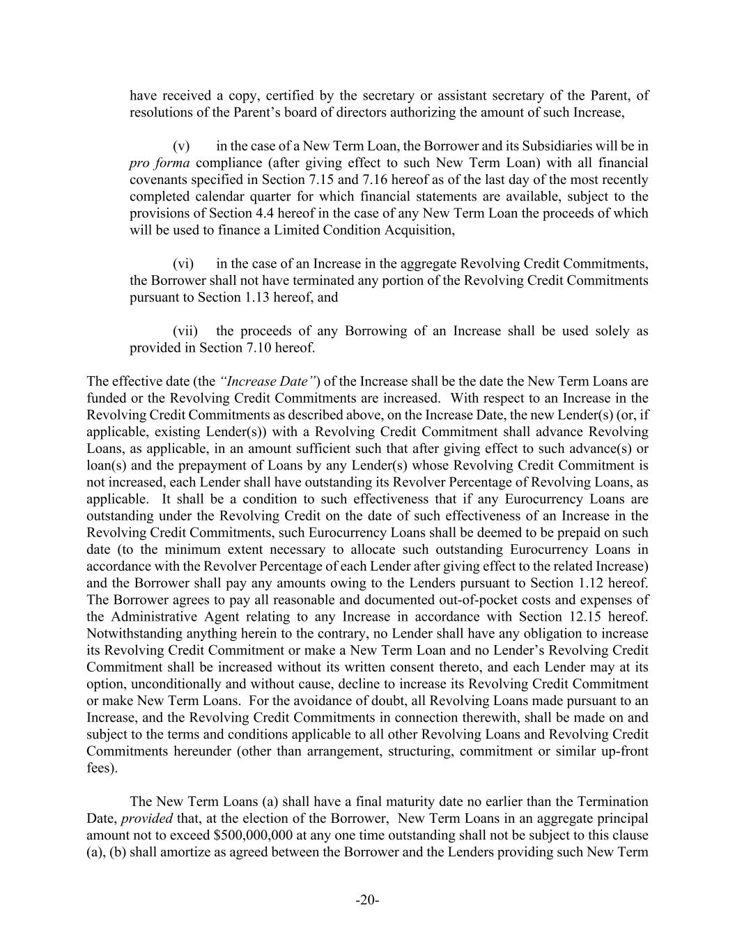 -20- have received a copy, certified by the secretary or assistant secretary of the Parent, of resolutions of the Parent’s board of directors authorizing the amount of such Increase, (v) in the case of a New Term Loan, the Borrower and its Subsidiaries will be in pro forma compliance (after giving effect to such New Term Loan) with all financial covenants specified in Section 7.15 and 7.16 hereof as of the last day of the most recently completed calendar quarter for which financial statements are available, subject to the provisions of Section 4.4 hereof in the case of any New Term Loan the proceeds of which will be used to finance a Limited Condition Acquisition, (vi) in the case of an Increase in the aggregate Revolving Credit Commitments, the Borrower shall not have terminated any portion of the Revolving Credit Commitments pursuant to Section 1.13 hereof, and (vii) the proceeds of any Borrowing of an Increase shall be used solely as provided in Section 7.10 hereof. The effective date (the “Increase Date”) of the Increase shall be the date the New Term Loans are funded or the Revolving Credit Commitments are increased. With respect to an Increase in the Revolving Credit Commitments as described above, on the Increase Date, the new Lender(s) (or, if applicable, existing Lender(s)) with a Revolving Credit Commitment shall advance Revolving Loans, as applicable, in an amount sufficient such that after giving effect to such advance(s) or loan(s) and the prepayment of Loans by any Lender(s) whose Revolving Credit Commitment is not increased, each Lender shall have outstanding its Revolver Percentage of Revolving Loans, as applicable. It shall be a condition to such effectiveness that if any Eurocurrency Loans are outstanding under the Revolving Credit on the date of such effectiveness of an Increase in the Revolving Credit Commitments, such Eurocurrency Loans shall be deemed to be prepaid on such date (to the minimum extent necessary to allocate such outstanding Eurocurrency Loans in accordance with the Revolver Percentage of each Lender after giving effect to the related Increase) and the Borrower shall pay any amounts owing to the Lenders pursuant to Section 1.12 hereof. The Borrower agrees to pay all reasonable and documented out-of-pocket costs and expenses of the Administrative Agent relating to any Increase in accordance with Section 12.15 hereof. Notwithstanding anything herein to the contrary, no Lender shall have any obligation to increase its Revolving Credit Commitment or make a New Term Loan and no Lender’s Revolving Credit Commitment shall be increased without its written consent thereto, and each Lender may at its option, unconditionally and without cause, decline to increase its Revolving Credit Commitment or make New Term Loans. For the avoidance of doubt, all Revolving Loans made pursuant to an Increase, and the Revolving Credit Commitments in connection therewith, shall be made on and subject to the terms and conditions applicable to all other Revolving Loans and Revolving Credit Commitments hereunder (other than arrangement, structuring, commitment or similar up-front fees). The New Term Loans (a) shall have a final maturity date no earlier than the Termination Date, provided that, at the election of the Borrower, New Term Loans in an aggregate principal amount not to exceed $500,000,000 at any one time outstanding shall not be subject to this clause (a), (b) shall amortize as agreed between the Borrower and the Lenders providing such New Term
