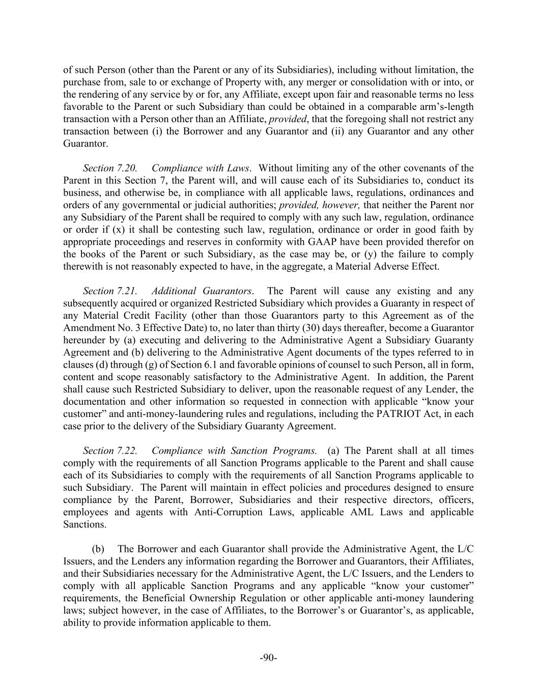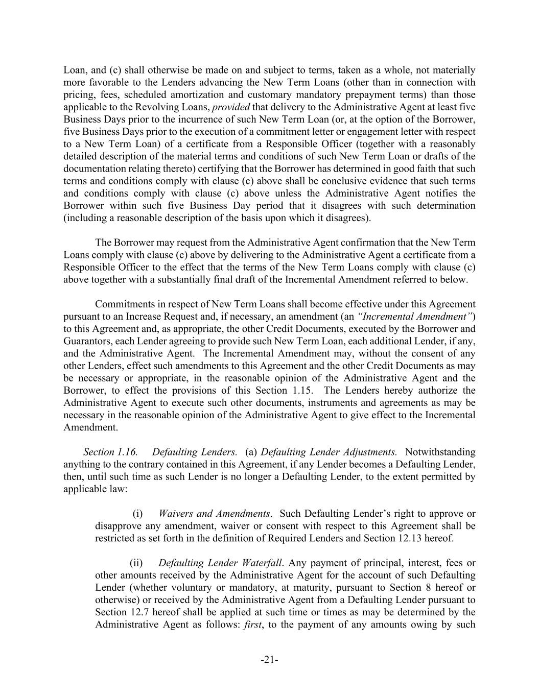 -21- Loan, and (c) shall otherwise be made on and subject to terms, taken as a whole, not materially more favorable to the Lenders advancing the New Term Loans (other than in connection with pricing, fees, scheduled amortization and customary mandatory prepayment terms) than those applicable to the Revolving Loans, provided that delivery to the Administrative Agent at least five Business Days prior to the incurrence of such New Term Loan (or, at the option of the Borrower, five Business Days prior to the execution of a commitment letter or engagement letter with respect to a New Term Loan) of a certificate from a Responsible Officer (together with a reasonably detailed description of the material terms and conditions of such New Term Loan or drafts of the documentation relating thereto) certifying that the Borrower has determined in good faith that such terms and conditions comply with clause (c) above shall be conclusive evidence that such terms and conditions comply with clause (c) above unless the Administrative Agent notifies the Borrower within such five Business Day period that it disagrees with such determination (including a reasonable description of the basis upon which it disagrees). The Borrower may request from the Administrative Agent confirmation that the New Term Loans comply with clause (c) above by delivering to the Administrative Agent a certificate from a Responsible Officer to the effect that the terms of the New Term Loans comply with clause (c) above together with a substantially final draft of the Incremental Amendment referred to below. Commitments in respect of New Term Loans shall become effective under this Agreement pursuant to an Increase Request and, if necessary, an amendment (an “Incremental Amendment”) to this Agreement and, as appropriate, the other Credit Documents, executed by the Borrower and Guarantors, each Lender agreeing to provide such New Term Loan, each additional Lender, if any, and the Administrative Agent. The Incremental Amendment may, without the consent of any other Lenders, effect such amendments to this Agreement and the other Credit Documents as may be necessary or appropriate, in the reasonable opinion of the Administrative Agent and the Borrower, to effect the provisions of this Section 1.15. The Lenders hereby authorize the Administrative Agent to execute such other documents, instruments and agreements as may be necessary in the reasonable opinion of the Administrative Agent to give effect to the Incremental Amendment. Section 1.16. Defaulting Lenders. (a) Defaulting Lender Adjustments. Notwithstanding anything to the contrary contained in this Agreement, if any Lender becomes a Defaulting Lender, then, until such time as such Lender is no longer a Defaulting Lender, to the extent permitted by applicable law: (i) Waivers and Amendments. Such Defaulting Lender’s right to approve or disapprove any amendment, waiver or consent with respect to this Agreement shall be restricted as set forth in the definition of Required Lenders and Section 12.13 hereof. (ii) Defaulting Lender Waterfall. Any payment of principal, interest, fees or other amounts received by the Administrative Agent for the account of such Defaulting Lender (whether voluntary or mandatory, at maturity, pursuant to Section 8 hereof or otherwise) or received by the Administrative Agent from a Defaulting Lender pursuant to Section 12.7 hereof shall be applied at such time or times as may be determined by the Administrative Agent as follows: first, to the payment of any amounts owing by such