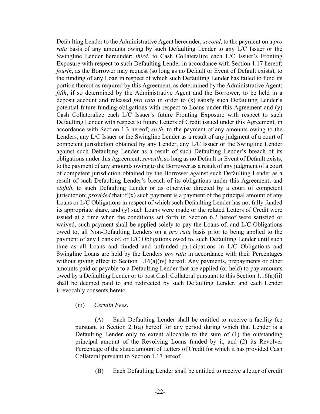 -22- Defaulting Lender to the Administrative Agent hereunder; second, to the payment on a pro rata basis of any amounts owing by such Defaulting Lender to any L/C Issuer or the Swingline Lender hereunder; third, to Cash Collateralize each L/C Issuer’s Fronting Exposure with respect to such Defaulting Lender in accordance with Section 1.17 hereof; fourth, as the Borrower may request (so long as no Default or Event of Default exists), to the funding of any Loan in respect of which such Defaulting Lender has failed to fund its portion thereof as required by this Agreement, as determined by the Administrative Agent; fifth, if so determined by the Administrative Agent and the Borrower, to be held in a deposit account and released pro rata in order to (x) satisfy such Defaulting Lender’s potential future funding obligations with respect to Loans under this Agreement and (y) Cash Collateralize each L/C Issuer’s future Fronting Exposure with respect to such Defaulting Lender with respect to future Letters of Credit issued under this Agreement, in accordance with Section 1.3 hereof; sixth, to the payment of any amounts owing to the Lenders, any L/C Issuer or the Swingline Lender as a result of any judgment of a court of competent jurisdiction obtained by any Lender, any L/C Issuer or the Swingline Lender against such Defaulting Lender as a result of such Defaulting Lender’s breach of its obligations under this Agreement; seventh, so long as no Default or Event of Default exists, to the payment of any amounts owing to the Borrower as a result of any judgment of a court of competent jurisdiction obtained by the Borrower against such Defaulting Lender as a result of such Defaulting Lender’s breach of its obligations under this Agreement; and eighth, to such Defaulting Lender or as otherwise directed by a court of competent jurisdiction; provided that if (x) such payment is a payment of the principal amount of any Loans or L/C Obligations in respect of which such Defaulting Lender has not fully funded its appropriate share, and (y) such Loans were made or the related Letters of Credit were issued at a time when the conditions set forth in Section 6.2 hereof were satisfied or waived, such payment shall be applied solely to pay the Loans of, and L/C Obligations owed to, all Non-Defaulting Lenders on a pro rata basis prior to being applied to the payment of any Loans of, or L/C Obligations owed to, such Defaulting Lender until such time as all Loans and funded and unfunded participations in L/C Obligations and Swingline Loans are held by the Lenders pro rata in accordance with their Percentages without giving effect to Section 1.16(a)(iv) hereof. Any payments, prepayments or other amounts paid or payable to a Defaulting Lender that are applied (or held) to pay amounts owed by a Defaulting Lender or to post Cash Collateral pursuant to this Section 1.16(a)(ii) shall be deemed paid to and redirected by such Defaulting Lender, and each Lender irrevocably consents hereto. (iii) Certain Fees. (A) Each Defaulting Lender shall be entitled to receive a facility fee pursuant to Section 2.1(a) hereof for any period during which that Lender is a Defaulting Lender only to extent allocable to the sum of (1) the outstanding principal amount of the Revolving Loans funded by it, and (2) its Revolver Percentage of the stated amount of Letters of Credit for which it has provided Cash Collateral pursuant to Section 1.17 hereof. (B) Each Defaulting Lender shall be entitled to receive a letter of credit