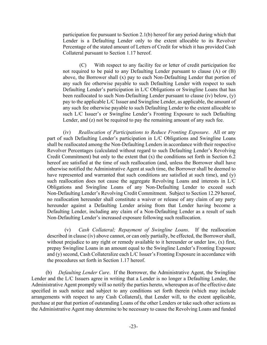 -23- participation fee pursuant to Section 2.1(b) hereof for any period during which that Lender is a Defaulting Lender only to the extent allocable to its Revolver Percentage of the stated amount of Letters of Credit for which it has provided Cash Collateral pursuant to Section 1.17 hereof. (C) With respect to any facility fee or letter of credit participation fee not required to be paid to any Defaulting Lender pursuant to clause (A) or (B) above, the Borrower shall (x) pay to each Non-Defaulting Lender that portion of any such fee otherwise payable to such Defaulting Lender with respect to such Defaulting Lender’s participation in L/C Obligations or Swingline Loans that has been reallocated to such Non-Defaulting Lender pursuant to clause (iv) below, (y) pay to the applicable L/C Issuer and Swingline Lender, as applicable, the amount of any such fee otherwise payable to such Defaulting Lender to the extent allocable to such L/C Issuer’s or Swingline Lender’s Fronting Exposure to such Defaulting Lender, and (z) not be required to pay the remaining amount of any such fee. (iv) Reallocation of Participations to Reduce Fronting Exposure. All or any part of such Defaulting Lender’s participation in L/C Obligations and Swingline Loans shall be reallocated among the Non-Defaulting Lenders in accordance with their respective Revolver Percentages (calculated without regard to such Defaulting Lender’s Revolving Credit Commitment) but only to the extent that (x) the conditions set forth in Section 6.2 hereof are satisfied at the time of such reallocation (and, unless the Borrower shall have otherwise notified the Administrative Agent at such time, the Borrower shall be deemed to have represented and warranted that such conditions are satisfied at such time), and (y) such reallocation does not cause the aggregate Revolving Loans and interests in L/C Obligations and Swingline Loans of any Non-Defaulting Lender to exceed such Non-Defaulting Lender’s Revolving Credit Commitment. Subject to Section 12.29 hereof, no reallocation hereunder shall constitute a waiver or release of any claim of any party hereunder against a Defaulting Lender arising from that Lender having become a Defaulting Lender, including any claim of a Non-Defaulting Lender as a result of such Non-Defaulting Lender’s increased exposure following such reallocation. (v) Cash Collateral; Repayment of Swingline Loans. If the reallocation described in clause (iv) above cannot, or can only partially, be effected, the Borrower shall, without prejudice to any right or remedy available to it hereunder or under law, (x) first, prepay Swingline Loans in an amount equal to the Swingline Lender’s Fronting Exposure and (y) second, Cash Collateralize each L/C Issuer’s Fronting Exposure in accordance with the procedures set forth in Section 1.17 hereof. (b) Defaulting Lender Cure. If the Borrower, the Administrative Agent, the Swingline Lender and the L/C Issuers agree in writing that a Lender is no longer a Defaulting Lender, the Administrative Agent promptly will so notify the parties hereto, whereupon as of the effective date specified in such notice and subject to any conditions set forth therein (which may include arrangements with respect to any Cash Collateral), that Lender will, to the extent applicable, purchase at par that portion of outstanding Loans of the other Lenders or take such other actions as the Administrative Agent may determine to be necessary to cause the Revolving Loans and funded