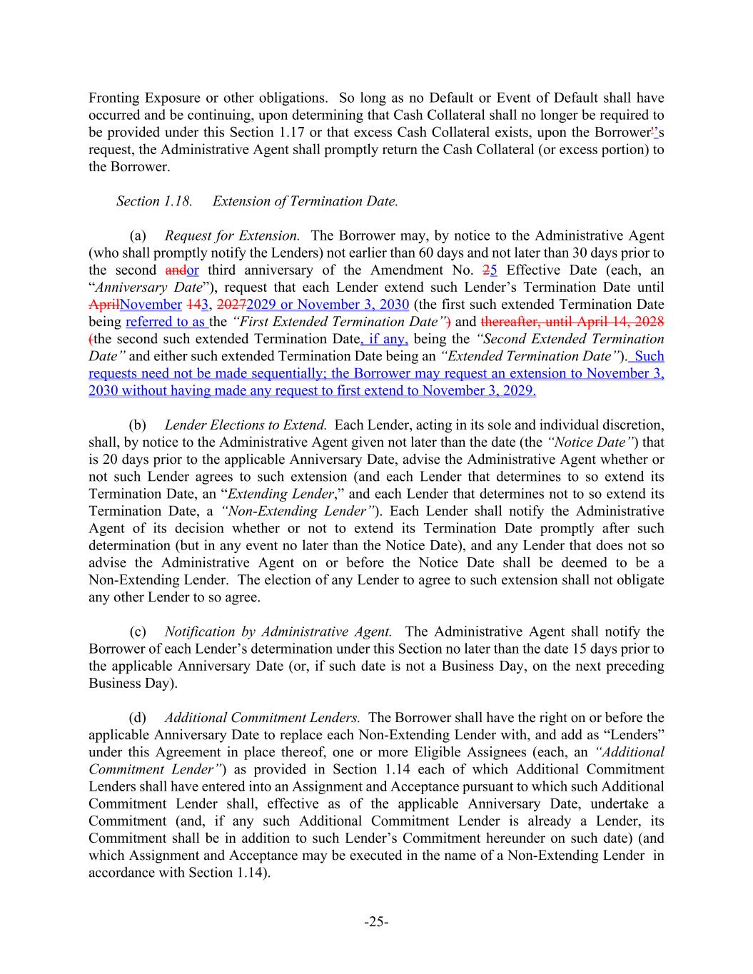 -25- Fronting Exposure or other obligations. So long as no Default or Event of Default shall have occurred and be continuing, upon determining that Cash Collateral shall no longer be required to be provided under this Section 1.17 or that excess Cash Collateral exists, upon the Borrower'’s request, the Administrative Agent shall promptly return the Cash Collateral (or excess portion) to the Borrower. Section 1.18. Extension of Termination Date. (a) Request for Extension. The Borrower may, by notice to the Administrative Agent (who shall promptly notify the Lenders) not earlier than 60 days and not later than 30 days prior to the second andor third anniversary of the Amendment No. 25 Effective Date (each, an “Anniversary Date”), request that each Lender extend such Lender’s Termination Date until AprilNovember 143, 20272029 or November 3, 2030 (the first such extended Termination Date being referred to as the “First Extended Termination Date”) and thereafter, until April 14, 2028 (the second such extended Termination Date, if any, being the “Second Extended Termination Date” and either such extended Termination Date being an “Extended Termination Date”). Such requests need not be made sequentially; the Borrower may request an extension to November 3, 2030 without having made any request to first extend to November 3, 2029. (b) Lender Elections to Extend. Each Lender, acting in its sole and individual discretion, shall, by notice to the Administrative Agent given not later than the date (the “Notice Date”) that is 20 days prior to the applicable Anniversary Date, advise the Administrative Agent whether or not such Lender agrees to such extension (and each Lender that determines to so extend its Termination Date, an “Extending Lender,” and each Lender that determines not to so extend its Termination Date, a “Non-Extending Lender”). Each Lender shall notify the Administrative Agent of its decision whether or not to extend its Termination Date promptly after such determination (but in any event no later than the Notice Date), and any Lender that does not so advise the Administrative Agent on or before the Notice Date shall be deemed to be a Non-Extending Lender. The election of any Lender to agree to such extension shall not obligate any other Lender to so agree. (c) Notification by Administrative Agent. The Administrative Agent shall notify the Borrower of each Lender’s determination under this Section no later than the date 15 days prior to the applicable Anniversary Date (or, if such date is not a Business Day, on the next preceding Business Day). (d) Additional Commitment Lenders. The Borrower shall have the right on or before the applicable Anniversary Date to replace each Non-Extending Lender with, and add as “Lenders” under this Agreement in place thereof, one or more Eligible Assignees (each, an “Additional Commitment Lender”) as provided in Section 1.14 each of which Additional Commitment Lenders shall have entered into an Assignment and Acceptance pursuant to which such Additional Commitment Lender shall, effective as of the applicable Anniversary Date, undertake a Commitment (and, if any such Additional Commitment Lender is already a Lender, its Commitment shall be in addition to such Lender’s Commitment hereunder on such date) (and which Assignment and Acceptance may be executed in the name of a Non-Extending Lender in accordance with Section 1.14).