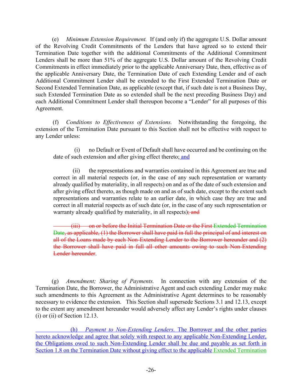 -26- (e) Minimum Extension Requirement. If (and only if) the aggregate U.S. Dollar amount of the Revolving Credit Commitments of the Lenders that have agreed so to extend their Termination Date together with the additional Commitments of the Additional Commitment Lenders shall be more than 51% of the aggregate U.S. Dollar amount of the Revolving Credit Commitments in effect immediately prior to the applicable Anniversary Date, then, effective as of the applicable Anniversary Date, the Termination Date of each Extending Lender and of each Additional Commitment Lender shall be extended to the First Extended Termination Date or Second Extended Termination Date, as applicable (except that, if such date is not a Business Day, such Extended Termination Date as so extended shall be the next preceding Business Day) and each Additional Commitment Lender shall thereupon become a “Lender” for all purposes of this Agreement. (f) Conditions to Effectiveness of Extensions. Notwithstanding the foregoing, the extension of the Termination Date pursuant to this Section shall not be effective with respect to any Lender unless: (i) no Default or Event of Default shall have occurred and be continuing on the date of such extension and after giving effect thereto; and (ii) the representations and warranties contained in this Agreement are true and correct in all material respects (or, in the case of any such representation or warranty already qualified by materiality, in all respects) on and as of the date of such extension and after giving effect thereto, as though made on and as of such date, except to the extent such representations and warranties relate to an earlier date, in which case they are true and correct in all material respects as of such date (or, in the case of any such representation or warranty already qualified by materiality, in all respects); and (iii) on or before the Initial Termination Date or the First Extended Termination Date, as applicable, (1) the Borrower shall have paid in full the principal of and interest on all of the Loans made by each Non-Extending Lender to the Borrower hereunder and (2) the Borrower shall have paid in full all other amounts owing to such Non-Extending Lender hereunder. (g) Amendment; Sharing of Payments. In connection with any extension of the Termination Date, the Borrower, the Administrative Agent and each extending Lender may make such amendments to this Agreement as the Administrative Agent determines to be reasonably necessary to evidence the extension. This Section shall supersede Sections 3.1 and 12.13, except to the extent any amendment hereunder would adversely affect any Lender’s rights under clauses (i) or (ii) of Section 12.13. (h) Payment to Non-Extending Lenders. The Borrower and the other parties hereto acknowledge and agree that solely with respect to any applicable Non-Extending Lender, the Obligations owed to such Non-Extending Lender shall be due and payable as set forth in Section 1.8 on the Termination Date without giving effect to the applicable Extended Termination