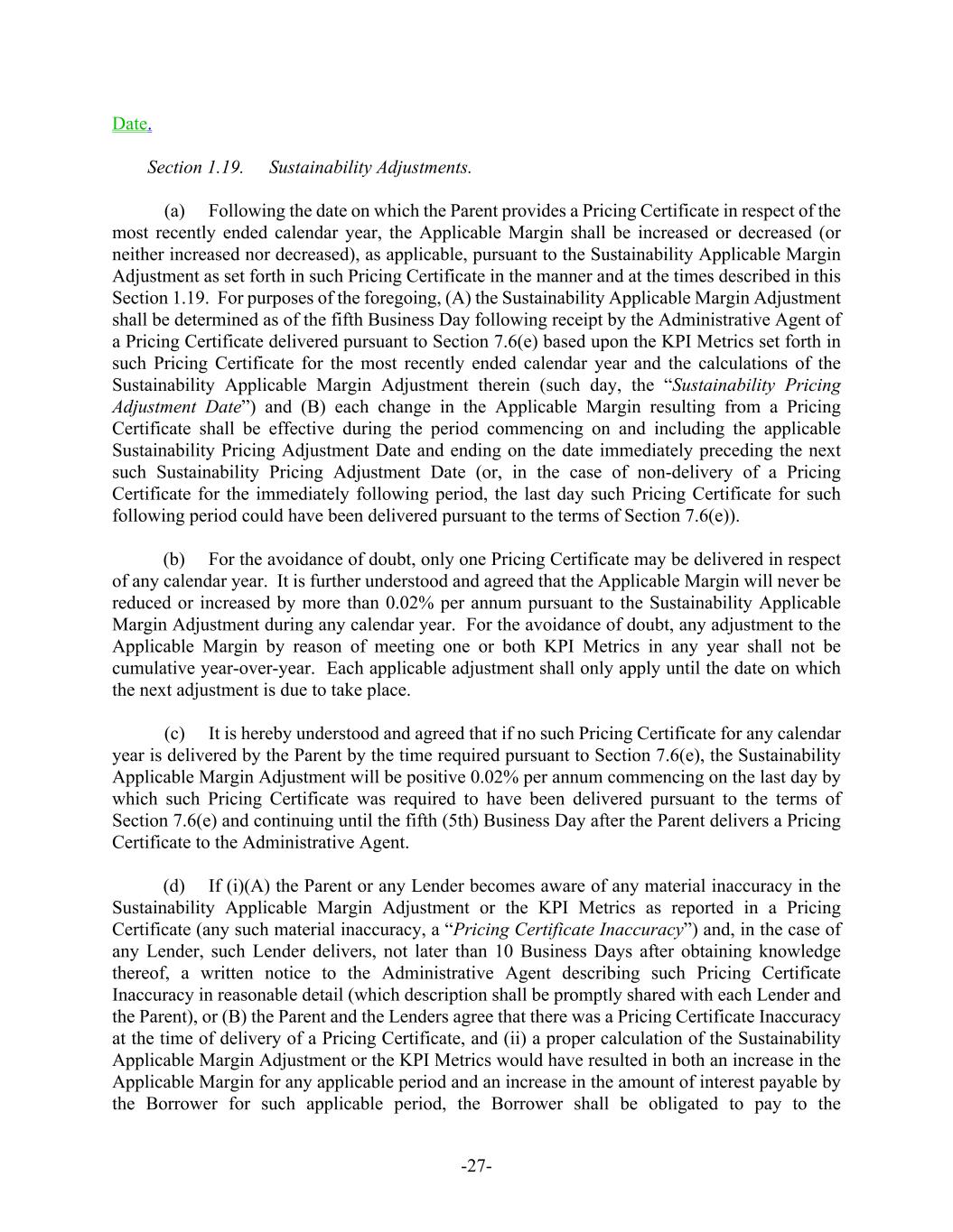 -27- Date. Section 1.19. Sustainability Adjustments. (a) Following the date on which the Parent provides a Pricing Certificate in respect of the most recently ended calendar year, the Applicable Margin shall be increased or decreased (or neither increased nor decreased), as applicable, pursuant to the Sustainability Applicable Margin Adjustment as set forth in such Pricing Certificate in the manner and at the times described in this Section 1.19. For purposes of the foregoing, (A) the Sustainability Applicable Margin Adjustment shall be determined as of the fifth Business Day following receipt by the Administrative Agent of a Pricing Certificate delivered pursuant to Section 7.6(e) based upon the KPI Metrics set forth in such Pricing Certificate for the most recently ended calendar year and the calculations of the Sustainability Applicable Margin Adjustment therein (such day, the “Sustainability Pricing Adjustment Date”) and (B) each change in the Applicable Margin resulting from a Pricing Certificate shall be effective during the period commencing on and including the applicable Sustainability Pricing Adjustment Date and ending on the date immediately preceding the next such Sustainability Pricing Adjustment Date (or, in the case of non-delivery of a Pricing Certificate for the immediately following period, the last day such Pricing Certificate for such following period could have been delivered pursuant to the terms of Section 7.6(e)). (b) For the avoidance of doubt, only one Pricing Certificate may be delivered in respect of any calendar year. It is further understood and agreed that the Applicable Margin will never be reduced or increased by more than 0.02% per annum pursuant to the Sustainability Applicable Margin Adjustment during any calendar year. For the avoidance of doubt, any adjustment to the Applicable Margin by reason of meeting one or both KPI Metrics in any year shall not be cumulative year-over-year. Each applicable adjustment shall only apply until the date on which the next adjustment is due to take place. (c) It is hereby understood and agreed that if no such Pricing Certificate for any calendar year is delivered by the Parent by the time required pursuant to Section 7.6(e), the Sustainability Applicable Margin Adjustment will be positive 0.02% per annum commencing on the last day by which such Pricing Certificate was required to have been delivered pursuant to the terms of Section 7.6(e) and continuing until the fifth (5th) Business Day after the Parent delivers a Pricing Certificate to the Administrative Agent. (d) If (i)(A) the Parent or any Lender becomes aware of any material inaccuracy in the Sustainability Applicable Margin Adjustment or the KPI Metrics as reported in a Pricing Certificate (any such material inaccuracy, a “Pricing Certificate Inaccuracy”) and, in the case of any Lender, such Lender delivers, not later than 10 Business Days after obtaining knowledge thereof, a written notice to the Administrative Agent describing such Pricing Certificate Inaccuracy in reasonable detail (which description shall be promptly shared with each Lender and the Parent), or (B) the Parent and the Lenders agree that there was a Pricing Certificate Inaccuracy at the time of delivery of a Pricing Certificate, and (ii) a proper calculation of the Sustainability Applicable Margin Adjustment or the KPI Metrics would have resulted in both an increase in the Applicable Margin for any applicable period and an increase in the amount of interest payable by the Borrower for such applicable period, the Borrower shall be obligated to pay to the