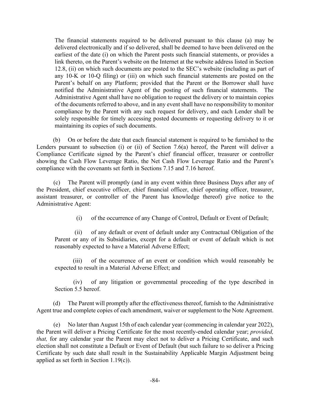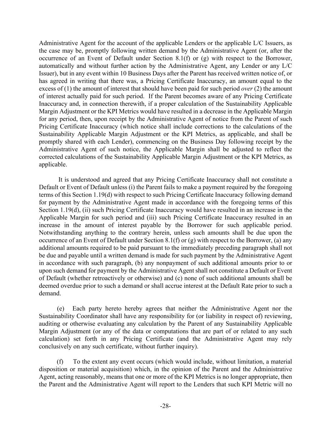 -28- Administrative Agent for the account of the applicable Lenders or the applicable L/C Issuers, as the case may be, promptly following written demand by the Administrative Agent (or, after the occurrence of an Event of Default under Section 8.1(f) or (g) with respect to the Borrower, automatically and without further action by the Administrative Agent, any Lender or any L/C Issuer), but in any event within 10 Business Days after the Parent has received written notice of, or has agreed in writing that there was, a Pricing Certificate Inaccuracy, an amount equal to the excess of (1) the amount of interest that should have been paid for such period over (2) the amount of interest actually paid for such period. If the Parent becomes aware of any Pricing Certificate Inaccuracy and, in connection therewith, if a proper calculation of the Sustainability Applicable Margin Adjustment or the KPI Metrics would have resulted in a decrease in the Applicable Margin for any period, then, upon receipt by the Administrative Agent of notice from the Parent of such Pricing Certificate Inaccuracy (which notice shall include corrections to the calculations of the Sustainability Applicable Margin Adjustment or the KPI Metrics, as applicable, and shall be promptly shared with each Lender), commencing on the Business Day following receipt by the Administrative Agent of such notice, the Applicable Margin shall be adjusted to reflect the corrected calculations of the Sustainability Applicable Margin Adjustment or the KPI Metrics, as applicable. It is understood and agreed that any Pricing Certificate Inaccuracy shall not constitute a Default or Event of Default unless (i) the Parent fails to make a payment required by the foregoing terms of this Section 1.19(d) with respect to such Pricing Certificate Inaccuracy following demand for payment by the Administrative Agent made in accordance with the foregoing terms of this Section 1.19(d), (ii) such Pricing Certificate Inaccuracy would have resulted in an increase in the Applicable Margin for such period and (iii) such Pricing Certificate Inaccuracy resulted in an increase in the amount of interest payable by the Borrower for such applicable period. Notwithstanding anything to the contrary herein, unless such amounts shall be due upon the occurrence of an Event of Default under Section 8.1(f) or (g) with respect to the Borrower, (a) any additional amounts required to be paid pursuant to the immediately preceding paragraph shall not be due and payable until a written demand is made for such payment by the Administrative Agent in accordance with such paragraph, (b) any nonpayment of such additional amounts prior to or upon such demand for payment by the Administrative Agent shall not constitute a Default or Event of Default (whether retroactively or otherwise) and (c) none of such additional amounts shall be deemed overdue prior to such a demand or shall accrue interest at the Default Rate prior to such a demand. (e) Each party hereto hereby agrees that neither the Administrative Agent nor the Sustainability Coordinator shall have any responsibility for (or liability in respect of) reviewing, auditing or otherwise evaluating any calculation by the Parent of any Sustainability Applicable Margin Adjustment (or any of the data or computations that are part of or related to any such calculation) set forth in any Pricing Certificate (and the Administrative Agent may rely conclusively on any such certificate, without further inquiry). (f) To the extent any event occurs (which would include, without limitation, a material disposition or material acquisition) which, in the opinion of the Parent and the Administrative Agent, acting reasonably, means that one or more of the KPI Metrics is no longer appropriate, then the Parent and the Administrative Agent will report to the Lenders that such KPI Metric will no