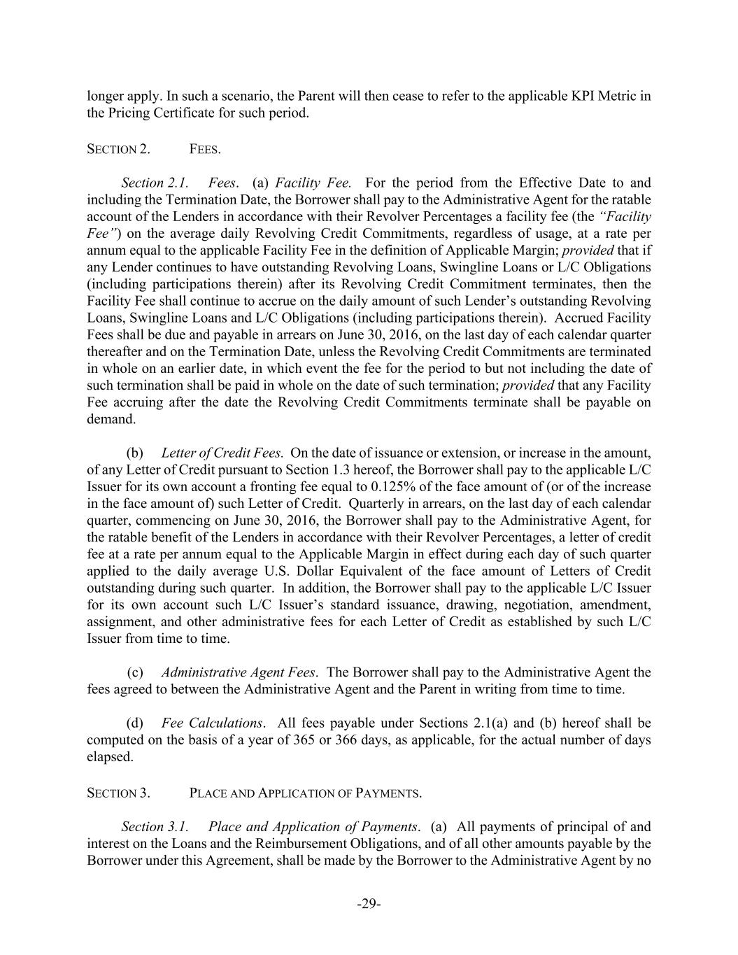 -29- longer apply. In such a scenario, the Parent will then cease to refer to the applicable KPI Metric in the Pricing Certificate for such period. SECTION 2. FEES. Section 2.1. Fees. (a) Facility Fee. For the period from the Effective Date to and including the Termination Date, the Borrower shall pay to the Administrative Agent for the ratable account of the Lenders in accordance with their Revolver Percentages a facility fee (the “Facility Fee”) on the average daily Revolving Credit Commitments, regardless of usage, at a rate per annum equal to the applicable Facility Fee in the definition of Applicable Margin; provided that if any Lender continues to have outstanding Revolving Loans, Swingline Loans or L/C Obligations (including participations therein) after its Revolving Credit Commitment terminates, then the Facility Fee shall continue to accrue on the daily amount of such Lender’s outstanding Revolving Loans, Swingline Loans and L/C Obligations (including participations therein). Accrued Facility Fees shall be due and payable in arrears on June 30, 2016, on the last day of each calendar quarter thereafter and on the Termination Date, unless the Revolving Credit Commitments are terminated in whole on an earlier date, in which event the fee for the period to but not including the date of such termination shall be paid in whole on the date of such termination; provided that any Facility Fee accruing after the date the Revolving Credit Commitments terminate shall be payable on demand. (b) Letter of Credit Fees. On the date of issuance or extension, or increase in the amount, of any Letter of Credit pursuant to Section 1.3 hereof, the Borrower shall pay to the applicable L/C Issuer for its own account a fronting fee equal to 0.125% of the face amount of (or of the increase in the face amount of) such Letter of Credit. Quarterly in arrears, on the last day of each calendar quarter, commencing on June 30, 2016, the Borrower shall pay to the Administrative Agent, for the ratable benefit of the Lenders in accordance with their Revolver Percentages, a letter of credit fee at a rate per annum equal to the Applicable Margin in effect during each day of such quarter applied to the daily average U.S. Dollar Equivalent of the face amount of Letters of Credit outstanding during such quarter. In addition, the Borrower shall pay to the applicable L/C Issuer for its own account such L/C Issuer’s standard issuance, drawing, negotiation, amendment, assignment, and other administrative fees for each Letter of Credit as established by such L/C Issuer from time to time. (c) Administrative Agent Fees. The Borrower shall pay to the Administrative Agent the fees agreed to between the Administrative Agent and the Parent in writing from time to time. (d) Fee Calculations. All fees payable under Sections 2.1(a) and (b) hereof shall be computed on the basis of a year of 365 or 366 days, as applicable, for the actual number of days elapsed. SECTION 3. PLACE AND APPLICATION OF PAYMENTS. Section 3.1. Place and Application of Payments. (a) All payments of principal of and interest on the Loans and the Reimbursement Obligations, and of all other amounts payable by the Borrower under this Agreement, shall be made by the Borrower to the Administrative Agent by no