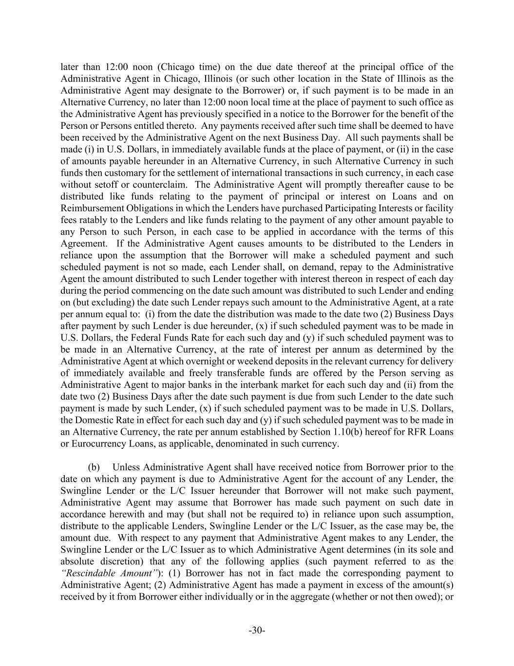 -30- later than 12:00 noon (Chicago time) on the due date thereof at the principal office of the Administrative Agent in Chicago, Illinois (or such other location in the State of Illinois as the Administrative Agent may designate to the Borrower) or, if such payment is to be made in an Alternative Currency, no later than 12:00 noon local time at the place of payment to such office as the Administrative Agent has previously specified in a notice to the Borrower for the benefit of the Person or Persons entitled thereto. Any payments received after such time shall be deemed to have been received by the Administrative Agent on the next Business Day. All such payments shall be made (i) in U.S. Dollars, in immediately available funds at the place of payment, or (ii) in the case of amounts payable hereunder in an Alternative Currency, in such Alternative Currency in such funds then customary for the settlement of international transactions in such currency, in each case without setoff or counterclaim. The Administrative Agent will promptly thereafter cause to be distributed like funds relating to the payment of principal or interest on Loans and on Reimbursement Obligations in which the Lenders have purchased Participating Interests or facility fees ratably to the Lenders and like funds relating to the payment of any other amount payable to any Person to such Person, in each case to be applied in accordance with the terms of this Agreement. If the Administrative Agent causes amounts to be distributed to the Lenders in reliance upon the assumption that the Borrower will make a scheduled payment and such scheduled payment is not so made, each Lender shall, on demand, repay to the Administrative Agent the amount distributed to such Lender together with interest thereon in respect of each day during the period commencing on the date such amount was distributed to such Lender and ending on (but excluding) the date such Lender repays such amount to the Administrative Agent, at a rate per annum equal to: (i) from the date the distribution was made to the date two (2) Business Days after payment by such Lender is due hereunder, (x) if such scheduled payment was to be made in U.S. Dollars, the Federal Funds Rate for each such day and (y) if such scheduled payment was to be made in an Alternative Currency, at the rate of interest per annum as determined by the Administrative Agent at which overnight or weekend deposits in the relevant currency for delivery of immediately available and freely transferable funds are offered by the Person serving as Administrative Agent to major banks in the interbank market for each such day and (ii) from the date two (2) Business Days after the date such payment is due from such Lender to the date such payment is made by such Lender, (x) if such scheduled payment was to be made in U.S. Dollars, the Domestic Rate in effect for each such day and (y) if such scheduled payment was to be made in an Alternative Currency, the rate per annum established by Section 1.10(b) hereof for RFR Loans or Eurocurrency Loans, as applicable, denominated in such currency. (b) Unless Administrative Agent shall have received notice from Borrower prior to the date on which any payment is due to Administrative Agent for the account of any Lender, the Swingline Lender or the L/C Issuer hereunder that Borrower will not make such payment, Administrative Agent may assume that Borrower has made such payment on such date in accordance herewith and may (but shall not be required to) in reliance upon such assumption, distribute to the applicable Lenders, Swingline Lender or the L/C Issuer, as the case may be, the amount due. With respect to any payment that Administrative Agent makes to any Lender, the Swingline Lender or the L/C Issuer as to which Administrative Agent determines (in its sole and absolute discretion) that any of the following applies (such payment referred to as the “Rescindable Amount”): (1) Borrower has not in fact made the corresponding payment to Administrative Agent; (2) Administrative Agent has made a payment in excess of the amount(s) received by it from Borrower either individually or in the aggregate (whether or not then owed); or