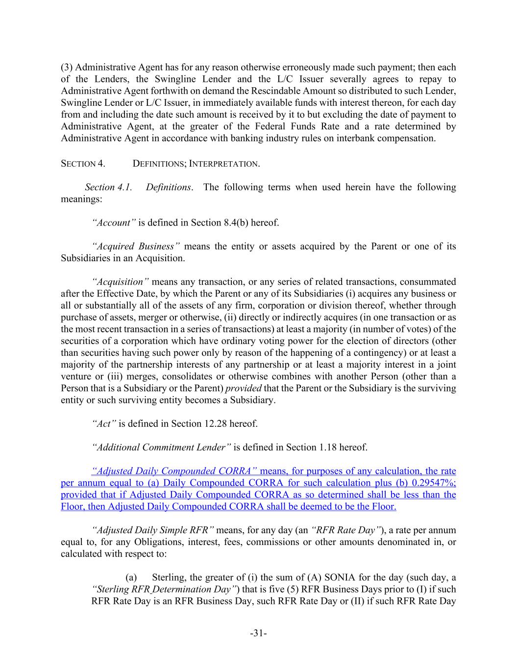 -31- (3) Administrative Agent has for any reason otherwise erroneously made such payment; then each of the Lenders, the Swingline Lender and the L/C Issuer severally agrees to repay to Administrative Agent forthwith on demand the Rescindable Amount so distributed to such Lender, Swingline Lender or L/C Issuer, in immediately available funds with interest thereon, for each day from and including the date such amount is received by it to but excluding the date of payment to Administrative Agent, at the greater of the Federal Funds Rate and a rate determined by Administrative Agent in accordance with banking industry rules on interbank compensation. SECTION 4. DEFINITIONS; INTERPRETATION. Section 4.1. Definitions. The following terms when used herein have the following meanings: “Account” is defined in Section 8.4(b) hereof. “Acquired Business” means the entity or assets acquired by the Parent or one of its Subsidiaries in an Acquisition. “Acquisition” means any transaction, or any series of related transactions, consummated after the Effective Date, by which the Parent or any of its Subsidiaries (i) acquires any business or all or substantially all of the assets of any firm, corporation or division thereof, whether through purchase of assets, merger or otherwise, (ii) directly or indirectly acquires (in one transaction or as the most recent transaction in a series of transactions) at least a majority (in number of votes) of the securities of a corporation which have ordinary voting power for the election of directors (other than securities having such power only by reason of the happening of a contingency) or at least a majority of the partnership interests of any partnership or at least a majority interest in a joint venture or (iii) merges, consolidates or otherwise combines with another Person (other than a Person that is a Subsidiary or the Parent) provided that the Parent or the Subsidiary is the surviving entity or such surviving entity becomes a Subsidiary. “Act” is defined in Section 12.28 hereof. “Additional Commitment Lender” is defined in Section 1.18 hereof. “Adjusted Daily Compounded CORRA” means, for purposes of any calculation, the rate per annum equal to (a) Daily Compounded CORRA for such calculation plus (b) 0.29547%; provided that if Adjusted Daily Compounded CORRA as so determined shall be less than the Floor, then Adjusted Daily Compounded CORRA shall be deemed to be the Floor. “Adjusted Daily Simple RFR” means, for any day (an “RFR Rate Day”), a rate per annum equal to, for any Obligations, interest, fees, commissions or other amounts denominated in, or calculated with respect to: (a) Sterling, the greater of (i) the sum of (A) SONIA for the day (such day, a “Sterling RFR Determination Day”) that is five (5) RFR Business Days prior to (I) if such RFR Rate Day is an RFR Business Day, such RFR Rate Day or (II) if such RFR Rate Day