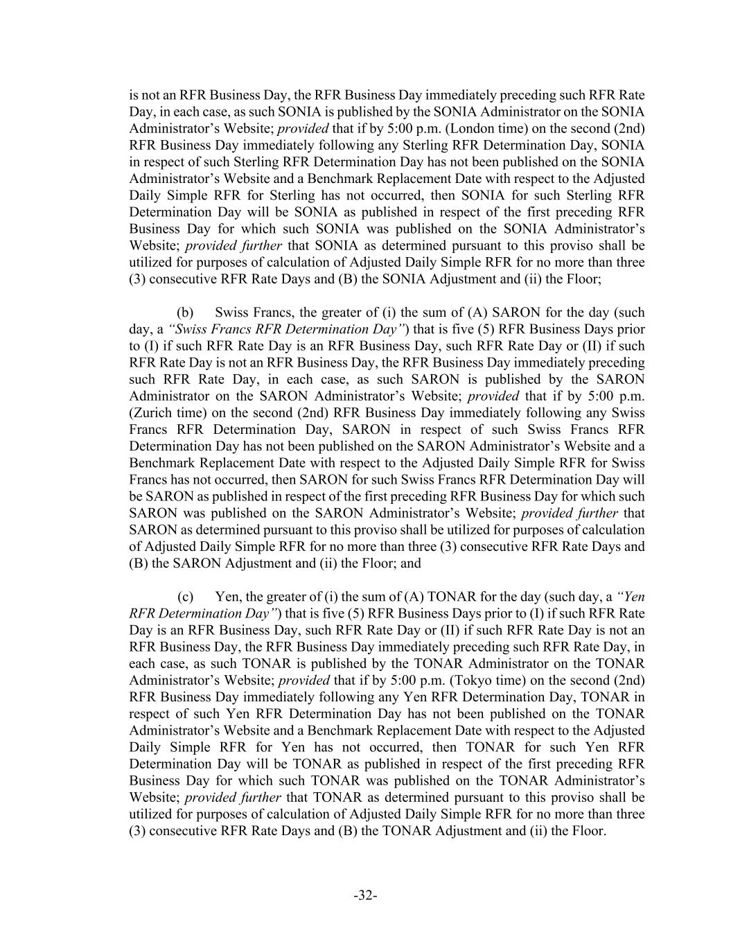 -32- is not an RFR Business Day, the RFR Business Day immediately preceding such RFR Rate Day, in each case, as such SONIA is published by the SONIA Administrator on the SONIA Administrator’s Website; provided that if by 5:00 p.m. (London time) on the second (2nd) RFR Business Day immediately following any Sterling RFR Determination Day, SONIA in respect of such Sterling RFR Determination Day has not been published on the SONIA Administrator’s Website and a Benchmark Replacement Date with respect to the Adjusted Daily Simple RFR for Sterling has not occurred, then SONIA for such Sterling RFR Determination Day will be SONIA as published in respect of the first preceding RFR Business Day for which such SONIA was published on the SONIA Administrator’s Website; provided further that SONIA as determined pursuant to this proviso shall be utilized for purposes of calculation of Adjusted Daily Simple RFR for no more than three (3) consecutive RFR Rate Days and (B) the SONIA Adjustment and (ii) the Floor; (b) Swiss Francs, the greater of (i) the sum of (A) SARON for the day (such day, a “Swiss Francs RFR Determination Day”) that is five (5) RFR Business Days prior to (I) if such RFR Rate Day is an RFR Business Day, such RFR Rate Day or (II) if such RFR Rate Day is not an RFR Business Day, the RFR Business Day immediately preceding such RFR Rate Day, in each case, as such SARON is published by the SARON Administrator on the SARON Administrator’s Website; provided that if by 5:00 p.m. (Zurich time) on the second (2nd) RFR Business Day immediately following any Swiss Francs RFR Determination Day, SARON in respect of such Swiss Francs RFR Determination Day has not been published on the SARON Administrator’s Website and a Benchmark Replacement Date with respect to the Adjusted Daily Simple RFR for Swiss Francs has not occurred, then SARON for such Swiss Francs RFR Determination Day will be SARON as published in respect of the first preceding RFR Business Day for which such SARON was published on the SARON Administrator’s Website; provided further that SARON as determined pursuant to this proviso shall be utilized for purposes of calculation of Adjusted Daily Simple RFR for no more than three (3) consecutive RFR Rate Days and (B) the SARON Adjustment and (ii) the Floor; and (c) Yen, the greater of (i) the sum of (A) TONAR for the day (such day, a “Yen RFR Determination Day”) that is five (5) RFR Business Days prior to (I) if such RFR Rate Day is an RFR Business Day, such RFR Rate Day or (II) if such RFR Rate Day is not an RFR Business Day, the RFR Business Day immediately preceding such RFR Rate Day, in each case, as such TONAR is published by the TONAR Administrator on the TONAR Administrator’s Website; provided that if by 5:00 p.m. (Tokyo time) on the second (2nd) RFR Business Day immediately following any Yen RFR Determination Day, TONAR in respect of such Yen RFR Determination Day has not been published on the TONAR Administrator’s Website and a Benchmark Replacement Date with respect to the Adjusted Daily Simple RFR for Yen has not occurred, then TONAR for such Yen RFR Determination Day will be TONAR as published in respect of the first preceding RFR Business Day for which such TONAR was published on the TONAR Administrator’s Website; provided further that TONAR as determined pursuant to this proviso shall be utilized for purposes of calculation of Adjusted Daily Simple RFR for no more than three (3) consecutive RFR Rate Days and (B) the TONAR Adjustment and (ii) the Floor.