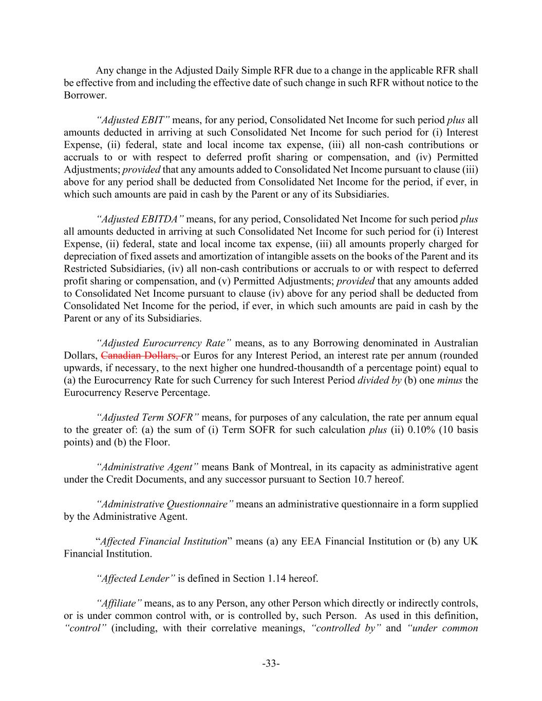 -33- Any change in the Adjusted Daily Simple RFR due to a change in the applicable RFR shall be effective from and including the effective date of such change in such RFR without notice to the Borrower. “Adjusted EBIT” means, for any period, Consolidated Net Income for such period plus all amounts deducted in arriving at such Consolidated Net Income for such period for (i) Interest Expense, (ii) federal, state and local income tax expense, (iii) all non-cash contributions or accruals to or with respect to deferred profit sharing or compensation, and (iv) Permitted Adjustments; provided that any amounts added to Consolidated Net Income pursuant to clause (iii) above for any period shall be deducted from Consolidated Net Income for the period, if ever, in which such amounts are paid in cash by the Parent or any of its Subsidiaries. “Adjusted EBITDA” means, for any period, Consolidated Net Income for such period plus all amounts deducted in arriving at such Consolidated Net Income for such period for (i) Interest Expense, (ii) federal, state and local income tax expense, (iii) all amounts properly charged for depreciation of fixed assets and amortization of intangible assets on the books of the Parent and its Restricted Subsidiaries, (iv) all non-cash contributions or accruals to or with respect to deferred profit sharing or compensation, and (v) Permitted Adjustments; provided that any amounts added to Consolidated Net Income pursuant to clause (iv) above for any period shall be deducted from Consolidated Net Income for the period, if ever, in which such amounts are paid in cash by the Parent or any of its Subsidiaries. “Adjusted Eurocurrency Rate” means, as to any Borrowing denominated in Australian Dollars, Canadian Dollars, or Euros for any Interest Period, an interest rate per annum (rounded upwards, if necessary, to the next higher one hundred-thousandth of a percentage point) equal to (a) the Eurocurrency Rate for such Currency for such Interest Period divided by (b) one minus the Eurocurrency Reserve Percentage. “Adjusted Term SOFR” means, for purposes of any calculation, the rate per annum equal to the greater of: (a) the sum of (i) Term SOFR for such calculation plus (ii) 0.10% (10 basis points) and (b) the Floor. “Administrative Agent” means Bank of Montreal, in its capacity as administrative agent under the Credit Documents, and any successor pursuant to Section 10.7 hereof. “Administrative Questionnaire” means an administrative questionnaire in a form supplied by the Administrative Agent. “Affected Financial Institution” means (a) any EEA Financial Institution or (b) any UK Financial Institution. “Affected Lender” is defined in Section 1.14 hereof. “Affiliate” means, as to any Person, any other Person which directly or indirectly controls, or is under common control with, or is controlled by, such Person. As used in this definition, “control” (including, with their correlative meanings, “controlled by” and “under common