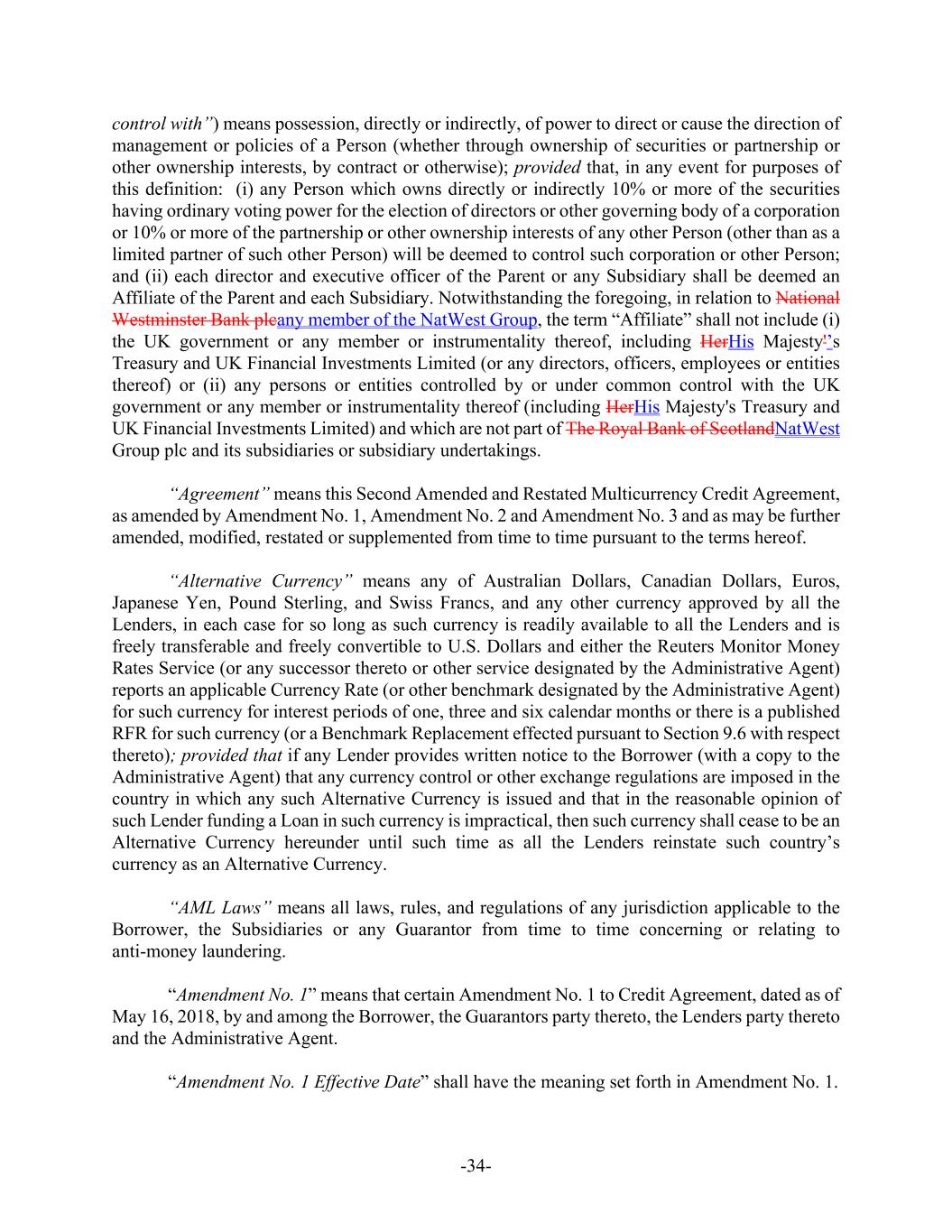 -34- control with”) means possession, directly or indirectly, of power to direct or cause the direction of management or policies of a Person (whether through ownership of securities or partnership or other ownership interests, by contract or otherwise); provided that, in any event for purposes of this definition: (i) any Person which owns directly or indirectly 10% or more of the securities having ordinary voting power for the election of directors or other governing body of a corporation or 10% or more of the partnership or other ownership interests of any other Person (other than as a limited partner of such other Person) will be deemed to control such corporation or other Person; and (ii) each director and executive officer of the Parent or any Subsidiary shall be deemed an Affiliate of the Parent and each Subsidiary. Notwithstanding the foregoing, in relation to National Westminster Bank plcany member of the NatWest Group, the term “Affiliate” shall not include (i) the UK government or any member or instrumentality thereof, including HerHis Majesty'’s Treasury and UK Financial Investments Limited (or any directors, officers, employees or entities thereof) or (ii) any persons or entities controlled by or under common control with the UK government or any member or instrumentality thereof (including HerHis Majesty's Treasury and UK Financial Investments Limited) and which are not part of The Royal Bank of ScotlandNatWest Group plc and its subsidiaries or subsidiary undertakings. “Agreement” means this Second Amended and Restated Multicurrency Credit Agreement, as amended by Amendment No. 1, Amendment No. 2 and Amendment No. 3 and as may be further amended, modified, restated or supplemented from time to time pursuant to the terms hereof. “Alternative Currency” means any of Australian Dollars, Canadian Dollars, Euros, Japanese Yen, Pound Sterling, and Swiss Francs, and any other currency approved by all the Lenders, in each case for so long as such currency is readily available to all the Lenders and is freely transferable and freely convertible to U.S. Dollars and either the Reuters Monitor Money Rates Service (or any successor thereto or other service designated by the Administrative Agent) reports an applicable Currency Rate (or other benchmark designated by the Administrative Agent) for such currency for interest periods of one, three and six calendar months or there is a published RFR for such currency (or a Benchmark Replacement effected pursuant to Section 9.6 with respect thereto); provided that if any Lender provides written notice to the Borrower (with a copy to the Administrative Agent) that any currency control or other exchange regulations are imposed in the country in which any such Alternative Currency is issued and that in the reasonable opinion of such Lender funding a Loan in such currency is impractical, then such currency shall cease to be an Alternative Currency hereunder until such time as all the Lenders reinstate such country’s currency as an Alternative Currency. “AML Laws” means all laws, rules, and regulations of any jurisdiction applicable to the Borrower, the Subsidiaries or any Guarantor from time to time concerning or relating to anti-money laundering. “Amendment No. 1” means that certain Amendment No. 1 to Credit Agreement, dated as of May 16, 2018, by and among the Borrower, the Guarantors party thereto, the Lenders party thereto and the Administrative Agent. “Amendment No. 1 Effective Date” shall have the meaning set forth in Amendment No. 1.