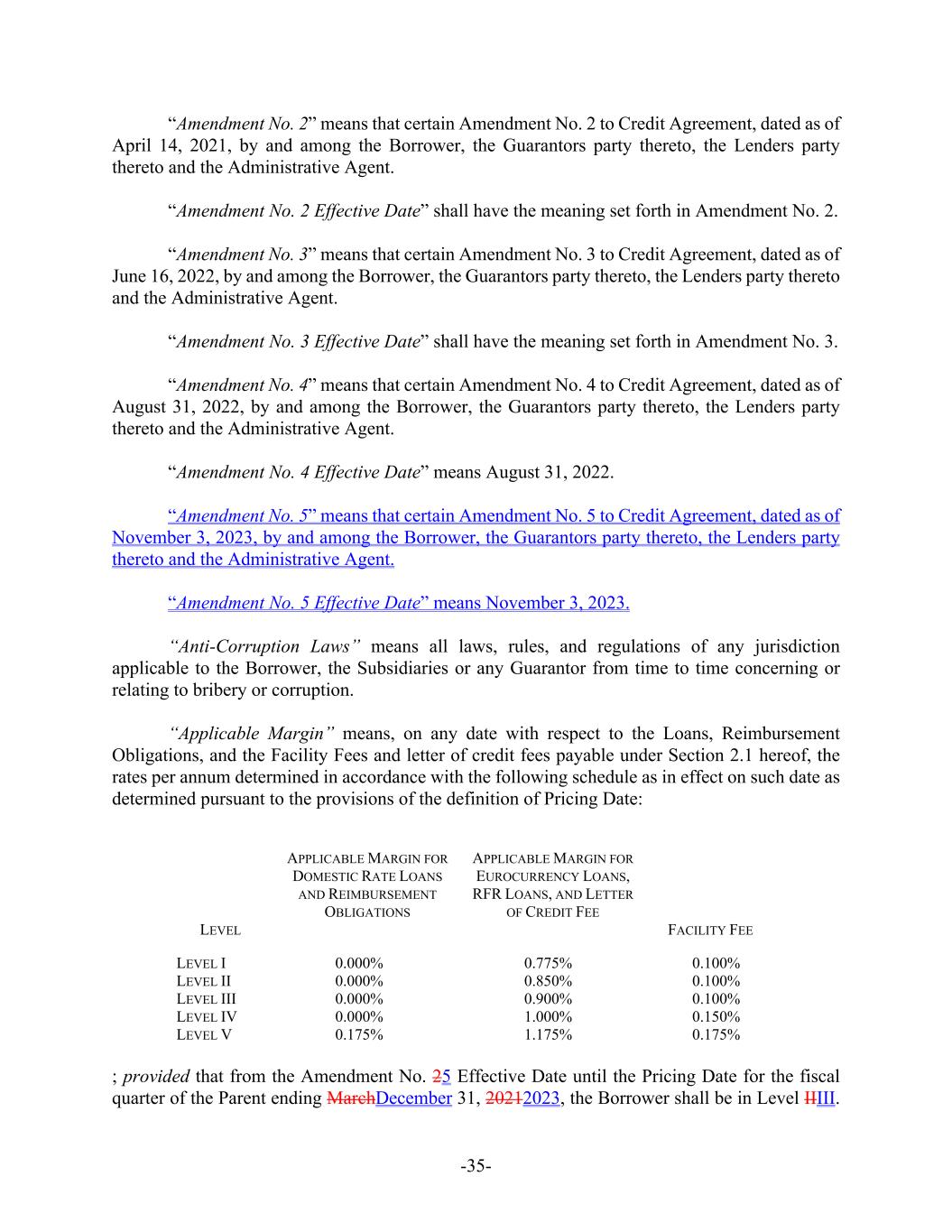 -35- “Amendment No. 2” means that certain Amendment No. 2 to Credit Agreement, dated as of April 14, 2021, by and among the Borrower, the Guarantors party thereto, the Lenders party thereto and the Administrative Agent. “Amendment No. 2 Effective Date” shall have the meaning set forth in Amendment No. 2. “Amendment No. 3” means that certain Amendment No. 3 to Credit Agreement, dated as of June 16, 2022, by and among the Borrower, the Guarantors party thereto, the Lenders party thereto and the Administrative Agent. “Amendment No. 3 Effective Date” shall have the meaning set forth in Amendment No. 3. “Amendment No. 4” means that certain Amendment No. 4 to Credit Agreement, dated as of August 31, 2022, by and among the Borrower, the Guarantors party thereto, the Lenders party thereto and the Administrative Agent. “Amendment No. 4 Effective Date” means August 31, 2022. “Amendment No. 5” means that certain Amendment No. 5 to Credit Agreement, dated as of November 3, 2023, by and among the Borrower, the Guarantors party thereto, the Lenders party thereto and the Administrative Agent. “Amendment No. 5 Effective Date” means November 3, 2023. “Anti-Corruption Laws” means all laws, rules, and regulations of any jurisdiction applicable to the Borrower, the Subsidiaries or any Guarantor from time to time concerning or relating to bribery or corruption. “Applicable Margin” means, on any date with respect to the Loans, Reimbursement Obligations, and the Facility Fees and letter of credit fees payable under Section 2.1 hereof, the rates per annum determined in accordance with the following schedule as in effect on such date as determined pursuant to the provisions of the definition of Pricing Date: LEVEL APPLICABLE MARGIN FOR DOMESTIC RATE LOANS AND REIMBURSEMENT OBLIGATIONS APPLICABLE MARGIN FOR EUROCURRENCY LOANS, RFR LOANS, AND LETTER OF CREDIT FEE FACILITY FEE LEVEL I 0.000% 0.775% 0.100% LEVEL II 0.000% 0.850% 0.100% LEVEL III 0.000% 0.900% 0.100% LEVEL IV 0.000% 1.000% 0.150% LEVEL V 0.175% 1.175% 0.175% ; provided that from the Amendment No. 25 Effective Date until the Pricing Date for the fiscal quarter of the Parent ending MarchDecember 31, 20212023, the Borrower shall be in Level IIIII.