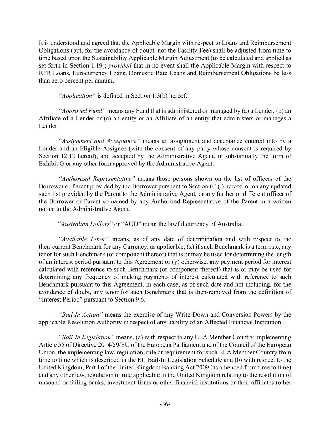 -36- It is understood and agreed that the Applicable Margin with respect to Loans and Reimbursement Obligations (but, for the avoidance of doubt, not the Facility Fee) shall be adjusted from time to time based upon the Sustainability Applicable Margin Adjustment (to be calculated and applied as set forth in Section 1.19); provided that in no event shall the Applicable Margin with respect to RFR Loans, Eurocurrency Loans, Domestic Rate Loans and Reimbursement Obligations be less than zero percent per annum. “Application” is defined in Section 1.3(b) hereof. “Approved Fund” means any Fund that is administered or managed by (a) a Lender, (b) an Affiliate of a Lender or (c) an entity or an Affiliate of an entity that administers or manages a Lender. “Assignment and Acceptance” means an assignment and acceptance entered into by a Lender and an Eligible Assignee (with the consent of any party whose consent is required by Section 12.12 hereof), and accepted by the Administrative Agent, in substantially the form of Exhibit G or any other form approved by the Administrative Agent. “Authorized Representative” means those persons shown on the list of officers of the Borrower or Parent provided by the Borrower pursuant to Section 6.1(i) hereof, or on any updated such list provided by the Parent to the Administrative Agent, or any further or different officer of the Borrower or Parent so named by any Authorized Representative of the Parent in a written notice to the Administrative Agent. “Australian Dollars” or “AUD” mean the lawful currency of Australia. “Available Tenor” means, as of any date of determination and with respect to the then-current Benchmark for any Currency, as applicable, (x) if such Benchmark is a term rate, any tenor for such Benchmark (or component thereof) that is or may be used for determining the length of an interest period pursuant to this Agreement or (y) otherwise, any payment period for interest calculated with reference to such Benchmark (or component thereof) that is or may be used for determining any frequency of making payments of interest calculated with reference to such Benchmark pursuant to this Agreement, in each case, as of such date and not including, for the avoidance of doubt, any tenor for such Benchmark that is then-removed from the definition of “Interest Period” pursuant to Section 9.6. “Bail-In Action” means the exercise of any Write-Down and Conversion Powers by the applicable Resolution Authority in respect of any liability of an Affected Financial Institution. “Bail-In Legislation” means, (a) with respect to any EEA Member Country implementing Article 55 of Directive 2014/59/EU of the European Parliament and of the Council of the European Union, the implementing law, regulation, rule or requirement for such EEA Member Country from time to time which is described in the EU Bail-In Legislation Schedule and (b) with respect to the United Kingdom, Part I of the United Kingdom Banking Act 2009 (as amended from time to time) and any other law, regulation or rule applicable in the United Kingdom relating to the resolution of unsound or failing banks, investment firms or other financial institutions or their affiliates (other