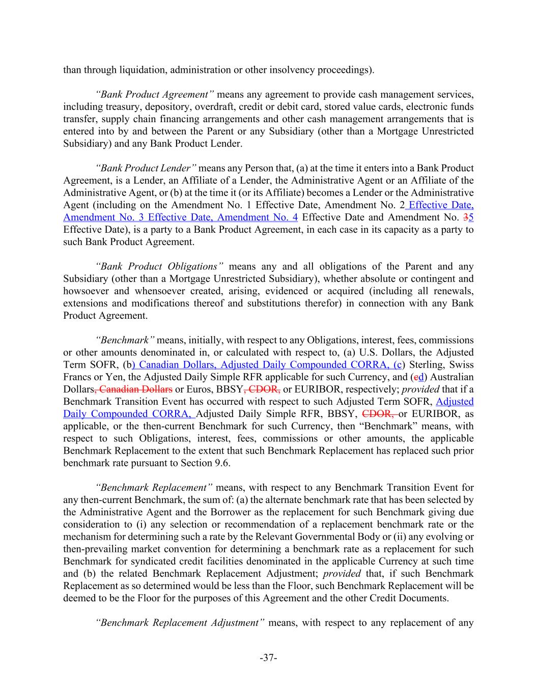 -37- than through liquidation, administration or other insolvency proceedings). “Bank Product Agreement” means any agreement to provide cash management services, including treasury, depository, overdraft, credit or debit card, stored value cards, electronic funds transfer, supply chain financing arrangements and other cash management arrangements that is entered into by and between the Parent or any Subsidiary (other than a Mortgage Unrestricted Subsidiary) and any Bank Product Lender. “Bank Product Lender” means any Person that, (a) at the time it enters into a Bank Product Agreement, is a Lender, an Affiliate of a Lender, the Administrative Agent or an Affiliate of the Administrative Agent, or (b) at the time it (or its Affiliate) becomes a Lender or the Administrative Agent (including on the Amendment No. 1 Effective Date, Amendment No. 2 Effective Date, Amendment No. 3 Effective Date, Amendment No. 4 Effective Date and Amendment No. 35 Effective Date), is a party to a Bank Product Agreement, in each case in its capacity as a party to such Bank Product Agreement. “Bank Product Obligations” means any and all obligations of the Parent and any Subsidiary (other than a Mortgage Unrestricted Subsidiary), whether absolute or contingent and howsoever and whensoever created, arising, evidenced or acquired (including all renewals, extensions and modifications thereof and substitutions therefor) in connection with any Bank Product Agreement. “Benchmark” means, initially, with respect to any Obligations, interest, fees, commissions or other amounts denominated in, or calculated with respect to, (a) U.S. Dollars, the Adjusted Term SOFR, (b) Canadian Dollars, Adjusted Daily Compounded CORRA, (c) Sterling, Swiss Francs or Yen, the Adjusted Daily Simple RFR applicable for such Currency, and (cd) Australian Dollars, Canadian Dollars or Euros, BBSY, CDOR, or EURIBOR, respectively; provided that if a Benchmark Transition Event has occurred with respect to such Adjusted Term SOFR, Adjusted Daily Compounded CORRA, Adjusted Daily Simple RFR, BBSY, CDOR, or EURIBOR, as applicable, or the then-current Benchmark for such Currency, then “Benchmark” means, with respect to such Obligations, interest, fees, commissions or other amounts, the applicable Benchmark Replacement to the extent that such Benchmark Replacement has replaced such prior benchmark rate pursuant to Section 9.6. “Benchmark Replacement” means, with respect to any Benchmark Transition Event for any then-current Benchmark, the sum of: (a) the alternate benchmark rate that has been selected by the Administrative Agent and the Borrower as the replacement for such Benchmark giving due consideration to (i) any selection or recommendation of a replacement benchmark rate or the mechanism for determining such a rate by the Relevant Governmental Body or (ii) any evolving or then-prevailing market convention for determining a benchmark rate as a replacement for such Benchmark for syndicated credit facilities denominated in the applicable Currency at such time and (b) the related Benchmark Replacement Adjustment; provided that, if such Benchmark Replacement as so determined would be less than the Floor, such Benchmark Replacement will be deemed to be the Floor for the purposes of this Agreement and the other Credit Documents. “Benchmark Replacement Adjustment” means, with respect to any replacement of any