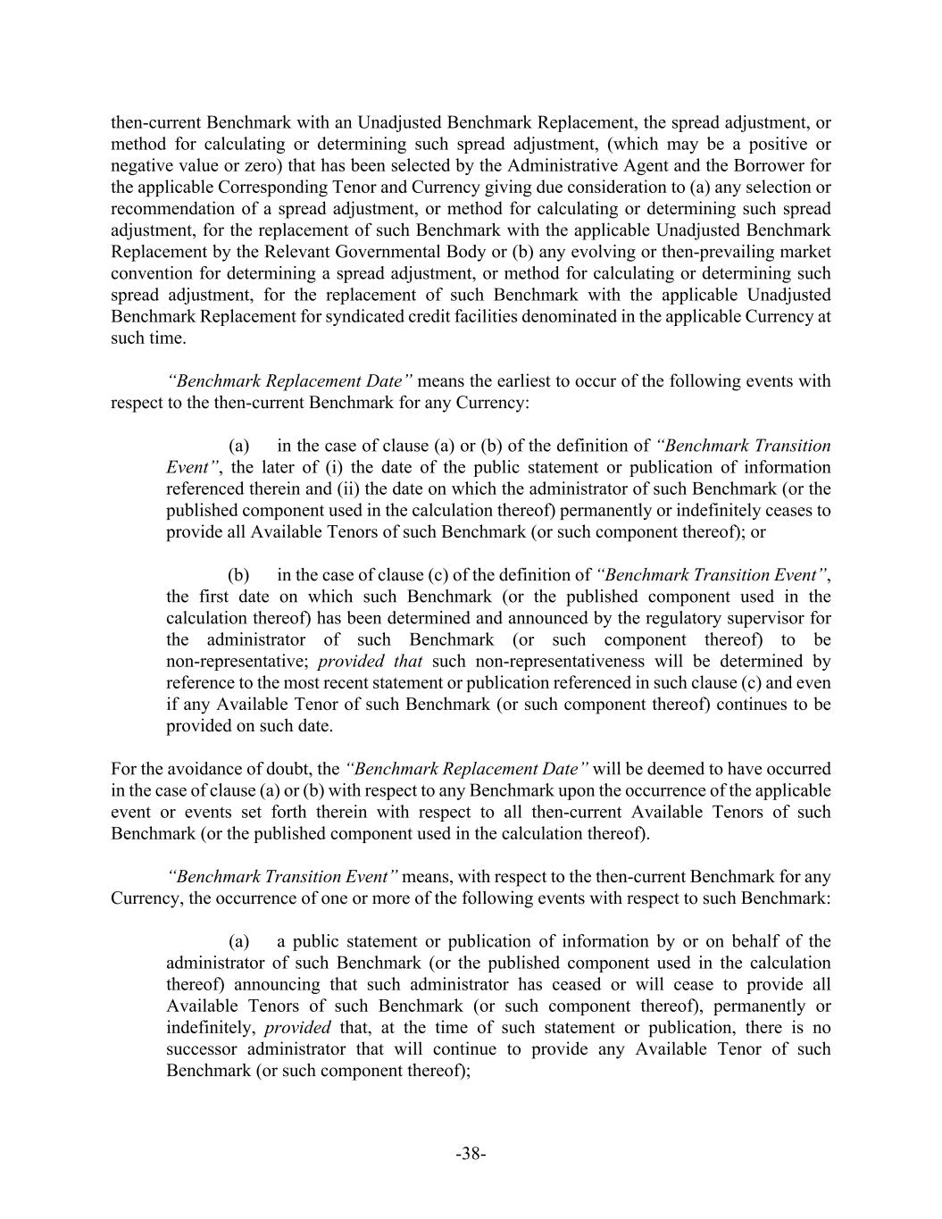 -38- then-current Benchmark with an Unadjusted Benchmark Replacement, the spread adjustment, or method for calculating or determining such spread adjustment, (which may be a positive or negative value or zero) that has been selected by the Administrative Agent and the Borrower for the applicable Corresponding Tenor and Currency giving due consideration to (a) any selection or recommendation of a spread adjustment, or method for calculating or determining such spread adjustment, for the replacement of such Benchmark with the applicable Unadjusted Benchmark Replacement by the Relevant Governmental Body or (b) any evolving or then-prevailing market convention for determining a spread adjustment, or method for calculating or determining such spread adjustment, for the replacement of such Benchmark with the applicable Unadjusted Benchmark Replacement for syndicated credit facilities denominated in the applicable Currency at such time. “Benchmark Replacement Date” means the earliest to occur of the following events with respect to the then-current Benchmark for any Currency: (a) in the case of clause (a) or (b) of the definition of “Benchmark Transition Event”, the later of (i) the date of the public statement or publication of information referenced therein and (ii) the date on which the administrator of such Benchmark (or the published component used in the calculation thereof) permanently or indefinitely ceases to provide all Available Tenors of such Benchmark (or such component thereof); or (b) in the case of clause (c) of the definition of “Benchmark Transition Event”, the first date on which such Benchmark (or the published component used in the calculation thereof) has been determined and announced by the regulatory supervisor for the administrator of such Benchmark (or such component thereof) to be non-representative; provided that such non-representativeness will be determined by reference to the most recent statement or publication referenced in such clause (c) and even if any Available Tenor of such Benchmark (or such component thereof) continues to be provided on such date. For the avoidance of doubt, the “Benchmark Replacement Date” will be deemed to have occurred in the case of clause (a) or (b) with respect to any Benchmark upon the occurrence of the applicable event or events set forth therein with respect to all then-current Available Tenors of such Benchmark (or the published component used in the calculation thereof). “Benchmark Transition Event” means, with respect to the then-current Benchmark for any Currency, the occurrence of one or more of the following events with respect to such Benchmark: (a) a public statement or publication of information by or on behalf of the administrator of such Benchmark (or the published component used in the calculation thereof) announcing that such administrator has ceased or will cease to provide all Available Tenors of such Benchmark (or such component thereof), permanently or indefinitely, provided that, at the time of such statement or publication, there is no successor administrator that will continue to provide any Available Tenor of such Benchmark (or such component thereof);