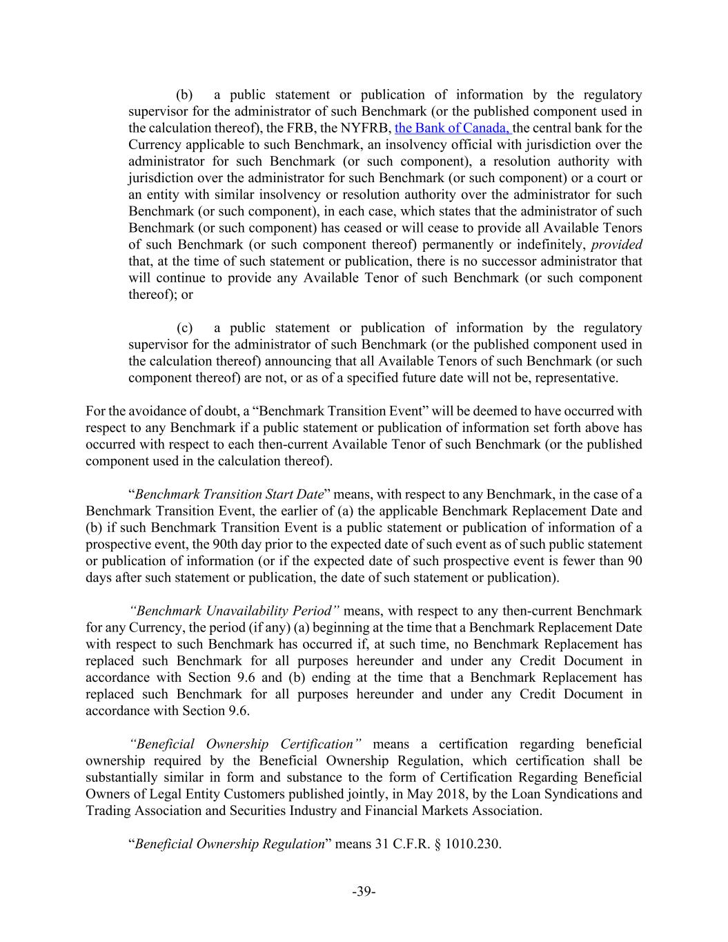 -39- (b) a public statement or publication of information by the regulatory supervisor for the administrator of such Benchmark (or the published component used in the calculation thereof), the FRB, the NYFRB, the Bank of Canada, the central bank for the Currency applicable to such Benchmark, an insolvency official with jurisdiction over the administrator for such Benchmark (or such component), a resolution authority with jurisdiction over the administrator for such Benchmark (or such component) or a court or an entity with similar insolvency or resolution authority over the administrator for such Benchmark (or such component), in each case, which states that the administrator of such Benchmark (or such component) has ceased or will cease to provide all Available Tenors of such Benchmark (or such component thereof) permanently or indefinitely, provided that, at the time of such statement or publication, there is no successor administrator that will continue to provide any Available Tenor of such Benchmark (or such component thereof); or (c) a public statement or publication of information by the regulatory supervisor for the administrator of such Benchmark (or the published component used in the calculation thereof) announcing that all Available Tenors of such Benchmark (or such component thereof) are not, or as of a specified future date will not be, representative. For the avoidance of doubt, a “Benchmark Transition Event” will be deemed to have occurred with respect to any Benchmark if a public statement or publication of information set forth above has occurred with respect to each then-current Available Tenor of such Benchmark (or the published component used in the calculation thereof). “Benchmark Transition Start Date” means, with respect to any Benchmark, in the case of a Benchmark Transition Event, the earlier of (a) the applicable Benchmark Replacement Date and (b) if such Benchmark Transition Event is a public statement or publication of information of a prospective event, the 90th day prior to the expected date of such event as of such public statement or publication of information (or if the expected date of such prospective event is fewer than 90 days after such statement or publication, the date of such statement or publication). “Benchmark Unavailability Period” means, with respect to any then-current Benchmark for any Currency, the period (if any) (a) beginning at the time that a Benchmark Replacement Date with respect to such Benchmark has occurred if, at such time, no Benchmark Replacement has replaced such Benchmark for all purposes hereunder and under any Credit Document in accordance with Section 9.6 and (b) ending at the time that a Benchmark Replacement has replaced such Benchmark for all purposes hereunder and under any Credit Document in accordance with Section 9.6. “Beneficial Ownership Certification” means a certification regarding beneficial ownership required by the Beneficial Ownership Regulation, which certification shall be substantially similar in form and substance to the form of Certification Regarding Beneficial Owners of Legal Entity Customers published jointly, in May 2018, by the Loan Syndications and Trading Association and Securities Industry and Financial Markets Association. “Beneficial Ownership Regulation” means 31 C.F.R. § 1010.230.