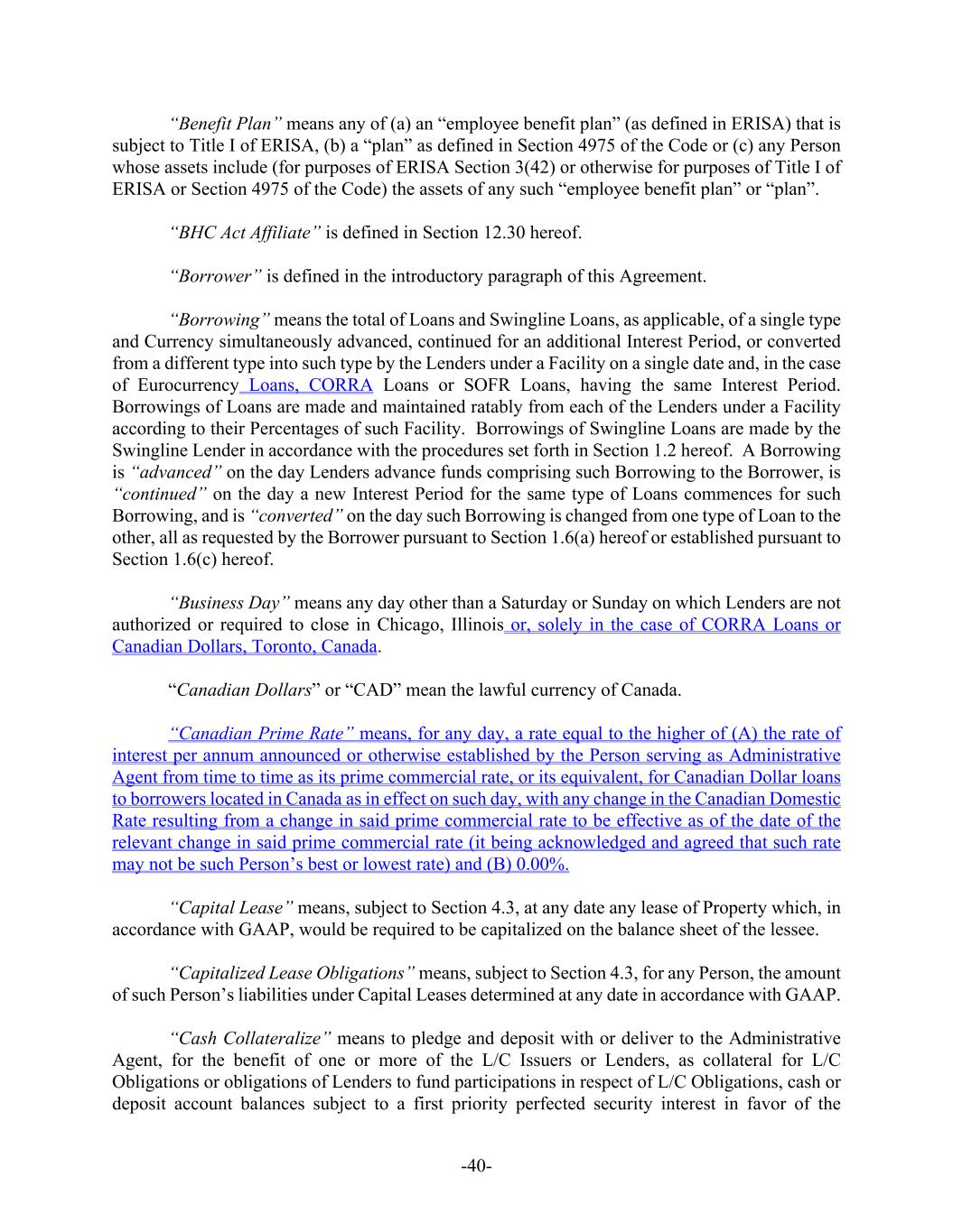 -40- “Benefit Plan” means any of (a) an “employee benefit plan” (as defined in ERISA) that is subject to Title I of ERISA, (b) a “plan” as defined in Section 4975 of the Code or (c) any Person whose assets include (for purposes of ERISA Section 3(42) or otherwise for purposes of Title I of ERISA or Section 4975 of the Code) the assets of any such “employee benefit plan” or “plan”. “BHC Act Affiliate” is defined in Section 12.30 hereof. “Borrower” is defined in the introductory paragraph of this Agreement. “Borrowing” means the total of Loans and Swingline Loans, as applicable, of a single type and Currency simultaneously advanced, continued for an additional Interest Period, or converted from a different type into such type by the Lenders under a Facility on a single date and, in the case of Eurocurrency Loans, CORRA Loans or SOFR Loans, having the same Interest Period. Borrowings of Loans are made and maintained ratably from each of the Lenders under a Facility according to their Percentages of such Facility. Borrowings of Swingline Loans are made by the Swingline Lender in accordance with the procedures set forth in Section 1.2 hereof. A Borrowing is “advanced” on the day Lenders advance funds comprising such Borrowing to the Borrower, is “continued” on the day a new Interest Period for the same type of Loans commences for such Borrowing, and is “converted” on the day such Borrowing is changed from one type of Loan to the other, all as requested by the Borrower pursuant to Section 1.6(a) hereof or established pursuant to Section 1.6(c) hereof. “Business Day” means any day other than a Saturday or Sunday on which Lenders are not authorized or required to close in Chicago, Illinois or, solely in the case of CORRA Loans or Canadian Dollars, Toronto, Canada. “Canadian Dollars” or “CAD” mean the lawful currency of Canada. “Canadian Prime Rate” means, for any day, a rate equal to the higher of (A) the rate of interest per annum announced or otherwise established by the Person serving as Administrative Agent from time to time as its prime commercial rate, or its equivalent, for Canadian Dollar loans to borrowers located in Canada as in effect on such day, with any change in the Canadian Domestic Rate resulting from a change in said prime commercial rate to be effective as of the date of the relevant change in said prime commercial rate (it being acknowledged and agreed that such rate may not be such Person’s best or lowest rate) and (B) 0.00%. “Capital Lease” means, subject to Section 4.3, at any date any lease of Property which, in accordance with GAAP, would be required to be capitalized on the balance sheet of the lessee. “Capitalized Lease Obligations” means, subject to Section 4.3, for any Person, the amount of such Person’s liabilities under Capital Leases determined at any date in accordance with GAAP. “Cash Collateralize” means to pledge and deposit with or deliver to the Administrative Agent, for the benefit of one or more of the L/C Issuers or Lenders, as collateral for L/C Obligations or obligations of Lenders to fund participations in respect of L/C Obligations, cash or deposit account balances subject to a first priority perfected security interest in favor of the