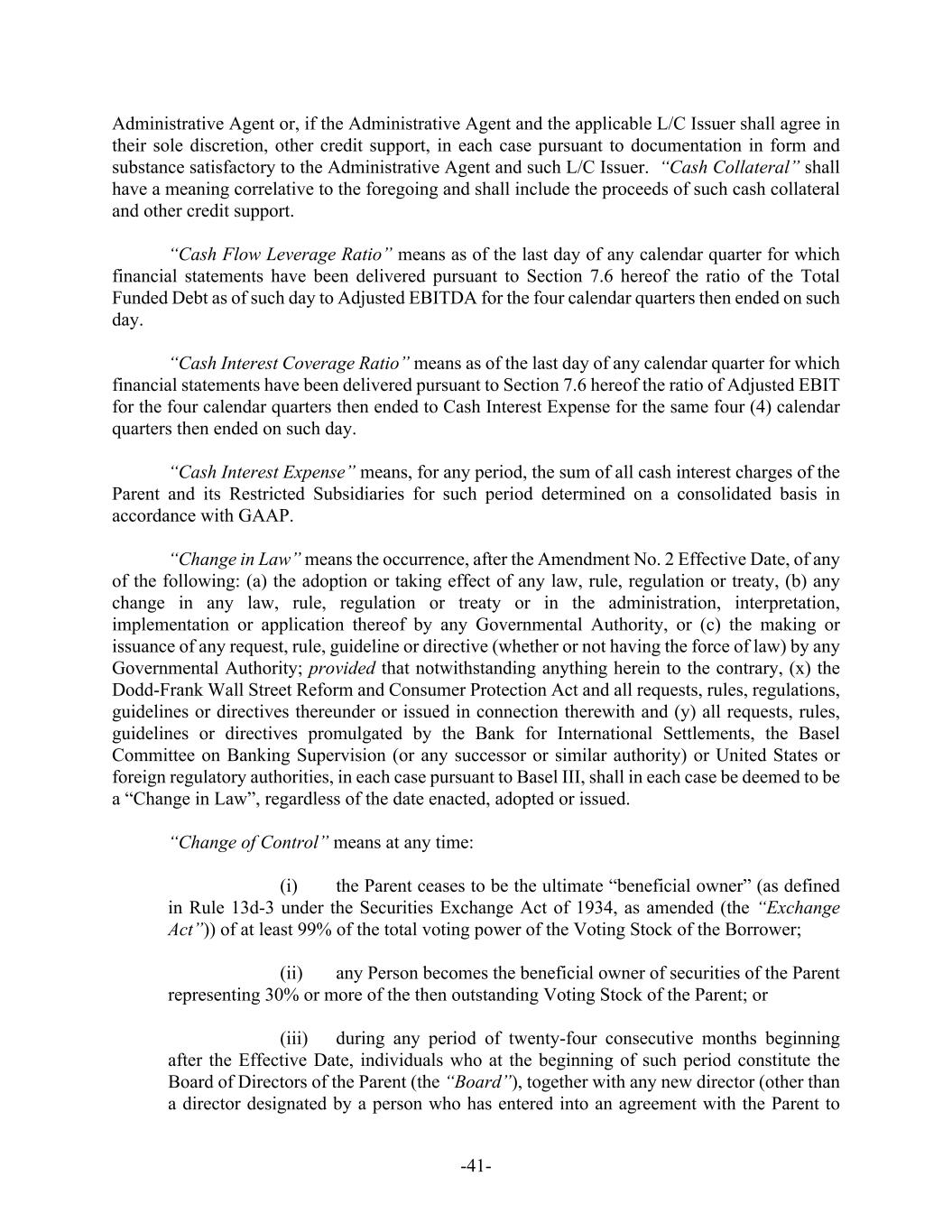 -41- Administrative Agent or, if the Administrative Agent and the applicable L/C Issuer shall agree in their sole discretion, other credit support, in each case pursuant to documentation in form and substance satisfactory to the Administrative Agent and such L/C Issuer. “Cash Collateral” shall have a meaning correlative to the foregoing and shall include the proceeds of such cash collateral and other credit support. “Cash Flow Leverage Ratio” means as of the last day of any calendar quarter for which financial statements have been delivered pursuant to Section 7.6 hereof the ratio of the Total Funded Debt as of such day to Adjusted EBITDA for the four calendar quarters then ended on such day. “Cash Interest Coverage Ratio” means as of the last day of any calendar quarter for which financial statements have been delivered pursuant to Section 7.6 hereof the ratio of Adjusted EBIT for the four calendar quarters then ended to Cash Interest Expense for the same four (4) calendar quarters then ended on such day. “Cash Interest Expense” means, for any period, the sum of all cash interest charges of the Parent and its Restricted Subsidiaries for such period determined on a consolidated basis in accordance with GAAP. “Change in Law” means the occurrence, after the Amendment No. 2 Effective Date, of any of the following: (a) the adoption or taking effect of any law, rule, regulation or treaty, (b) any change in any law, rule, regulation or treaty or in the administration, interpretation, implementation or application thereof by any Governmental Authority, or (c) the making or issuance of any request, rule, guideline or directive (whether or not having the force of law) by any Governmental Authority; provided that notwithstanding anything herein to the contrary, (x) the Dodd-Frank Wall Street Reform and Consumer Protection Act and all requests, rules, regulations, guidelines or directives thereunder or issued in connection therewith and (y) all requests, rules, guidelines or directives promulgated by the Bank for International Settlements, the Basel Committee on Banking Supervision (or any successor or similar authority) or United States or foreign regulatory authorities, in each case pursuant to Basel III, shall in each case be deemed to be a “Change in Law”, regardless of the date enacted, adopted or issued. “Change of Control” means at any time: (i) the Parent ceases to be the ultimate “beneficial owner” (as defined in Rule 13d-3 under the Securities Exchange Act of 1934, as amended (the “Exchange Act”)) of at least 99% of the total voting power of the Voting Stock of the Borrower; (ii) any Person becomes the beneficial owner of securities of the Parent representing 30% or more of the then outstanding Voting Stock of the Parent; or (iii) during any period of twenty-four consecutive months beginning after the Effective Date, individuals who at the beginning of such period constitute the Board of Directors of the Parent (the “Board”), together with any new director (other than a director designated by a person who has entered into an agreement with the Parent to