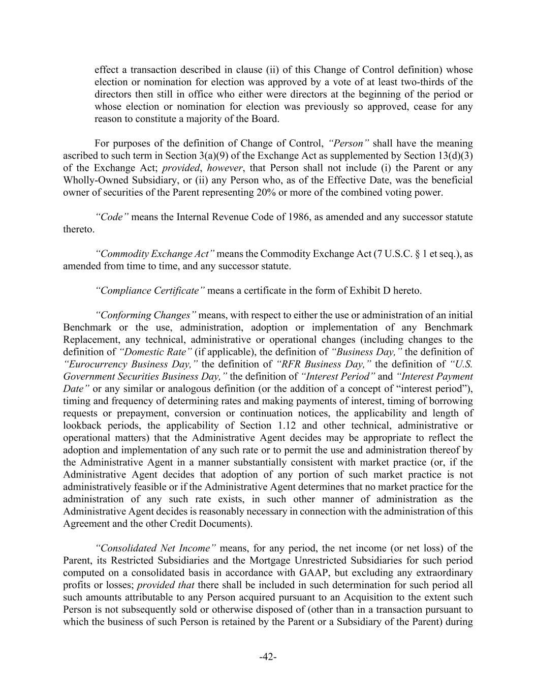 -42- effect a transaction described in clause (ii) of this Change of Control definition) whose election or nomination for election was approved by a vote of at least two-thirds of the directors then still in office who either were directors at the beginning of the period or whose election or nomination for election was previously so approved, cease for any reason to constitute a majority of the Board. For purposes of the definition of Change of Control, “Person” shall have the meaning ascribed to such term in Section 3(a)(9) of the Exchange Act as supplemented by Section 13(d)(3) of the Exchange Act; provided, however, that Person shall not include (i) the Parent or any Wholly-Owned Subsidiary, or (ii) any Person who, as of the Effective Date, was the beneficial owner of securities of the Parent representing 20% or more of the combined voting power. “Code” means the Internal Revenue Code of 1986, as amended and any successor statute thereto. “Commodity Exchange Act” means the Commodity Exchange Act (7 U.S.C. § 1 et seq.), as amended from time to time, and any successor statute. “Compliance Certificate” means a certificate in the form of Exhibit D hereto. “Conforming Changes” means, with respect to either the use or administration of an initial Benchmark or the use, administration, adoption or implementation of any Benchmark Replacement, any technical, administrative or operational changes (including changes to the definition of “Domestic Rate” (if applicable), the definition of “Business Day,” the definition of “Eurocurrency Business Day,” the definition of “RFR Business Day,” the definition of “U.S. Government Securities Business Day,” the definition of “Interest Period” and “Interest Payment Date” or any similar or analogous definition (or the addition of a concept of “interest period”), timing and frequency of determining rates and making payments of interest, timing of borrowing requests or prepayment, conversion or continuation notices, the applicability and length of lookback periods, the applicability of Section 1.12 and other technical, administrative or operational matters) that the Administrative Agent decides may be appropriate to reflect the adoption and implementation of any such rate or to permit the use and administration thereof by the Administrative Agent in a manner substantially consistent with market practice (or, if the Administrative Agent decides that adoption of any portion of such market practice is not administratively feasible or if the Administrative Agent determines that no market practice for the administration of any such rate exists, in such other manner of administration as the Administrative Agent decides is reasonably necessary in connection with the administration of this Agreement and the other Credit Documents). “Consolidated Net Income” means, for any period, the net income (or net loss) of the Parent, its Restricted Subsidiaries and the Mortgage Unrestricted Subsidiaries for such period computed on a consolidated basis in accordance with GAAP, but excluding any extraordinary profits or losses; provided that there shall be included in such determination for such period all such amounts attributable to any Person acquired pursuant to an Acquisition to the extent such Person is not subsequently sold or otherwise disposed of (other than in a transaction pursuant to which the business of such Person is retained by the Parent or a Subsidiary of the Parent) during