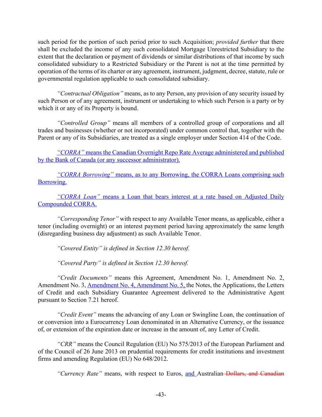 -43- such period for the portion of such period prior to such Acquisition; provided further that there shall be excluded the income of any such consolidated Mortgage Unrestricted Subsidiary to the extent that the declaration or payment of dividends or similar distributions of that income by such consolidated subsidiary to a Restricted Subsidiary or the Parent is not at the time permitted by operation of the terms of its charter or any agreement, instrument, judgment, decree, statute, rule or governmental regulation applicable to such consolidated subsidiary. “Contractual Obligation” means, as to any Person, any provision of any security issued by such Person or of any agreement, instrument or undertaking to which such Person is a party or by which it or any of its Property is bound. “Controlled Group” means all members of a controlled group of corporations and all trades and businesses (whether or not incorporated) under common control that, together with the Parent or any of its Subsidiaries, are treated as a single employer under Section 414 of the Code. “CORRA” means the Canadian Overnight Repo Rate Average administered and published by the Bank of Canada (or any successor administrator). “CORRA Borrowing” means, as to any Borrowing, the CORRA Loans comprising such Borrowing. “CORRA Loan” means a Loan that bears interest at a rate based on Adjusted Daily Compounded CORRA. “Corresponding Tenor” with respect to any Available Tenor means, as applicable, either a tenor (including overnight) or an interest payment period having approximately the same length (disregarding business day adjustment) as such Available Tenor. “Covered Entity” is defined in Section 12.30 hereof. “Covered Party” is defined in Section 12.30 hereof. “Credit Documents” means this Agreement, Amendment No. 1, Amendment No. 2, Amendment No. 3, Amendment No. 4, Amendment No. 5, the Notes, the Applications, the Letters of Credit and each Subsidiary Guarantee Agreement delivered to the Administrative Agent pursuant to Section 7.21 hereof. “Credit Event” means the advancing of any Loan or Swingline Loan, the continuation of or conversion into a Eurocurrency Loan denominated in an Alternative Currency, or the issuance of, or extension of the expiration date or increase in the amount of, any Letter of Credit. “CRR” means the Council Regulation (EU) No 575/2013 of the European Parliament and of the Council of 26 June 2013 on prudential requirements for credit institutions and investment firms and amending Regulation (EU) No 648/2012. “Currency Rate” means, with respect to Euros, and Australian Dollars, and Canadian