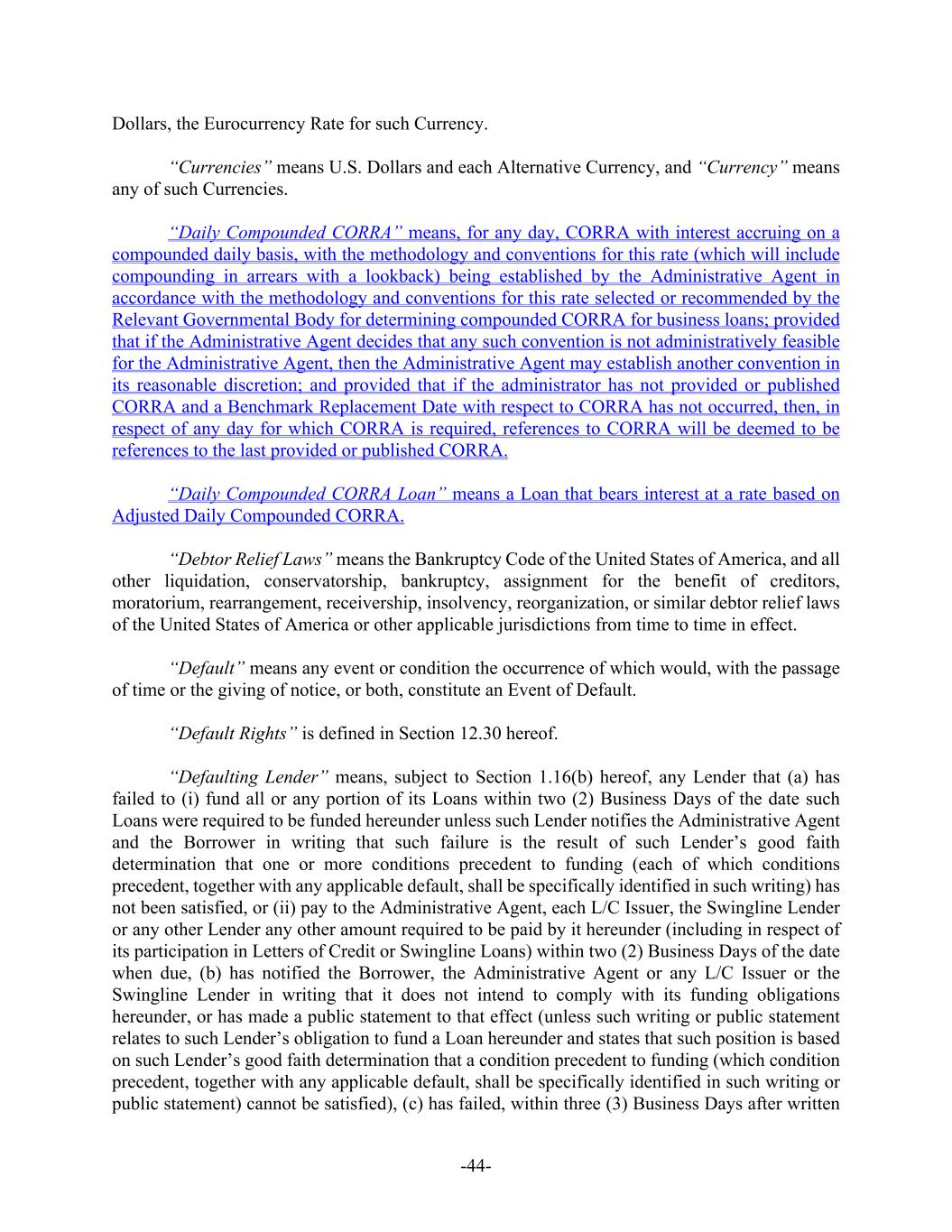-44- Dollars, the Eurocurrency Rate for such Currency. “Currencies” means U.S. Dollars and each Alternative Currency, and “Currency” means any of such Currencies. “Daily Compounded CORRA” means, for any day, CORRA with interest accruing on a compounded daily basis, with the methodology and conventions for this rate (which will include compounding in arrears with a lookback) being established by the Administrative Agent in accordance with the methodology and conventions for this rate selected or recommended by the Relevant Governmental Body for determining compounded CORRA for business loans; provided that if the Administrative Agent decides that any such convention is not administratively feasible for the Administrative Agent, then the Administrative Agent may establish another convention in its reasonable discretion; and provided that if the administrator has not provided or published CORRA and a Benchmark Replacement Date with respect to CORRA has not occurred, then, in respect of any day for which CORRA is required, references to CORRA will be deemed to be references to the last provided or published CORRA. “Daily Compounded CORRA Loan” means a Loan that bears interest at a rate based on Adjusted Daily Compounded CORRA. “Debtor Relief Laws” means the Bankruptcy Code of the United States of America, and all other liquidation, conservatorship, bankruptcy, assignment for the benefit of creditors, moratorium, rearrangement, receivership, insolvency, reorganization, or similar debtor relief laws of the United States of America or other applicable jurisdictions from time to time in effect. “Default” means any event or condition the occurrence of which would, with the passage of time or the giving of notice, or both, constitute an Event of Default. “Default Rights” is defined in Section 12.30 hereof. “Defaulting Lender” means, subject to Section 1.16(b) hereof, any Lender that (a) has failed to (i) fund all or any portion of its Loans within two (2) Business Days of the date such Loans were required to be funded hereunder unless such Lender notifies the Administrative Agent and the Borrower in writing that such failure is the result of such Lender’s good faith determination that one or more conditions precedent to funding (each of which conditions precedent, together with any applicable default, shall be specifically identified in such writing) has not been satisfied, or (ii) pay to the Administrative Agent, each L/C Issuer, the Swingline Lender or any other Lender any other amount required to be paid by it hereunder (including in respect of its participation in Letters of Credit or Swingline Loans) within two (2) Business Days of the date when due, (b) has notified the Borrower, the Administrative Agent or any L/C Issuer or the Swingline Lender in writing that it does not intend to comply with its funding obligations hereunder, or has made a public statement to that effect (unless such writing or public statement relates to such Lender’s obligation to fund a Loan hereunder and states that such position is based on such Lender’s good faith determination that a condition precedent to funding (which condition precedent, together with any applicable default, shall be specifically identified in such writing or public statement) cannot be satisfied), (c) has failed, within three (3) Business Days after written