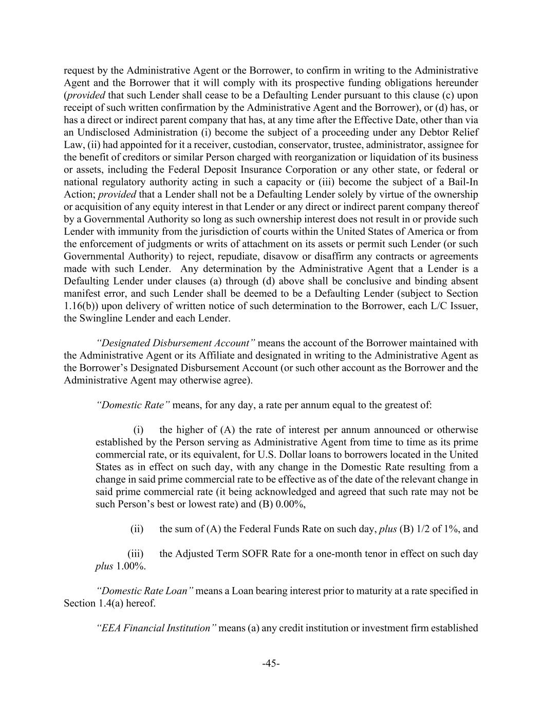 -45- request by the Administrative Agent or the Borrower, to confirm in writing to the Administrative Agent and the Borrower that it will comply with its prospective funding obligations hereunder (provided that such Lender shall cease to be a Defaulting Lender pursuant to this clause (c) upon receipt of such written confirmation by the Administrative Agent and the Borrower), or (d) has, or has a direct or indirect parent company that has, at any time after the Effective Date, other than via an Undisclosed Administration (i) become the subject of a proceeding under any Debtor Relief Law, (ii) had appointed for it a receiver, custodian, conservator, trustee, administrator, assignee for the benefit of creditors or similar Person charged with reorganization or liquidation of its business or assets, including the Federal Deposit Insurance Corporation or any other state, or federal or national regulatory authority acting in such a capacity or (iii) become the subject of a Bail-In Action; provided that a Lender shall not be a Defaulting Lender solely by virtue of the ownership or acquisition of any equity interest in that Lender or any direct or indirect parent company thereof by a Governmental Authority so long as such ownership interest does not result in or provide such Lender with immunity from the jurisdiction of courts within the United States of America or from the enforcement of judgments or writs of attachment on its assets or permit such Lender (or such Governmental Authority) to reject, repudiate, disavow or disaffirm any contracts or agreements made with such Lender. Any determination by the Administrative Agent that a Lender is a Defaulting Lender under clauses (a) through (d) above shall be conclusive and binding absent manifest error, and such Lender shall be deemed to be a Defaulting Lender (subject to Section 1.16(b)) upon delivery of written notice of such determination to the Borrower, each L/C Issuer, the Swingline Lender and each Lender. “Designated Disbursement Account” means the account of the Borrower maintained with the Administrative Agent or its Affiliate and designated in writing to the Administrative Agent as the Borrower’s Designated Disbursement Account (or such other account as the Borrower and the Administrative Agent may otherwise agree). “Domestic Rate” means, for any day, a rate per annum equal to the greatest of: (i) the higher of (A) the rate of interest per annum announced or otherwise established by the Person serving as Administrative Agent from time to time as its prime commercial rate, or its equivalent, for U.S. Dollar loans to borrowers located in the United States as in effect on such day, with any change in the Domestic Rate resulting from a change in said prime commercial rate to be effective as of the date of the relevant change in said prime commercial rate (it being acknowledged and agreed that such rate may not be such Person’s best or lowest rate) and (B) 0.00%, (ii) the sum of (A) the Federal Funds Rate on such day, plus (B) 1/2 of 1%, and (iii) the Adjusted Term SOFR Rate for a one-month tenor in effect on such day plus 1.00%. “Domestic Rate Loan” means a Loan bearing interest prior to maturity at a rate specified in Section 1.4(a) hereof. “EEA Financial Institution” means (a) any credit institution or investment firm established