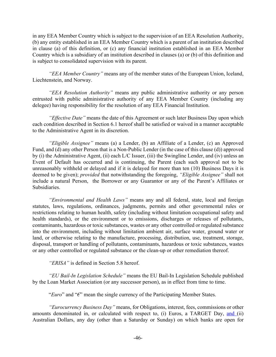 -46- in any EEA Member Country which is subject to the supervision of an EEA Resolution Authority, (b) any entity established in an EEA Member Country which is a parent of an institution described in clause (a) of this definition, or (c) any financial institution established in an EEA Member Country which is a subsidiary of an institution described in clauses (a) or (b) of this definition and is subject to consolidated supervision with its parent. “EEA Member Country” means any of the member states of the European Union, Iceland, Liechtenstein, and Norway. “EEA Resolution Authority” means any public administrative authority or any person entrusted with public administrative authority of any EEA Member Country (including any delegee) having responsibility for the resolution of any EEA Financial Institution. “Effective Date” means the date of this Agreement or such later Business Day upon which each condition described in Section 6.1 hereof shall be satisfied or waived in a manner acceptable to the Administrative Agent in its discretion. “Eligible Assignee” means (a) a Lender, (b) an Affiliate of a Lender, (c) an Approved Fund, and (d) any other Person that is a Non-Public Lender (in the case of this clause (d)) approved by (i) the Administrative Agent, (ii) each L/C Issuer, (iii) the Swingline Lender, and (iv) unless an Event of Default has occurred and is continuing, the Parent (each such approval not to be unreasonably withheld or delayed and if it is delayed for more than ten (10) Business Days it is deemed to be given); provided that notwithstanding the foregoing, “Eligible Assignee” shall not include a natural Person, the Borrower or any Guarantor or any of the Parent’s Affiliates or Subsidiaries. “Environmental and Health Laws” means any and all federal, state, local and foreign statutes, laws, regulations, ordinances, judgments, permits and other governmental rules or restrictions relating to human health, safety (including without limitation occupational safety and health standards), or the environment or to emissions, discharges or releases of pollutants, contaminants, hazardous or toxic substances, wastes or any other controlled or regulated substance into the environment, including without limitation ambient air, surface water, ground water or land, or otherwise relating to the manufacture, processing, distribution, use, treatment, storage, disposal, transport or handling of pollutants, contaminants, hazardous or toxic substances, wastes or any other controlled or regulated substance or the clean-up or other remediation thereof. “ERISA” is defined in Section 5.8 hereof. “EU Bail-In Legislation Schedule” means the EU Bail-In Legislation Schedule published by the Loan Market Association (or any successor person), as in effect from time to time. “Euro” and “€” mean the single currency of the Participating Member States. “Eurocurrency Business Day” means, for Obligations, interest, fees, commissions or other amounts denominated in, or calculated with respect to, (i) Euros, a TARGET Day, and (ii) Australian Dollars, any day (other than a Saturday or Sunday) on which banks are open for