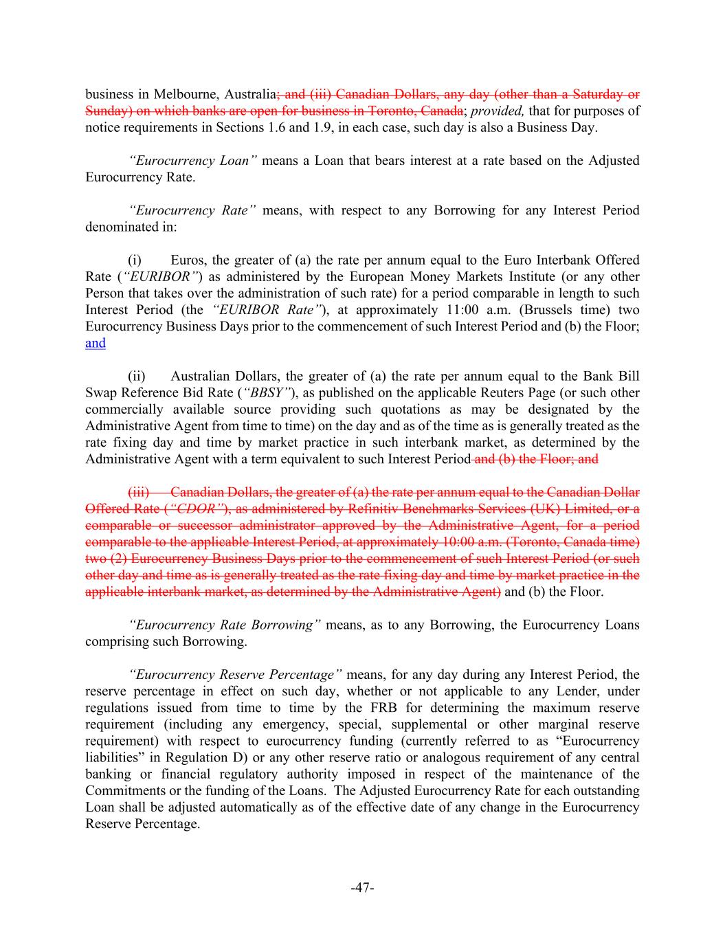 -47- business in Melbourne, Australia; and (iii) Canadian Dollars, any day (other than a Saturday or Sunday) on which banks are open for business in Toronto, Canada; provided, that for purposes of notice requirements in Sections 1.6 and 1.9, in each case, such day is also a Business Day. “Eurocurrency Loan” means a Loan that bears interest at a rate based on the Adjusted Eurocurrency Rate. “Eurocurrency Rate” means, with respect to any Borrowing for any Interest Period denominated in: (i) Euros, the greater of (a) the rate per annum equal to the Euro Interbank Offered Rate (“EURIBOR”) as administered by the European Money Markets Institute (or any other Person that takes over the administration of such rate) for a period comparable in length to such Interest Period (the “EURIBOR Rate”), at approximately 11:00 a.m. (Brussels time) two Eurocurrency Business Days prior to the commencement of such Interest Period and (b) the Floor; and (ii) Australian Dollars, the greater of (a) the rate per annum equal to the Bank Bill Swap Reference Bid Rate (“BBSY”), as published on the applicable Reuters Page (or such other commercially available source providing such quotations as may be designated by the Administrative Agent from time to time) on the day and as of the time as is generally treated as the rate fixing day and time by market practice in such interbank market, as determined by the Administrative Agent with a term equivalent to such Interest Period and (b) the Floor; and (iii) Canadian Dollars, the greater of (a) the rate per annum equal to the Canadian Dollar Offered Rate (“CDOR”), as administered by Refinitiv Benchmarks Services (UK) Limited, or a comparable or successor administrator approved by the Administrative Agent, for a period comparable to the applicable Interest Period, at approximately 10:00 a.m. (Toronto, Canada time) two (2) Eurocurrency Business Days prior to the commencement of such Interest Period (or such other day and time as is generally treated as the rate fixing day and time by market practice in the applicable interbank market, as determined by the Administrative Agent) and (b) the Floor. “Eurocurrency Rate Borrowing” means, as to any Borrowing, the Eurocurrency Loans comprising such Borrowing. “Eurocurrency Reserve Percentage” means, for any day during any Interest Period, the reserve percentage in effect on such day, whether or not applicable to any Lender, under regulations issued from time to time by the FRB for determining the maximum reserve requirement (including any emergency, special, supplemental or other marginal reserve requirement) with respect to eurocurrency funding (currently referred to as “Eurocurrency liabilities” in Regulation D) or any other reserve ratio or analogous requirement of any central banking or financial regulatory authority imposed in respect of the maintenance of the Commitments or the funding of the Loans. The Adjusted Eurocurrency Rate for each outstanding Loan shall be adjusted automatically as of the effective date of any change in the Eurocurrency Reserve Percentage.