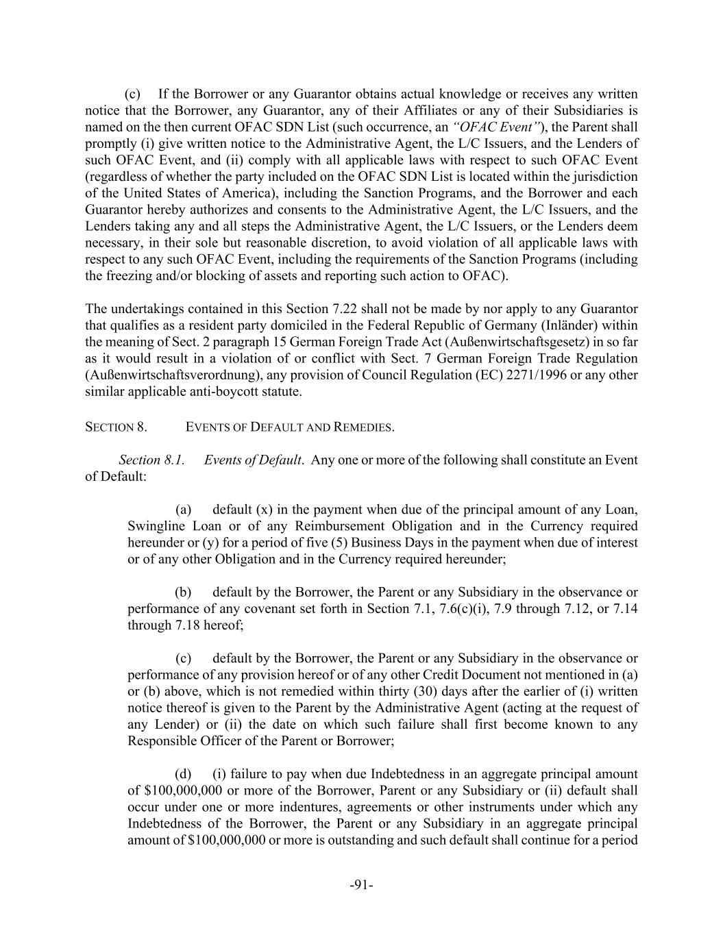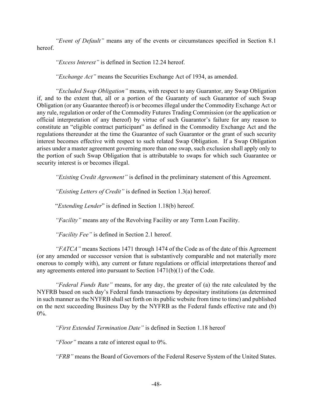 -48- “Event of Default” means any of the events or circumstances specified in Section 8.1 hereof. “Excess Interest” is defined in Section 12.24 hereof. “Exchange Act” means the Securities Exchange Act of 1934, as amended. “Excluded Swap Obligation” means, with respect to any Guarantor, any Swap Obligation if, and to the extent that, all or a portion of the Guaranty of such Guarantor of such Swap Obligation (or any Guarantee thereof) is or becomes illegal under the Commodity Exchange Act or any rule, regulation or order of the Commodity Futures Trading Commission (or the application or official interpretation of any thereof) by virtue of such Guarantor’s failure for any reason to constitute an “eligible contract participant” as defined in the Commodity Exchange Act and the regulations thereunder at the time the Guarantee of such Guarantor or the grant of such security interest becomes effective with respect to such related Swap Obligation. If a Swap Obligation arises under a master agreement governing more than one swap, such exclusion shall apply only to the portion of such Swap Obligation that is attributable to swaps for which such Guarantee or security interest is or becomes illegal. “Existing Credit Agreement” is defined in the preliminary statement of this Agreement. “Existing Letters of Credit” is defined in Section 1.3(a) hereof. “Extending Lender” is defined in Section 1.18(b) hereof. “Facility” means any of the Revolving Facility or any Term Loan Facility. “Facility Fee” is defined in Section 2.1 hereof. “FATCA” means Sections 1471 through 1474 of the Code as of the date of this Agreement (or any amended or successor version that is substantively comparable and not materially more onerous to comply with), any current or future regulations or official interpretations thereof and any agreements entered into pursuant to Section 1471(b)(1) of the Code. “Federal Funds Rate” means, for any day, the greater of (a) the rate calculated by the NYFRB based on such day’s Federal funds transactions by depositary institutions (as determined in such manner as the NYFRB shall set forth on its public website from time to time) and published on the next succeeding Business Day by the NYFRB as the Federal funds effective rate and (b) 0%. “First Extended Termination Date” is defined in Section 1.18 hereof “Floor” means a rate of interest equal to 0%. “FRB” means the Board of Governors of the Federal Reserve System of the United States.