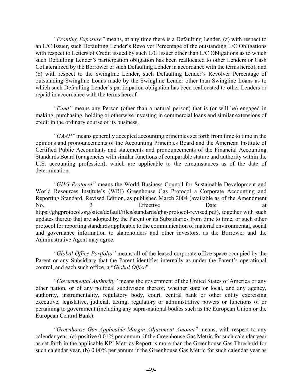 -49- “Fronting Exposure” means, at any time there is a Defaulting Lender, (a) with respect to an L/C Issuer, such Defaulting Lender’s Revolver Percentage of the outstanding L/C Obligations with respect to Letters of Credit issued by such L/C Issuer other than L/C Obligations as to which such Defaulting Lender’s participation obligation has been reallocated to other Lenders or Cash Collateralized by the Borrower or such Defaulting Lender in accordance with the terms hereof, and (b) with respect to the Swingline Lender, such Defaulting Lender’s Revolver Percentage of outstanding Swingline Loans made by the Swingline Lender other than Swingline Loans as to which such Defaulting Lender’s participation obligation has been reallocated to other Lenders or repaid in accordance with the terms hereof. “Fund” means any Person (other than a natural person) that is (or will be) engaged in making, purchasing, holding or otherwise investing in commercial loans and similar extensions of credit in the ordinary course of its business. “GAAP” means generally accepted accounting principles set forth from time to time in the opinions and pronouncements of the Accounting Principles Board and the American Institute of Certified Public Accountants and statements and pronouncements of the Financial Accounting Standards Board (or agencies with similar functions of comparable stature and authority within the U.S. accounting profession), which are applicable to the circumstances as of the date of determination. “GHG Protocol” means the World Business Council for Sustainable Development and World Resources Institute’s (WRI) Greenhouse Gas Protocol a Corporate Accounting and Reporting Standard, Revised Edition, as published March 2004 (available as of the Amendment No. 3 Effective Date at https://ghgprotocol.org/sites/default/files/standards/ghg-protocol-revised.pdf), together with such updates thereto that are adopted by the Parent or its Subsidiaries from time to time, or such other protocol for reporting standards applicable to the communication of material environmental, social and governance information to shareholders and other investors, as the Borrower and the Administrative Agent may agree. “Global Office Portfolio” means all of the leased corporate office space occupied by the Parent or any Subsidiary that the Parent identifies internally as under the Parent’s operational control, and each such office, a “Global Office”. “Governmental Authority” means the government of the United States of America or any other nation, or of any political subdivision thereof, whether state or local, and any agency, authority, instrumentality, regulatory body, court, central bank or other entity exercising executive, legislative, judicial, taxing, regulatory or administrative powers or functions of or pertaining to government (including any supra‑national bodies such as the European Union or the European Central Bank). “Greenhouse Gas Applicable Margin Adjustment Amount” means, with respect to any calendar year, (a) positive 0.01% per annum, if the Greenhouse Gas Metric for such calendar year as set forth in the applicable KPI Metrics Report is more than the Greenhouse Gas Threshold for such calendar year, (b) 0.00% per annum if the Greenhouse Gas Metric for such calendar year as